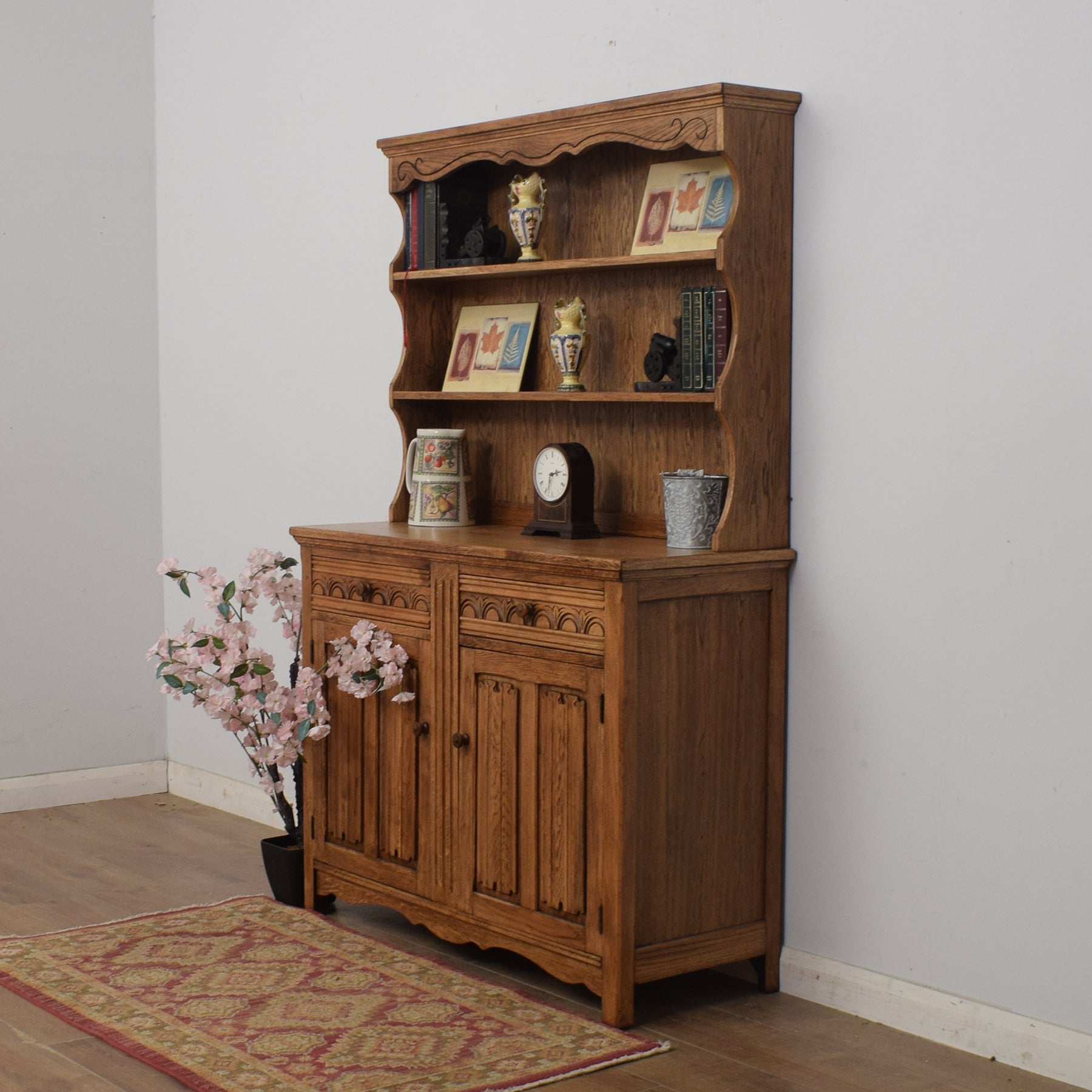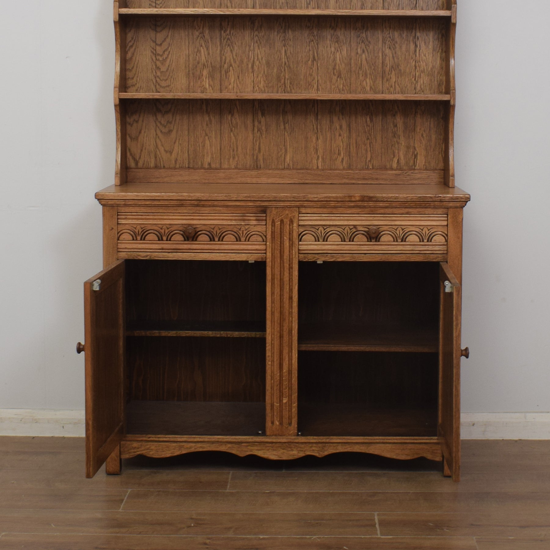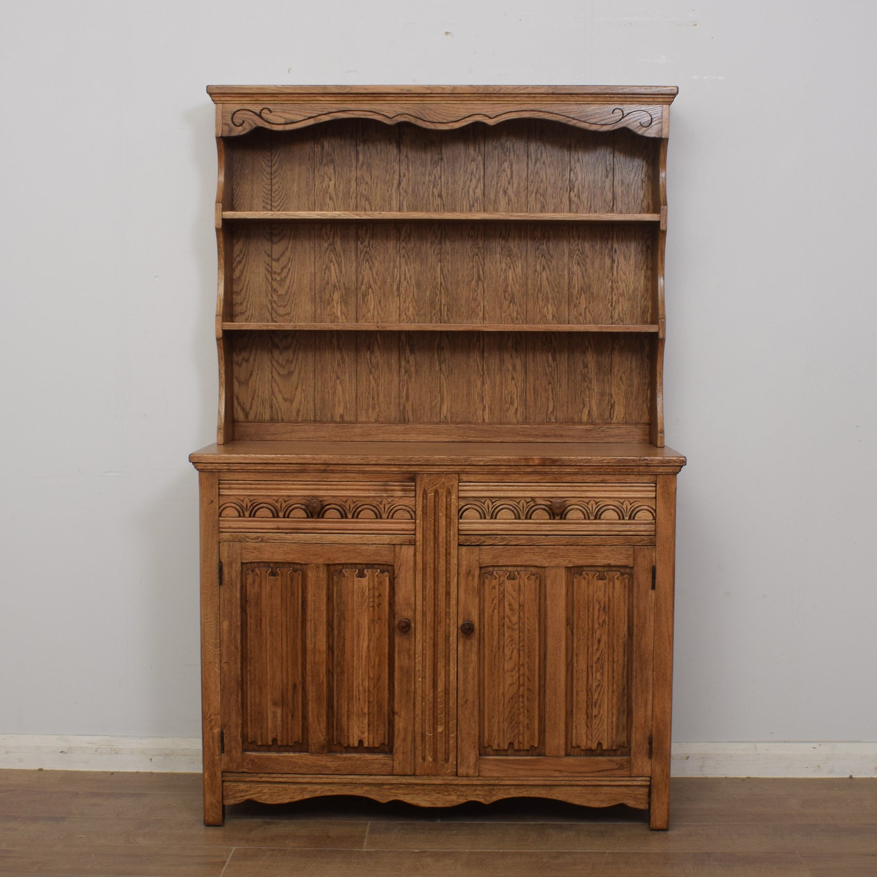 With its ample double cupboard, this splendid dresser offers plenty of storage space for dinner service, crockery and utensils or any other kitchen essentials. One of the drawers features divisions for items such as cutlery. The top offers a great space for displaying plates and ornaments, and the decorative linen-fold carvings on the cupboard doors further add to the appealing traditional style.