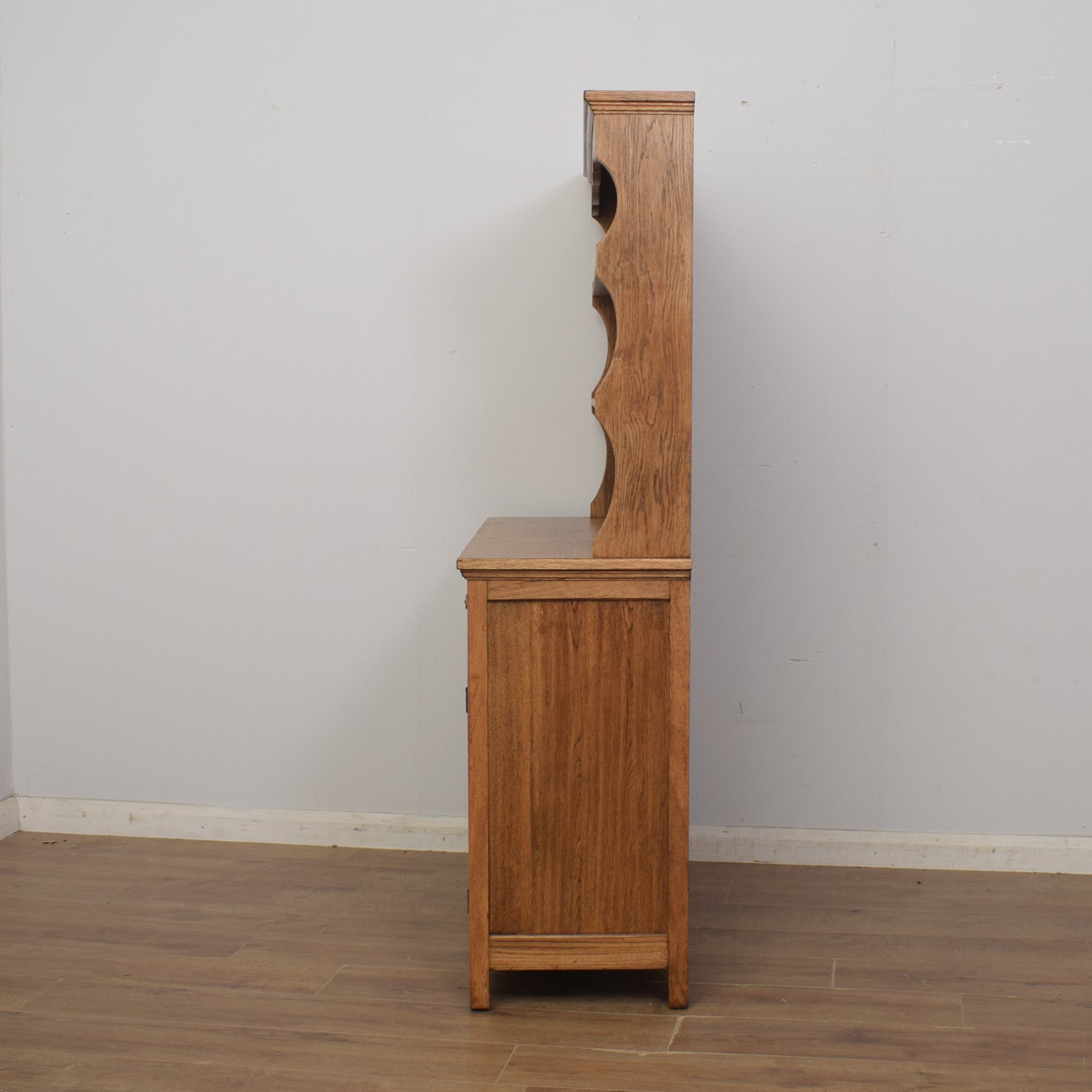 We have restored this charming oak dresser by stripping back the previous finish to reveal the rich tones of the oak grain, before applying a clear matt lacquer to give a hard-wearing and appealing finish. The dresser is constructed predominantly from solid oak and some veneer panels. The back of the base and the drawer bottoms are plywood.