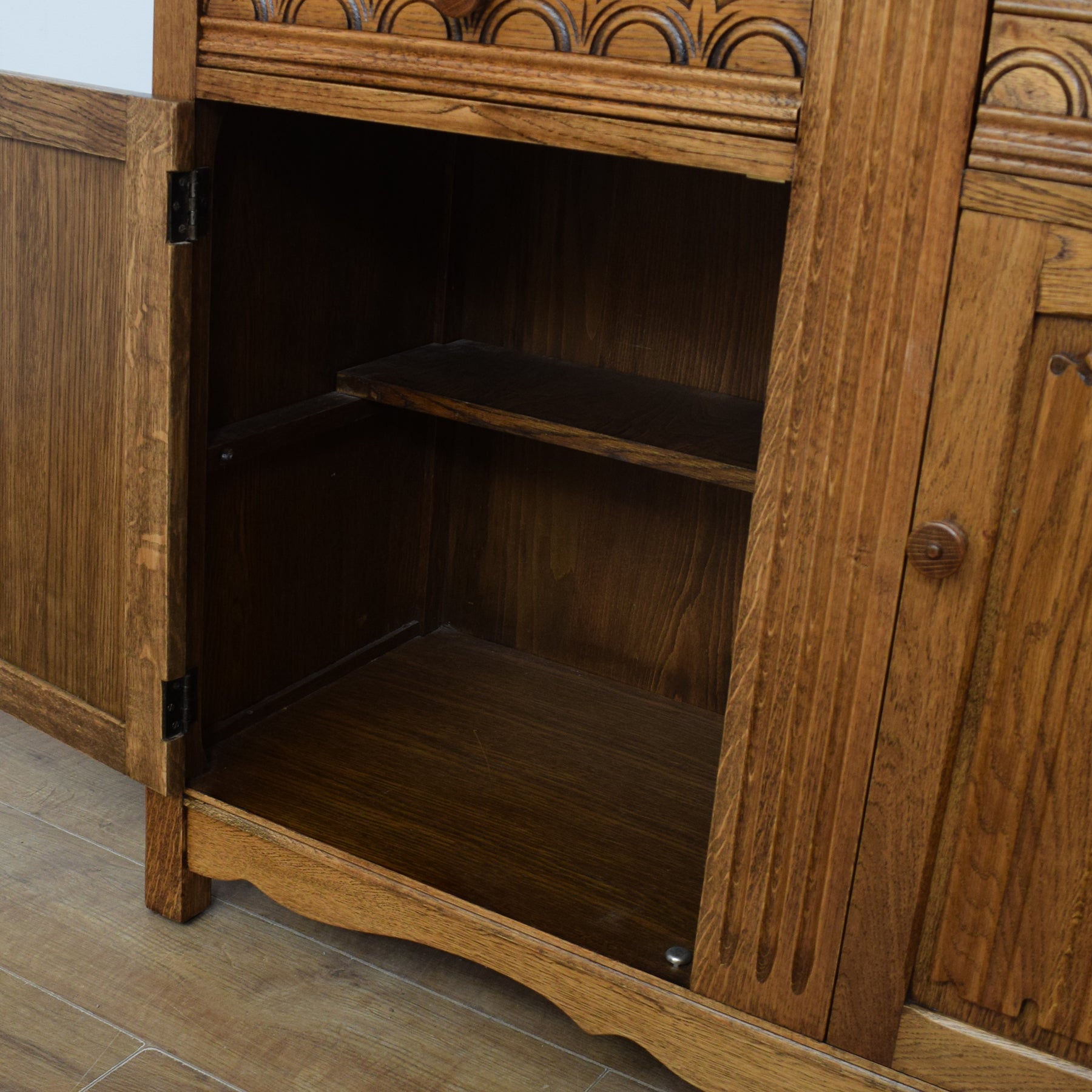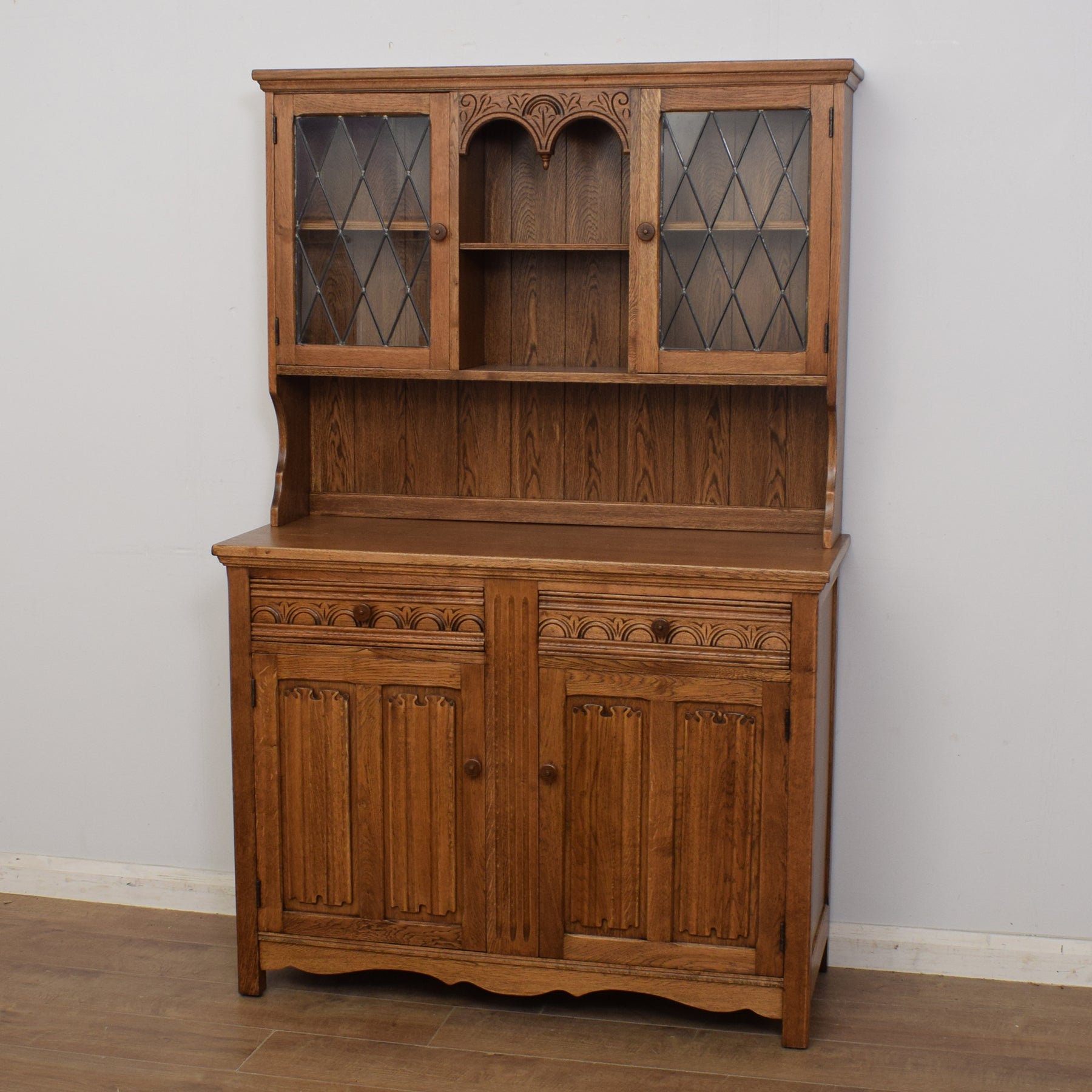 This oak dresser, featuring leaded glazing and classic linen-fold design door panels, is sure to be a practical and attractive addition to the dining room, lounge, or other family space.