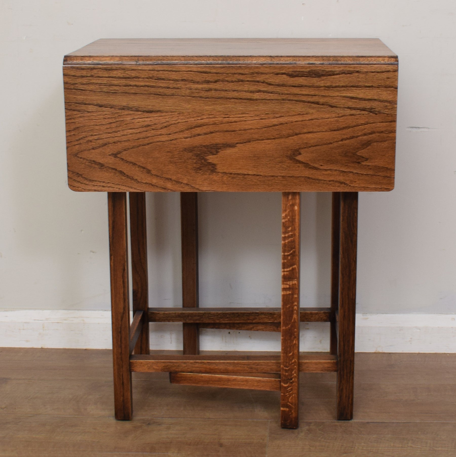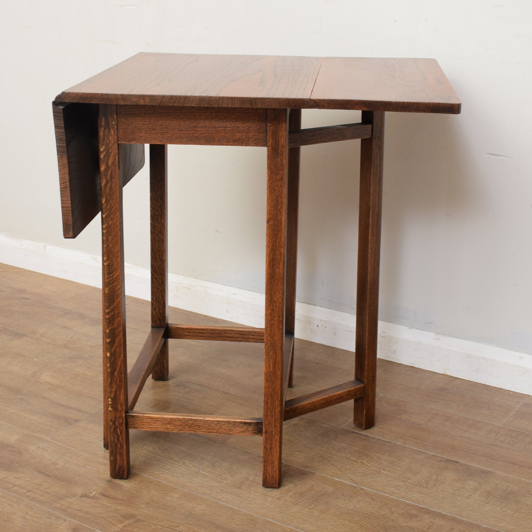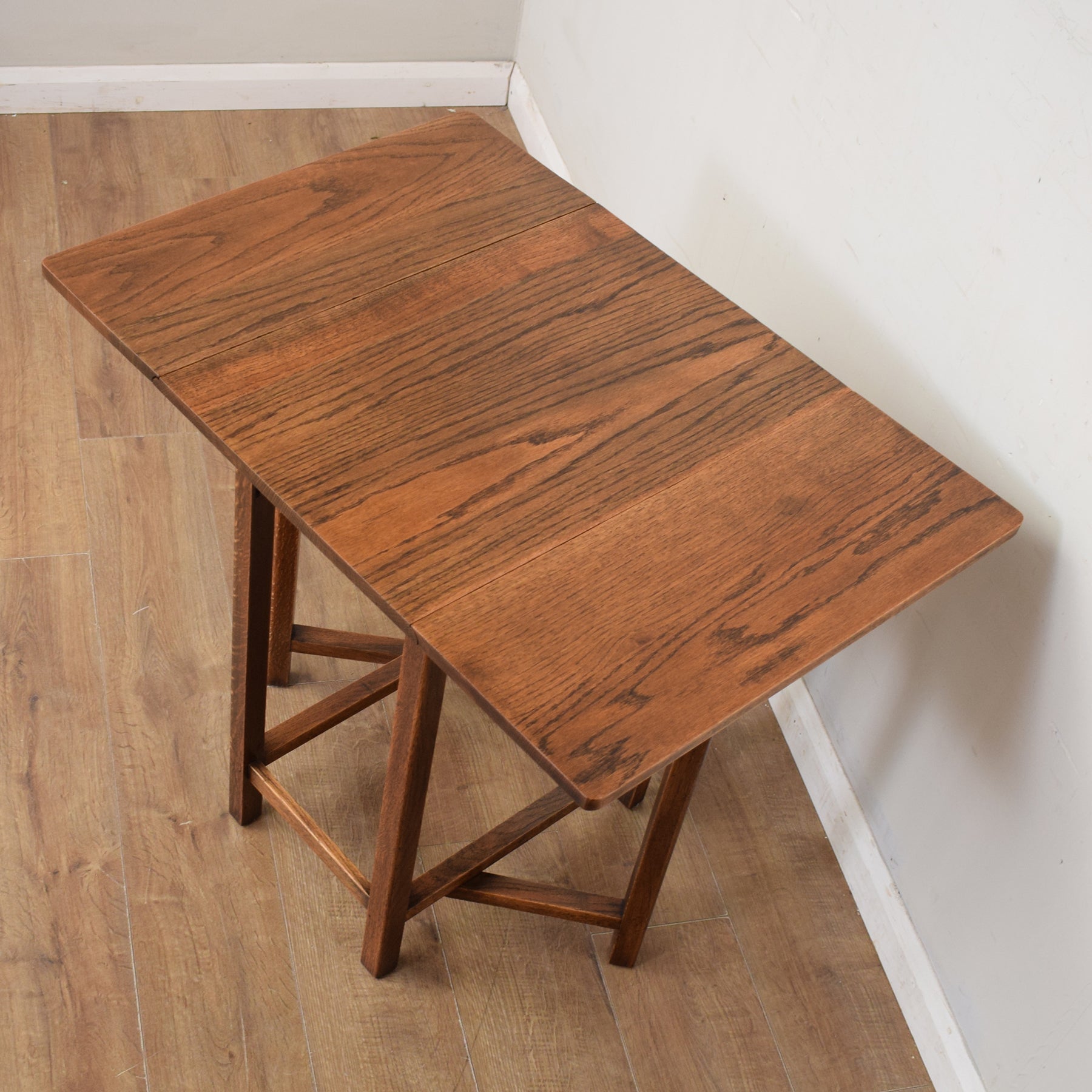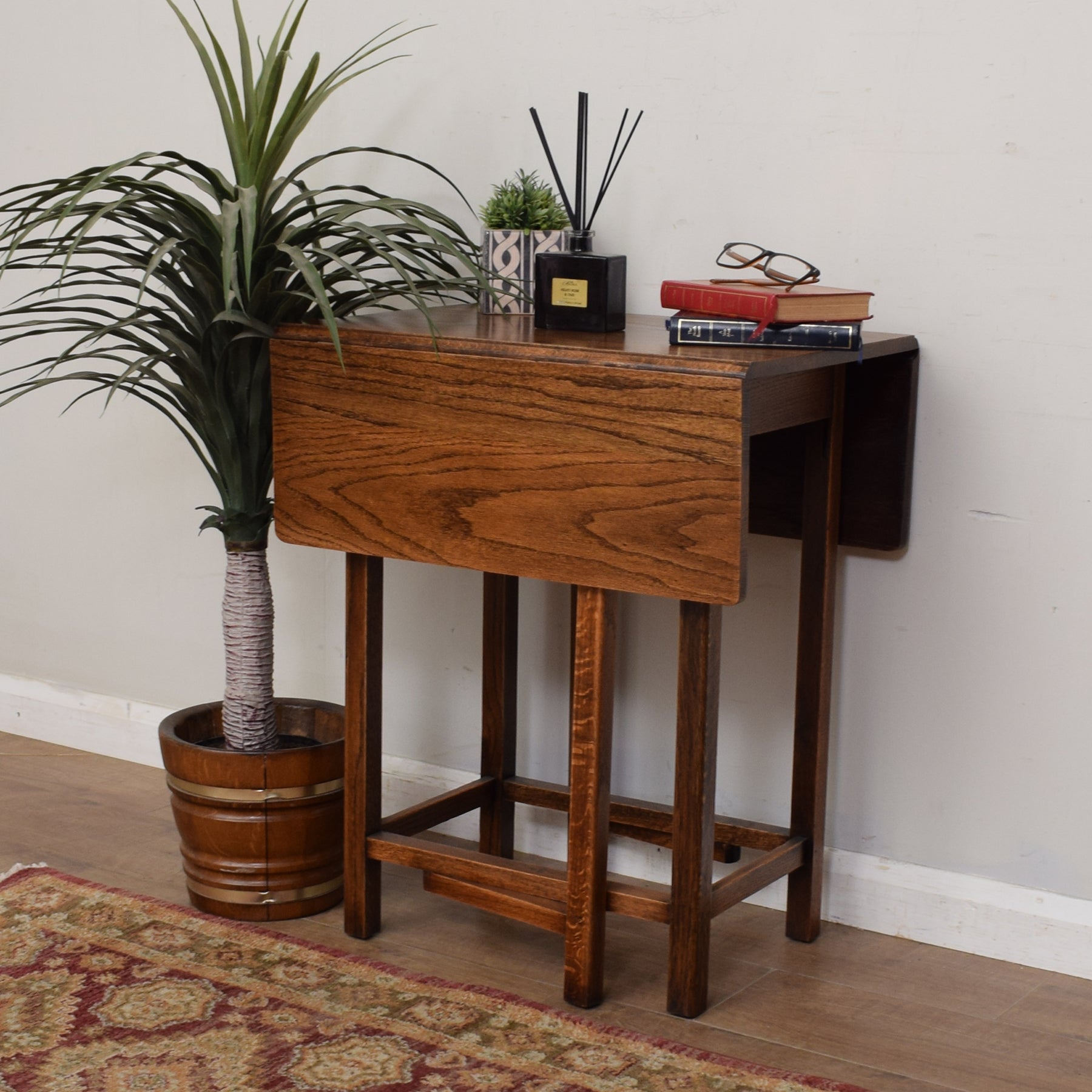 Also known as a "Gate Leg" table, there is a hinged leg on each side of the table that can be folded away, allowing the "leaf" above it to drop down, reducing the amount of space the table takes up. The oak top provides plenty of space for photos and ornaments.