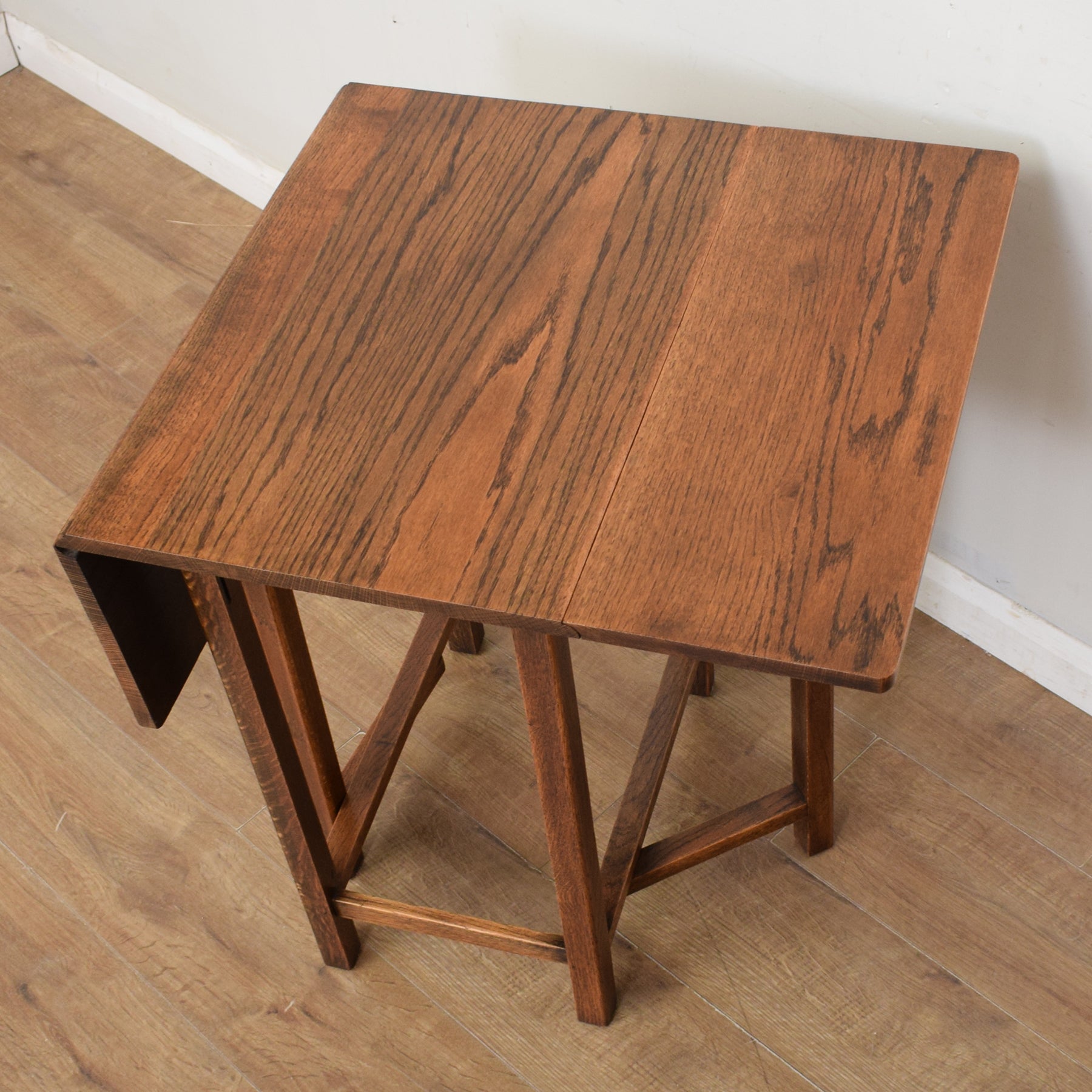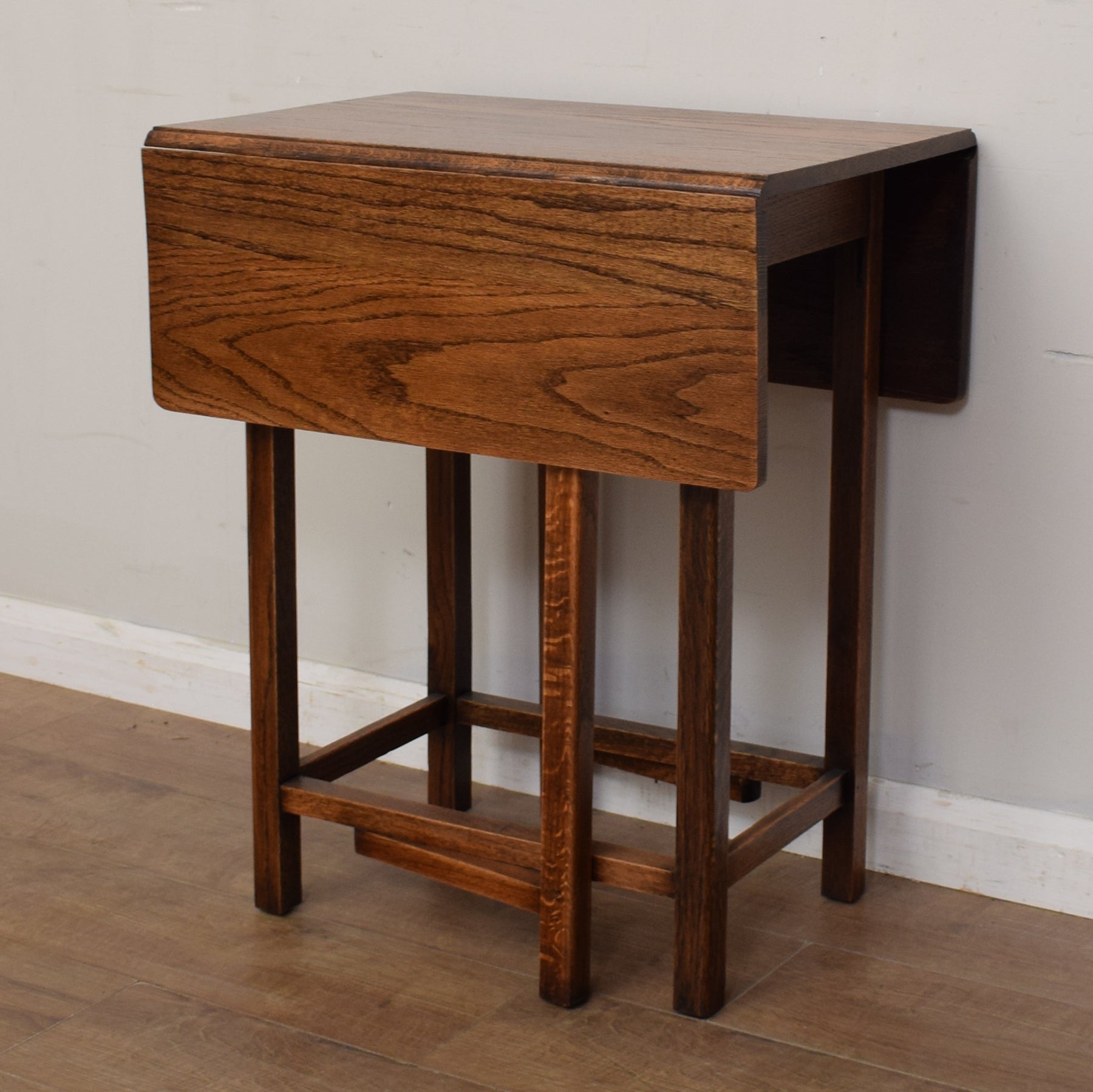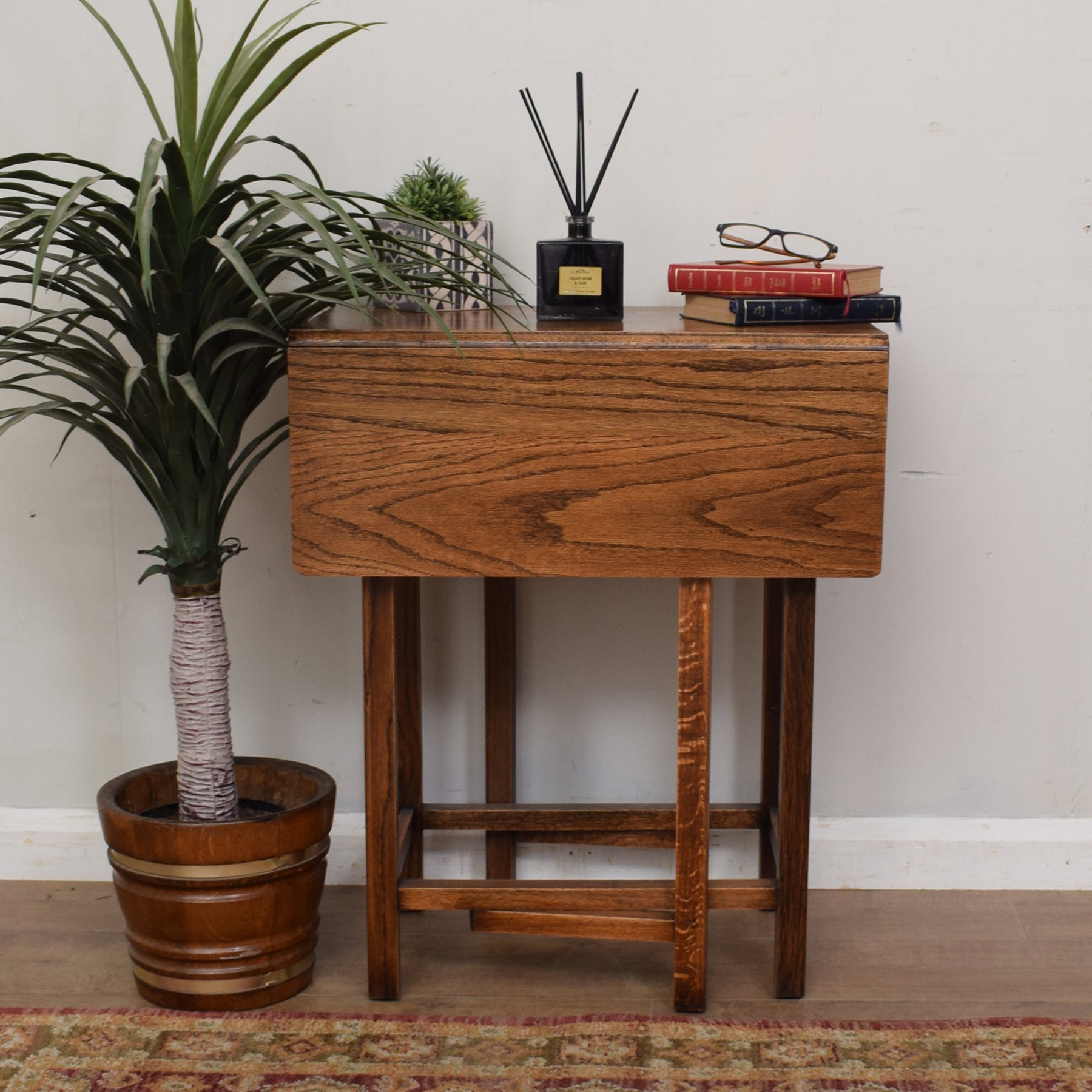 Also known as a "Gate Leg" table, there is a hinged leg on each side of the table that can be folded away, allowing the "leaf" above it to drop down, reducing the amount of space the table takes up. The oak top provides plenty of space for photos and ornaments.