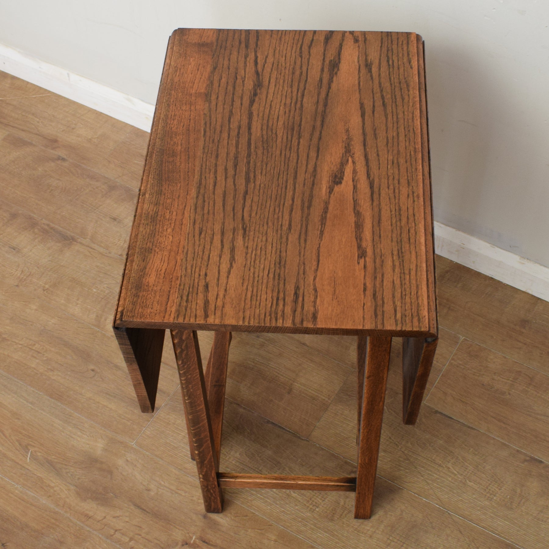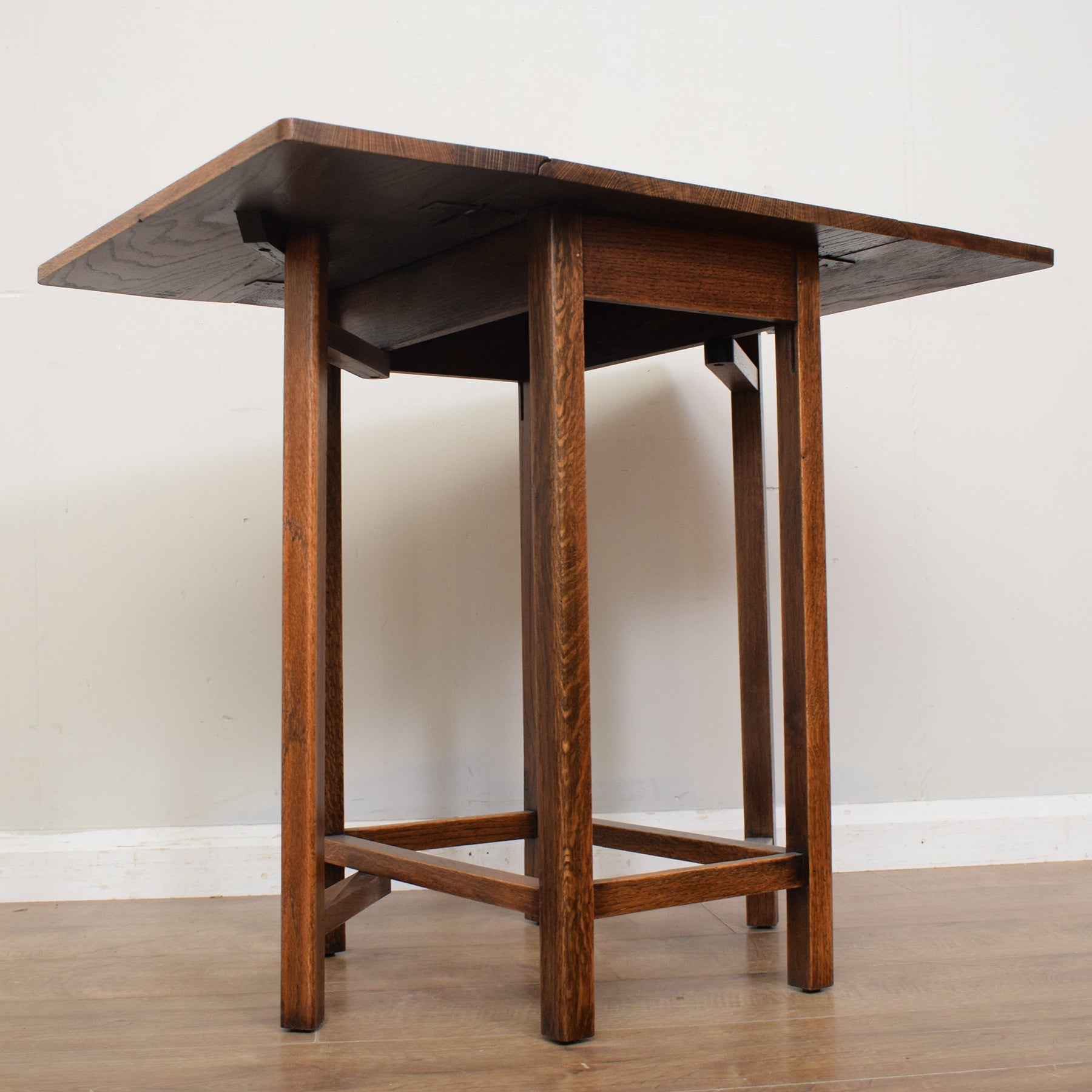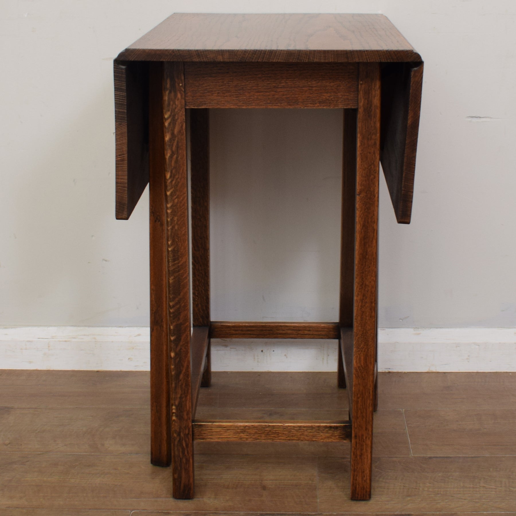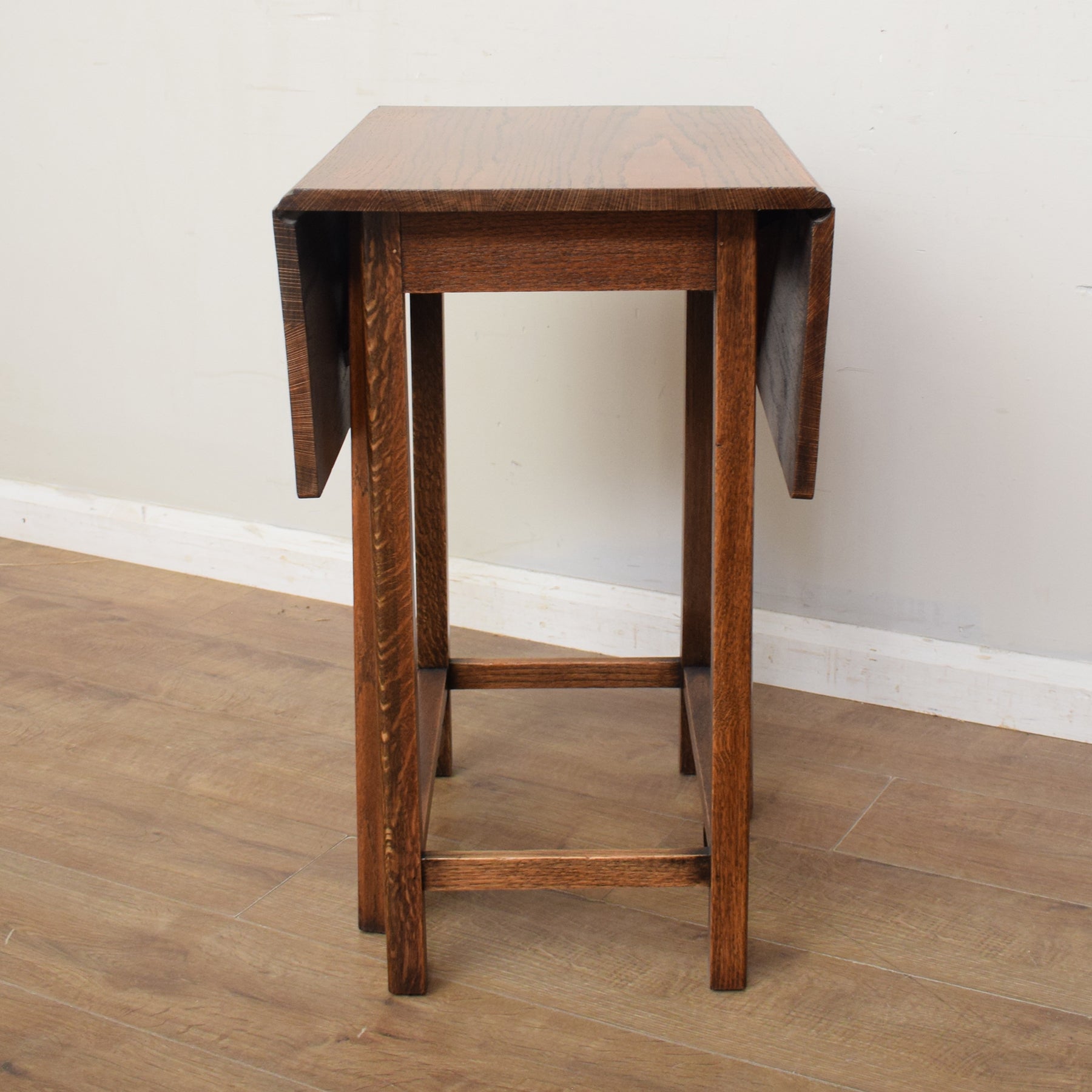 Also known as a "Gate Leg" table, there is a hinged leg on each side of the table that can be folded away, allowing the "leaf" above it to drop down, reducing the amount of space the table takes up. The oak top provides plenty of space for photos and ornaments.