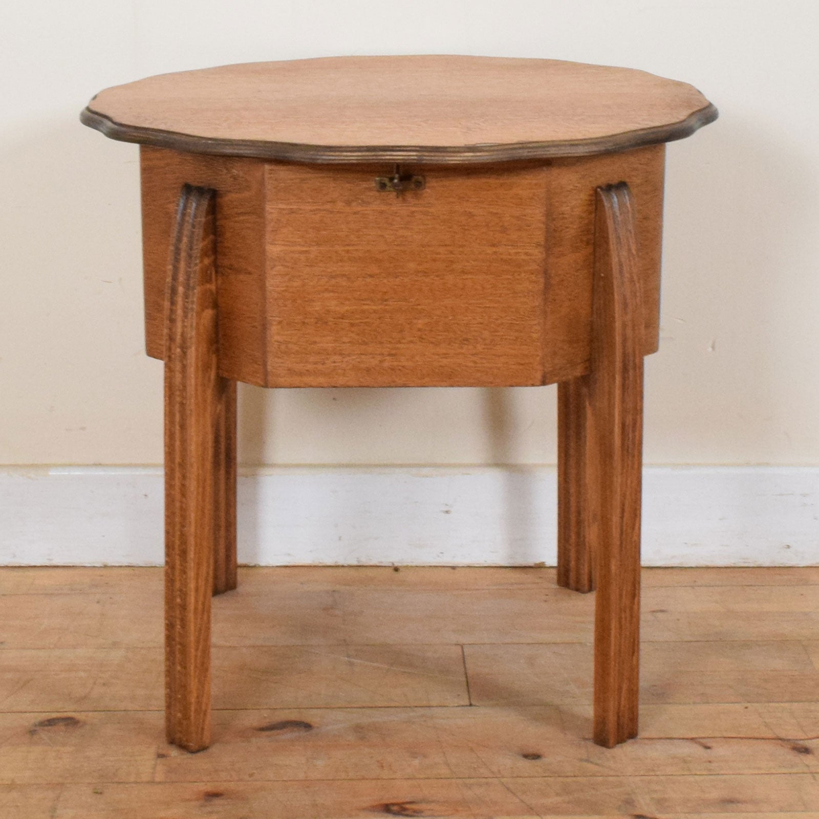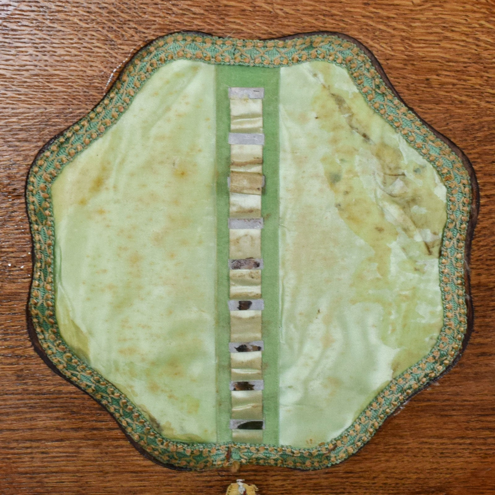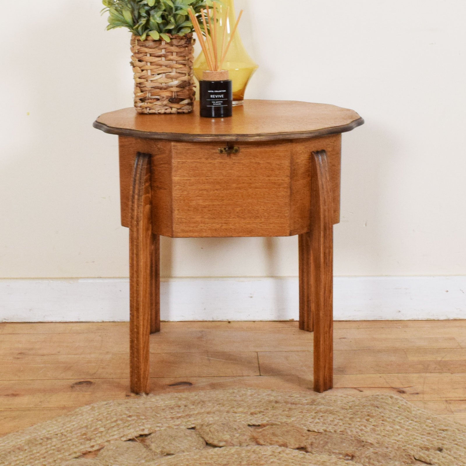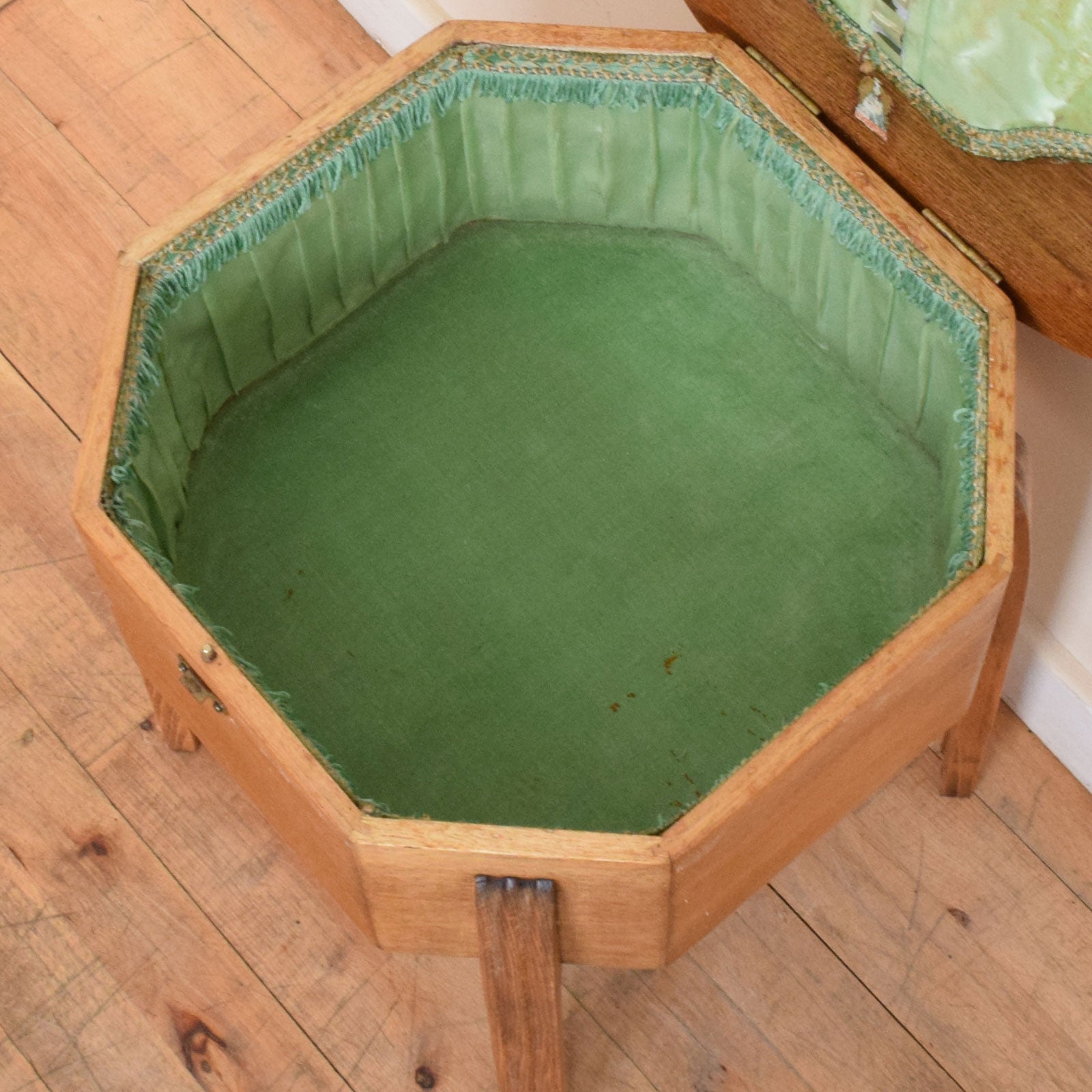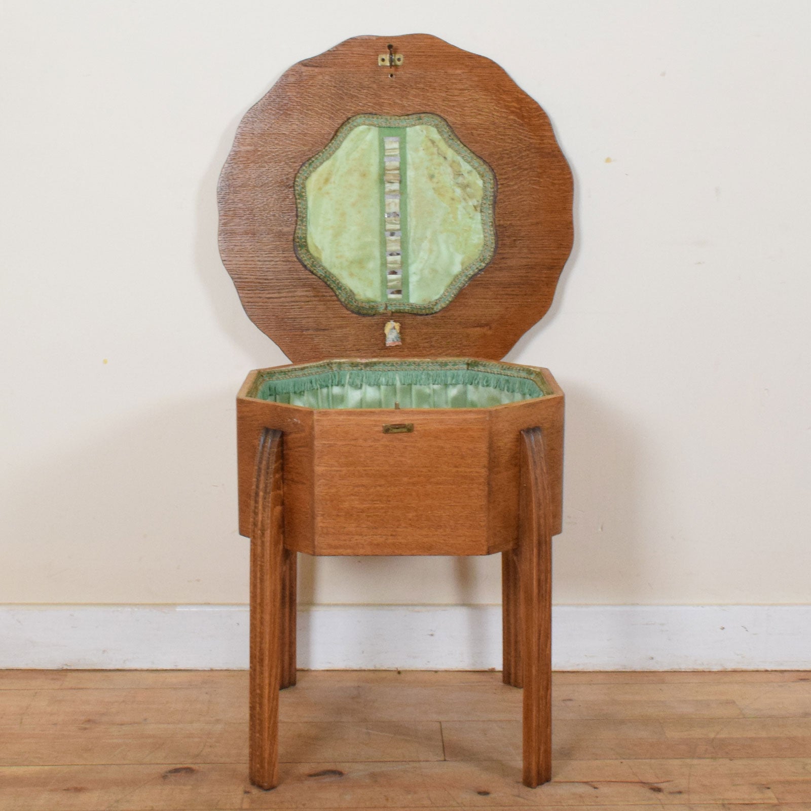 The Top surface could be used as a side table or a display stand when not in use, the lid opens with a catch at the front to reveal a space lined in the original green velvet material that would have kept sewing equipment safe and to hand if utilised for its original function. There is veneer damage and a watermark on the top surface and watermarks on the material inside that can be seen in the pictures.