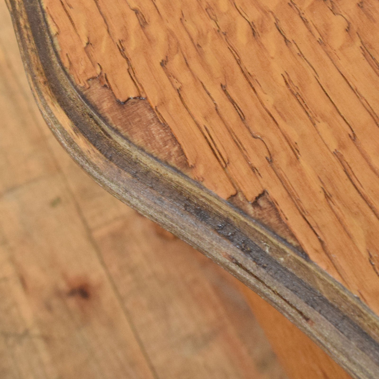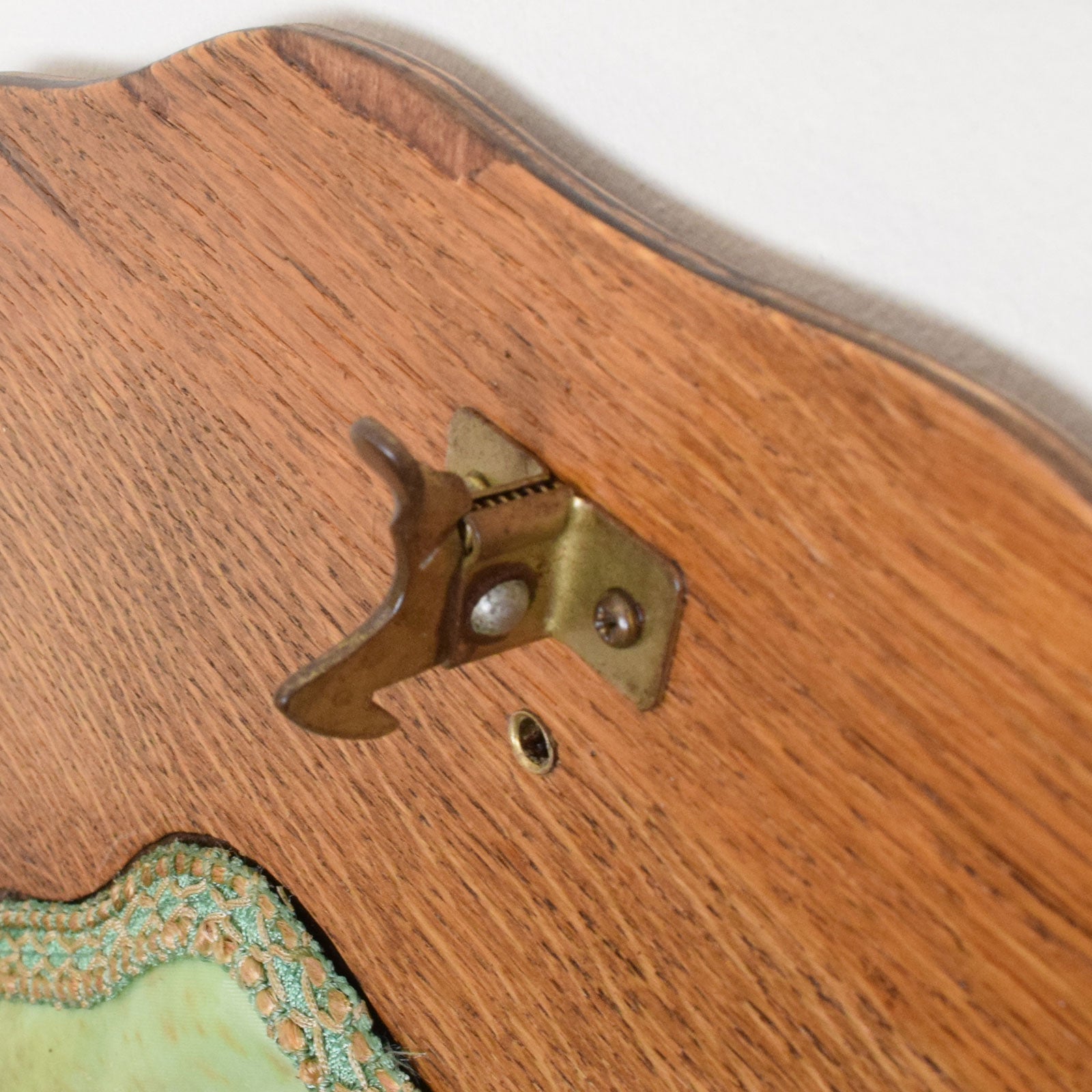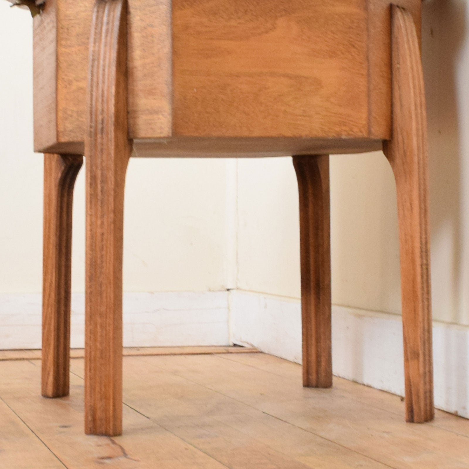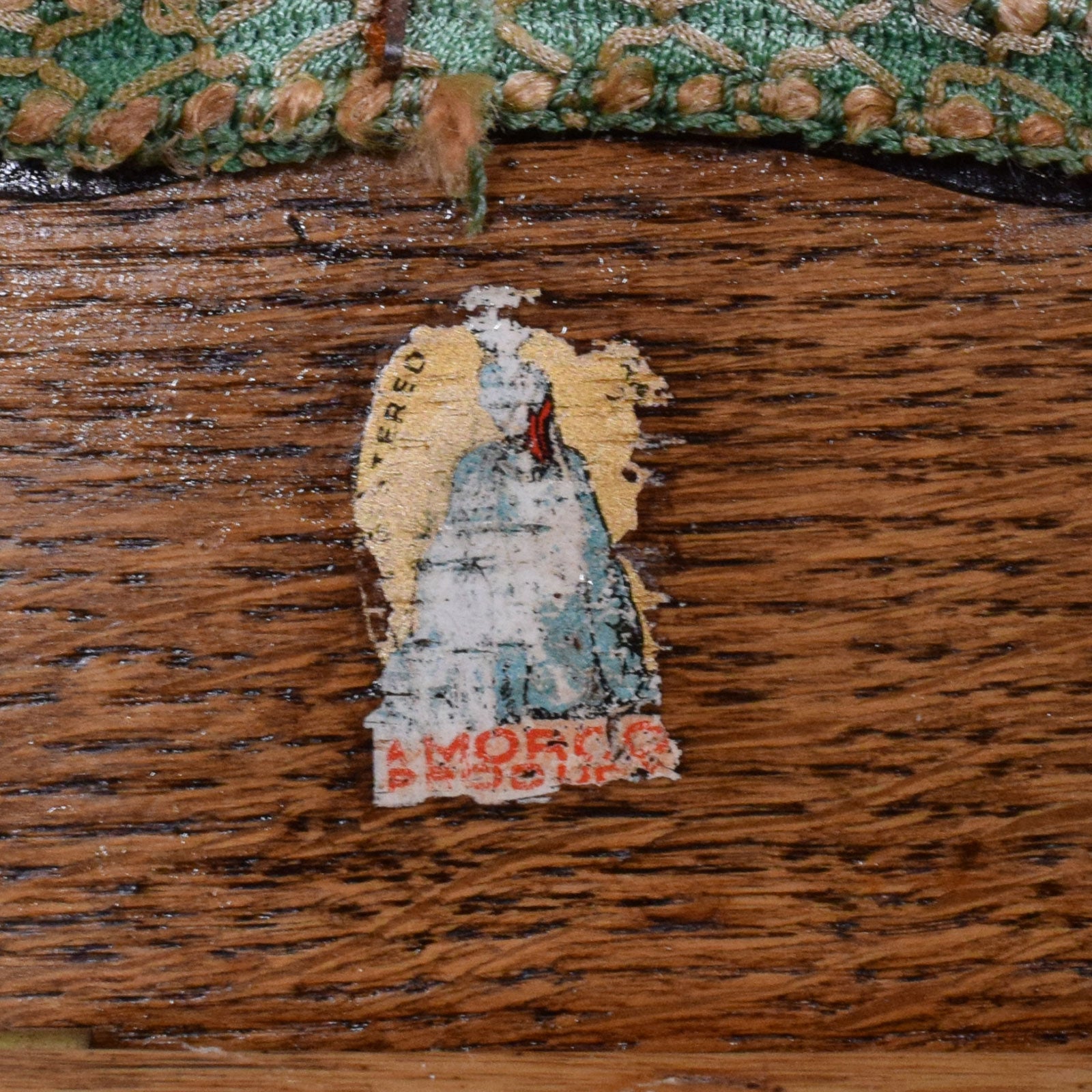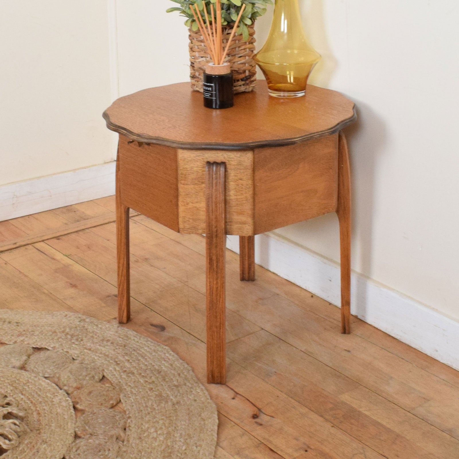 The Top surface could be used as a side table or a display stand when not in use, the lid opens with a catch at the front to reveal a space lined in the original green velvet material that would have kept sewing equipment safe and to hand if utilised for its original function. There is veneer damage and a watermark on the top surface and watermarks on the material inside that can be seen in the pictures.