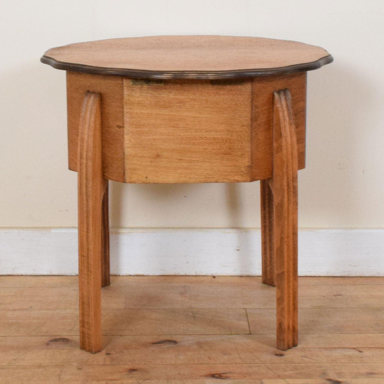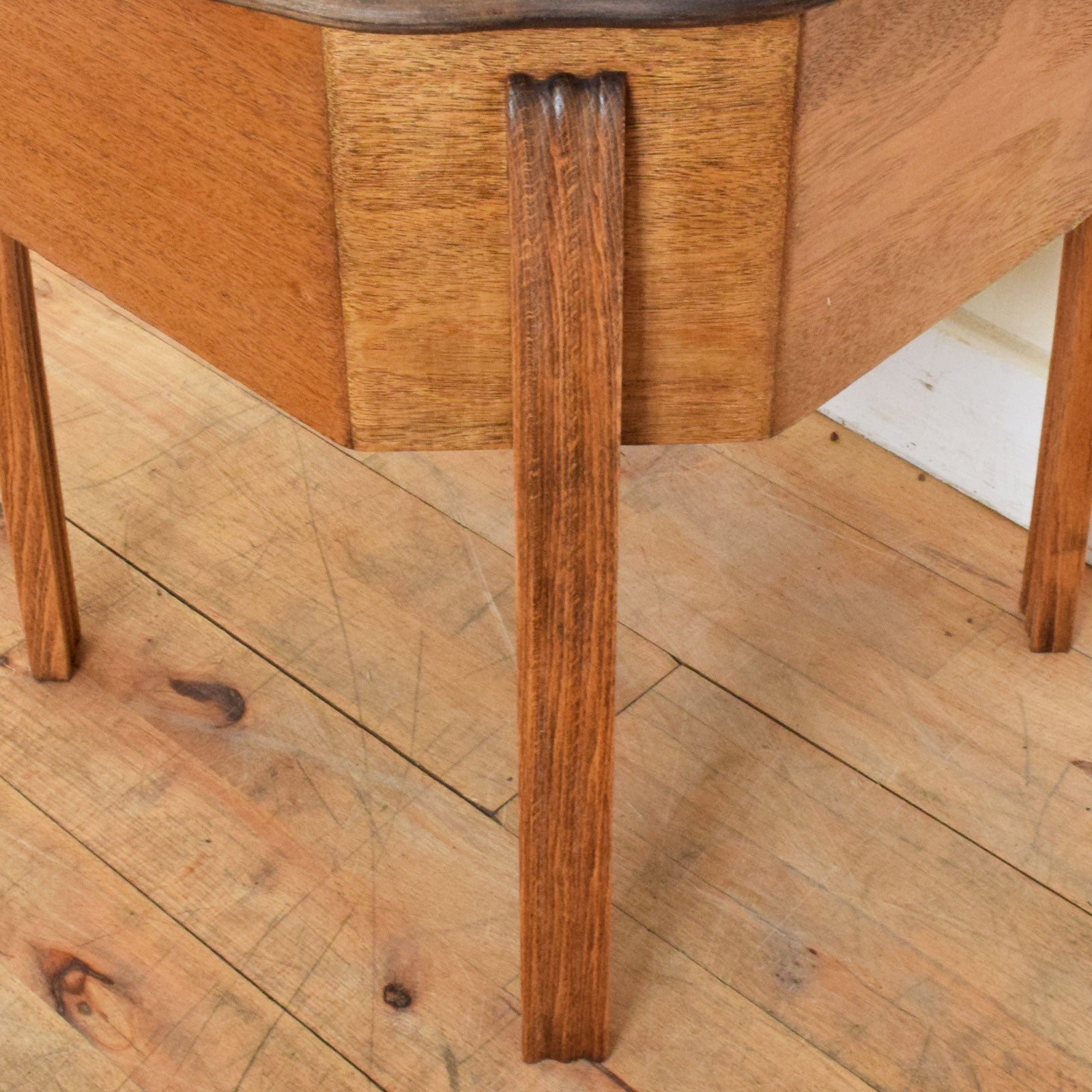 We have restored this lovely piece by carefully stripping back the previous darker stain and applying a clear matt lacquer to give a hard-wearing and appealing finish. This sewing box is made from oak with a velvet lining inside.