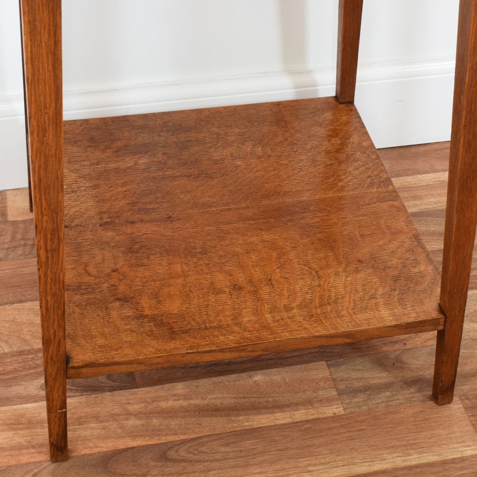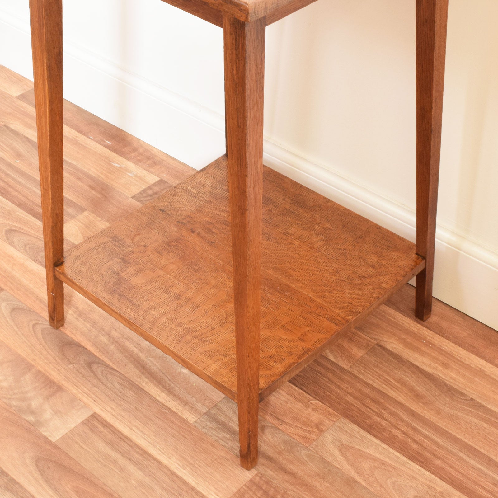 This solid oak table features a simple square top, supported by four legs that taper outwards in a gently splayed stance. A small lower shelf adds practicality while enhancing the visual interest of the design. The table’s classic lines and modest proportions make it suitable for both traditional and country-style interiors.