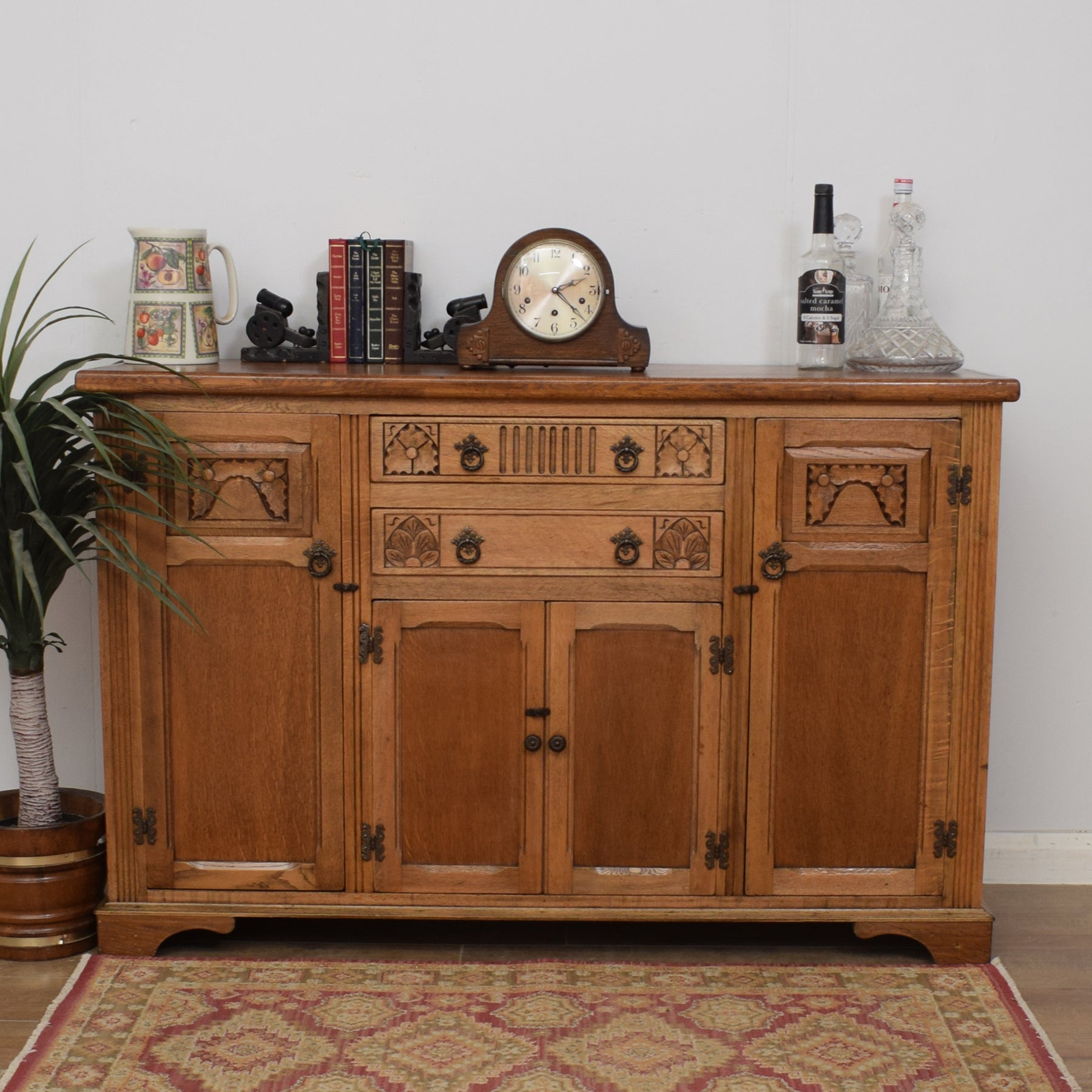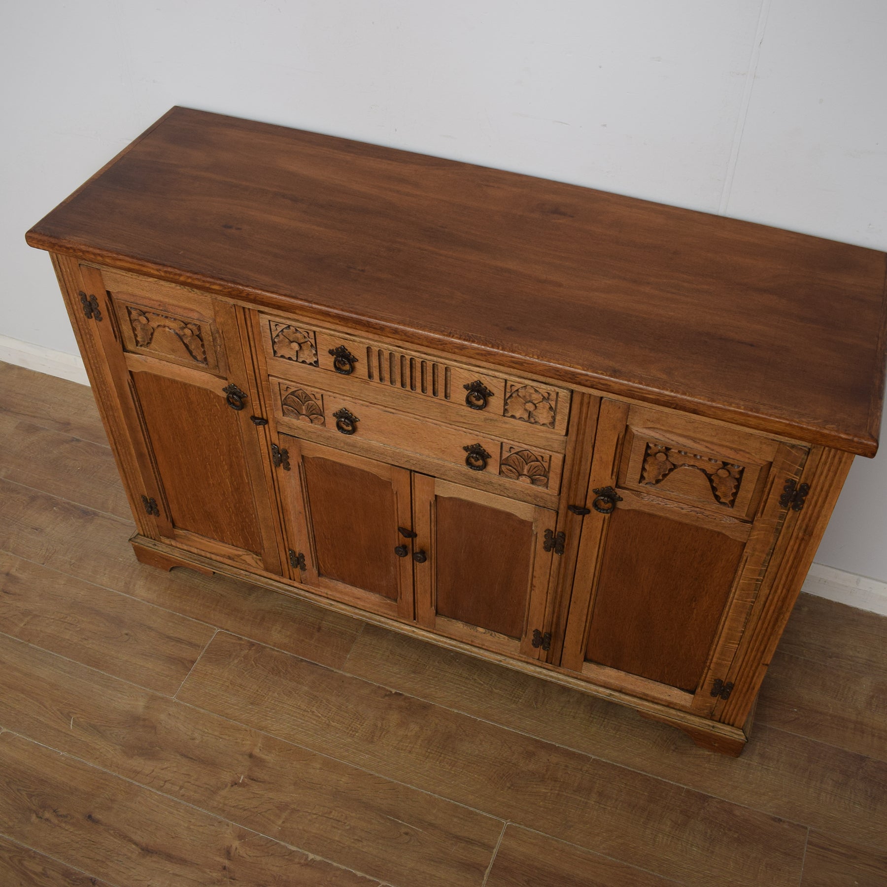 The sideboard features two panelled cupboard doors flanking a central double cupboard with classic drop handles, sitting below two ample drawers which have carved motifs. The piece provides a good balance of concealed cupboard storage and easy-access drawer space, ideal for keeping everyday items neatly organised.