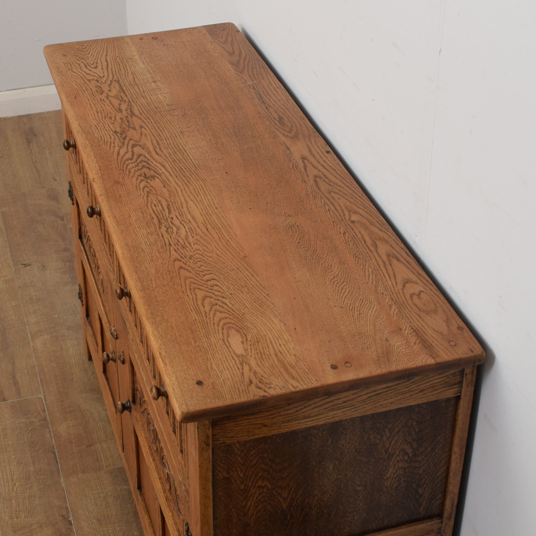 Our restoration workshop has stripped the original dark finish from this sideboard to reveal the natural oak grain before finishing with a matt lacquer. While our professional lacquered finish does provide a good level of protection, care is always needed when placing hot or sharp items.