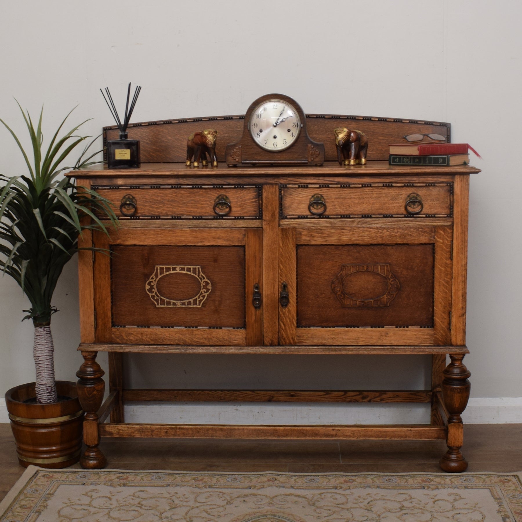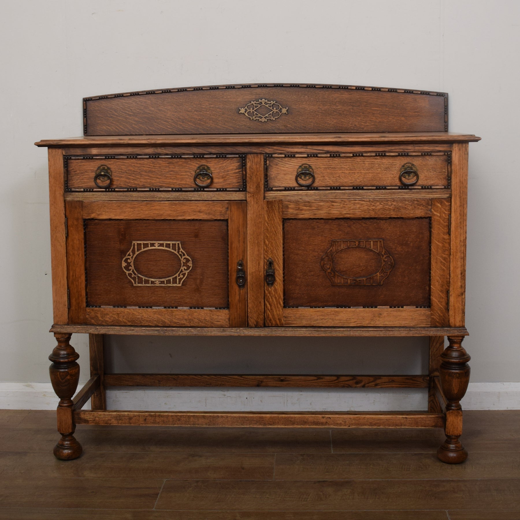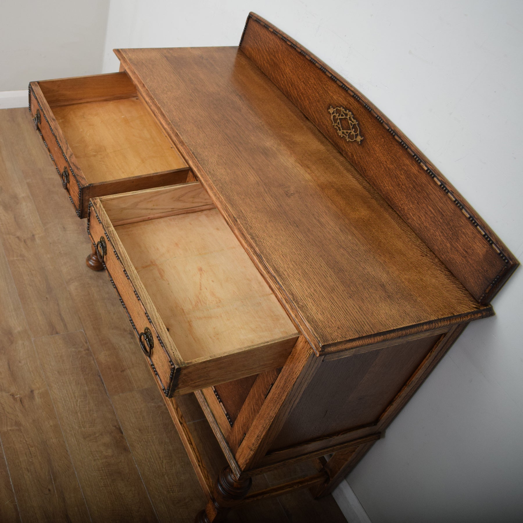 We have lovingly restored this impressive oak sideboard by carefully stripping back the previous finish to reveal the rich tones of the oak grain. A clear matt lacquer has then been applied to give a long-lasting and attractive finish. This sideboard is constructed from a mixture of solid oak and veneer panels. The back panel and drawer bases are plywood.