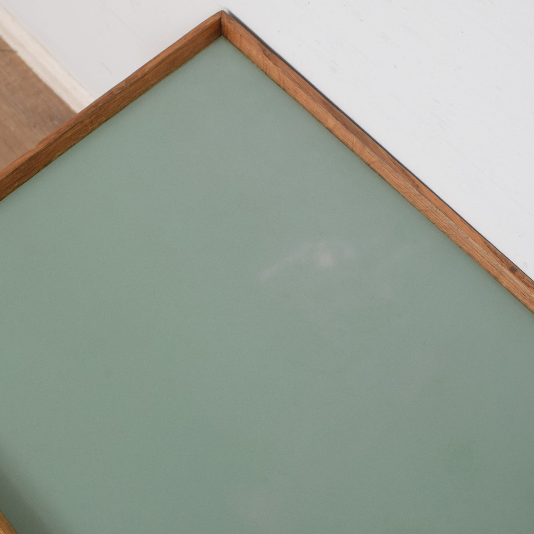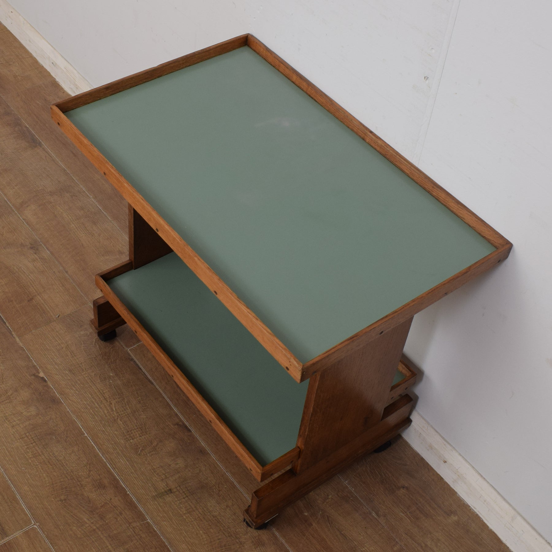 We have restored this trolley by stripping back the old finish on the wood before applying a clear lacquer to accentuate the beautiful oak grain and to give a hard-wearing and appealing finish. This trolley has a solid oak frame with plywood shelves covered in a pale blue laminate.