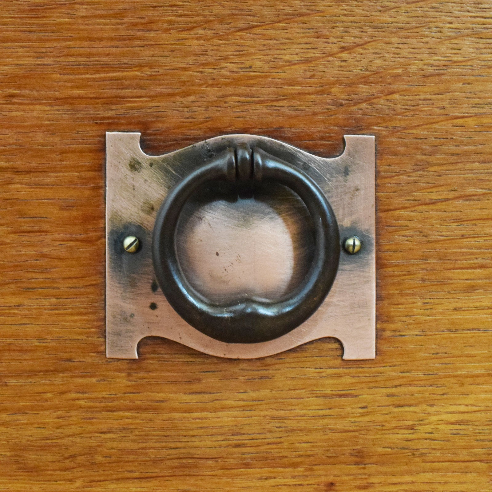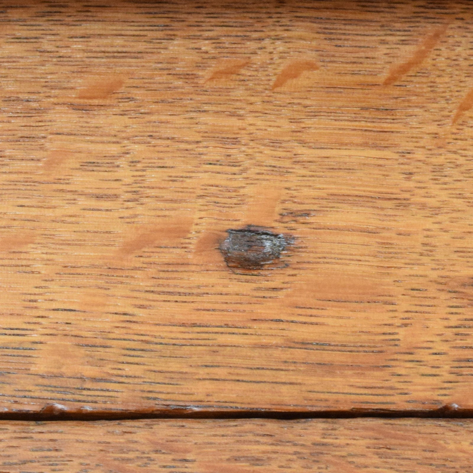 The piece has been carefully stripped and refinished with multiple coats of hard-wearing matte lacquer, giving it a long-lasting finish while enhancing the natural tone and grain of the oak. This item is made primarily from solid oak with some oak veneer panels. The back is constructed from solid oak panels.