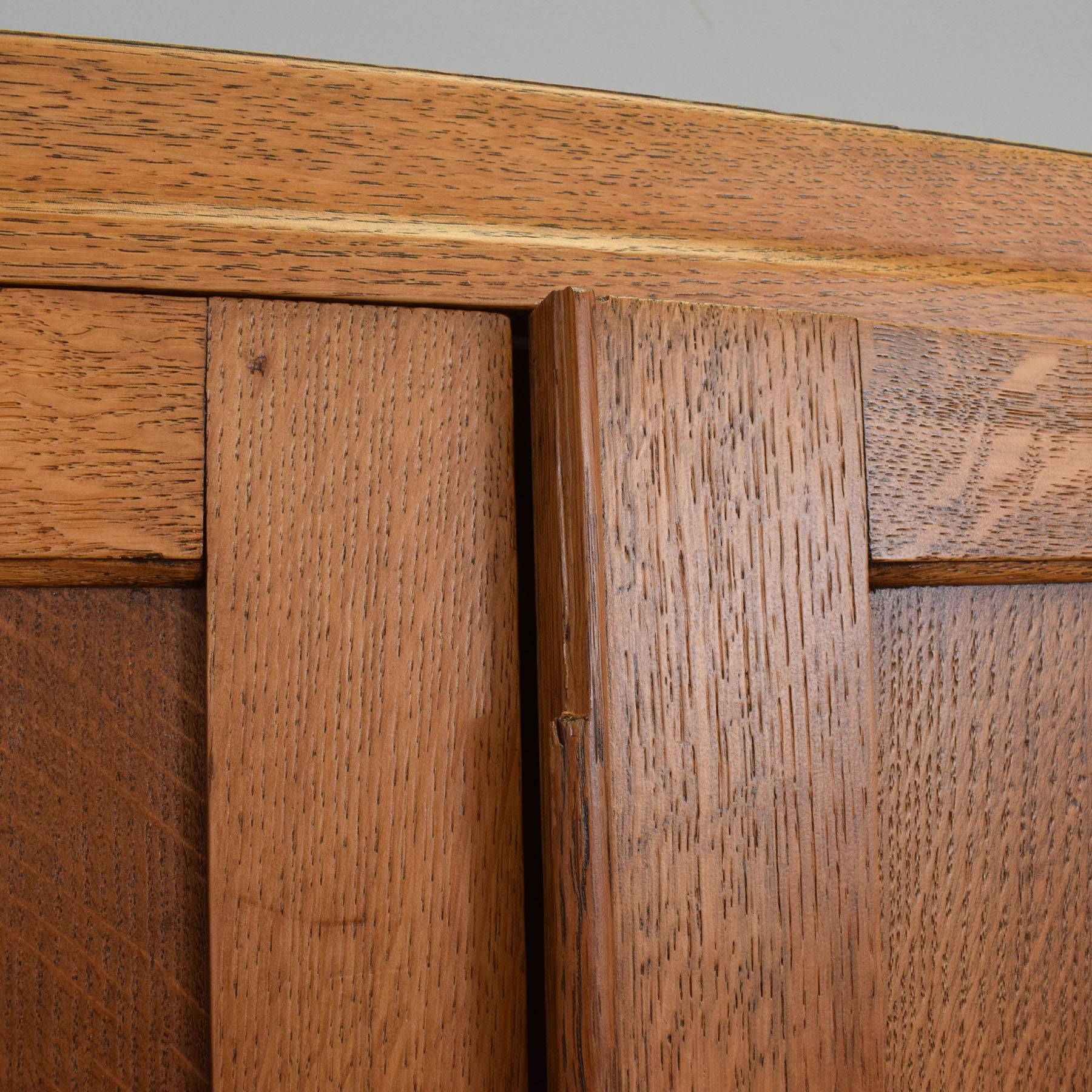 The wardrobe shows some veneer damage, some imperfections to the mirror, and some water marks inside, all of which reflect its age and use. The sides are veneered, the frame is solid oak, the doors have inset panels, and the back is made from plywood.