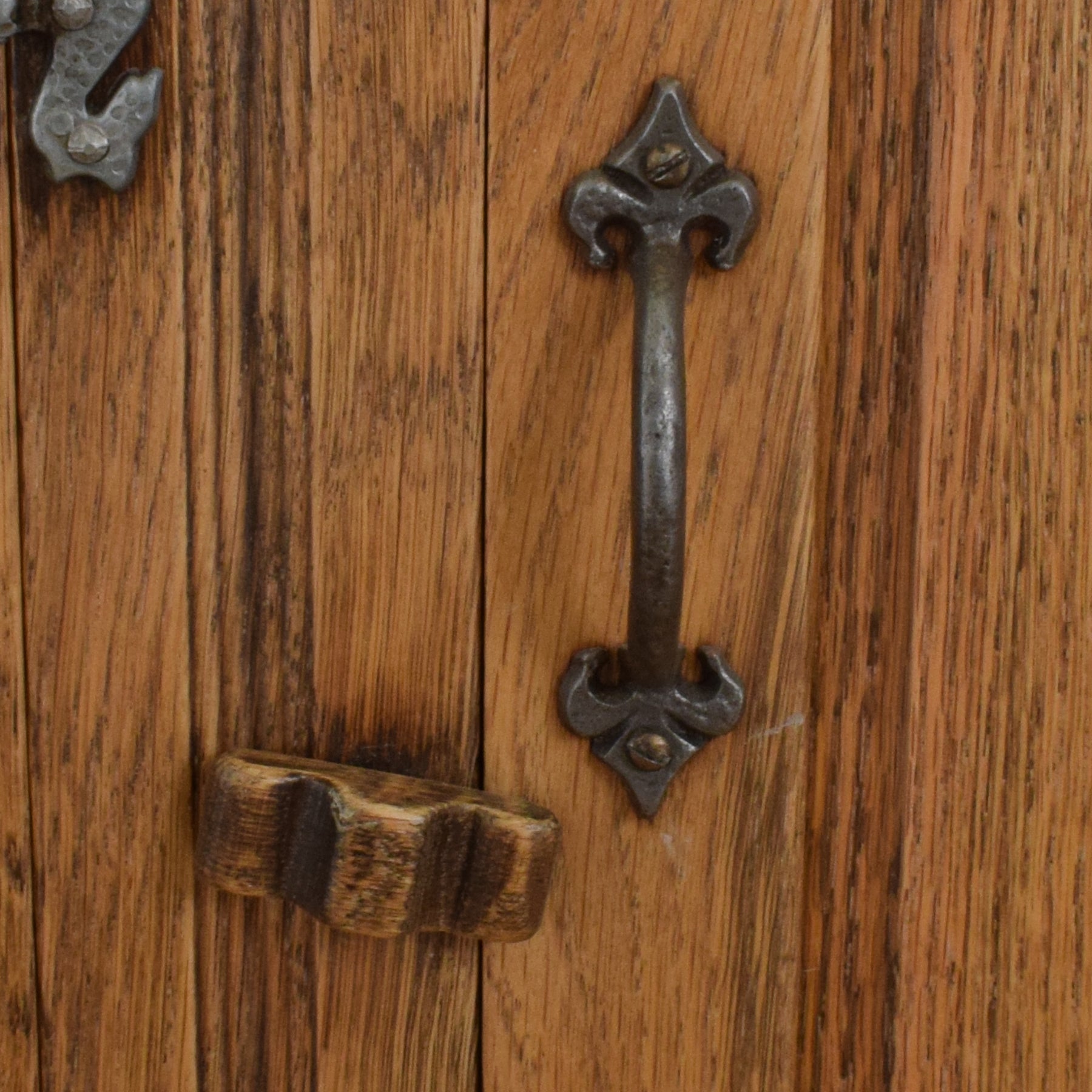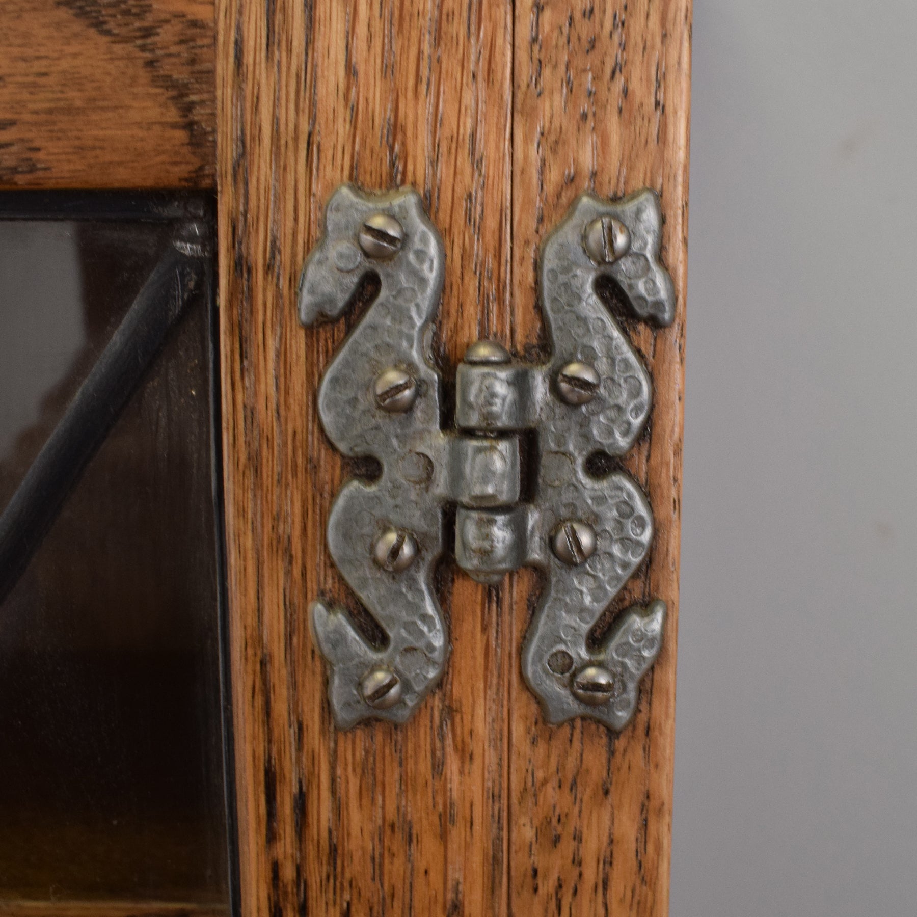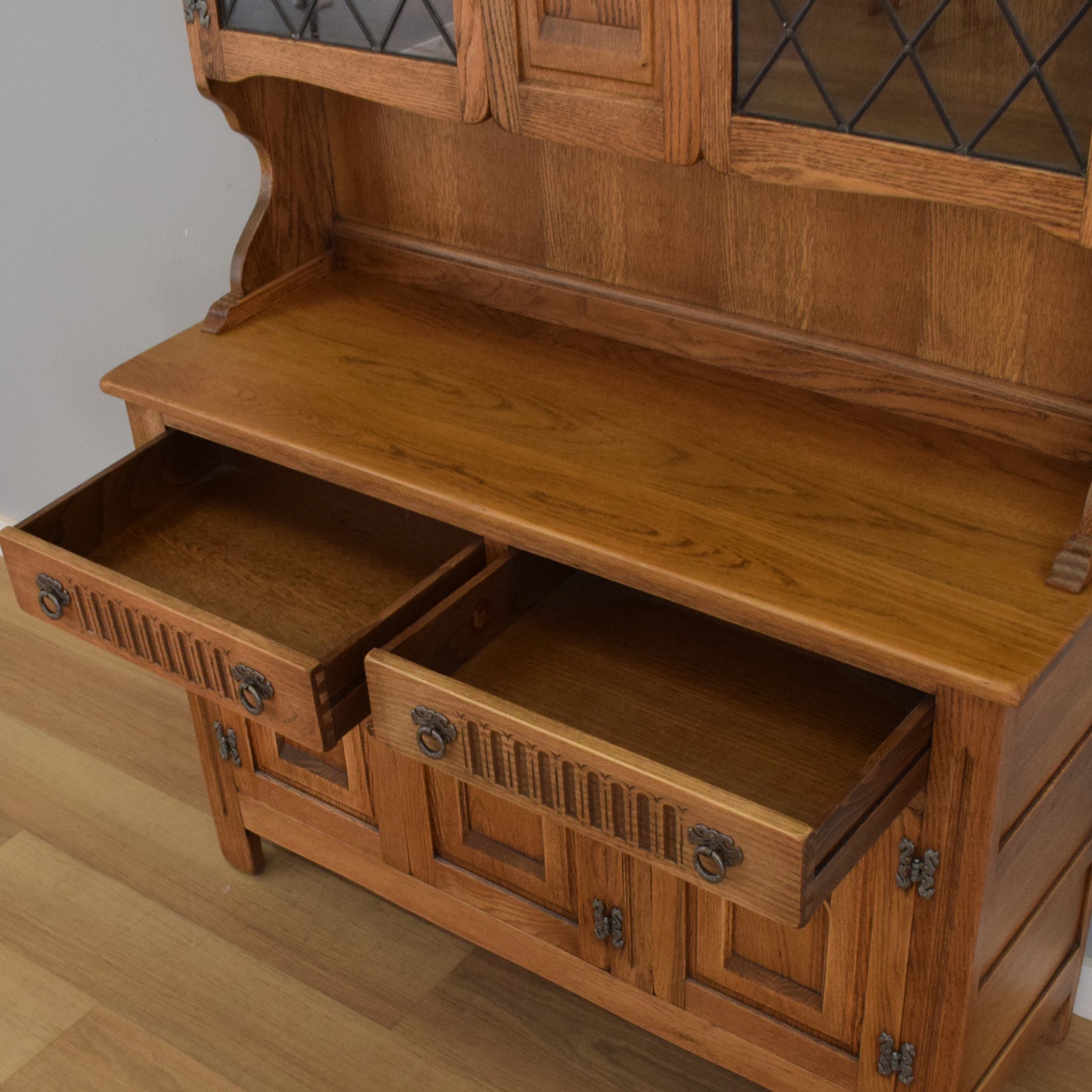 The dresser features a two-part design, with a lower section housing two spacious drawers and two cupboards with three doors, all showcasing intricate Gothic-style arches and wrought-iron hardware. Above, the hutch includes leaded glass doors flanking a central carved panel, offering a lovely way to display treasured items while keeping them secure. The warm oak finish highlights the natural grain, blending seamlessly with traditional or rustic decor.