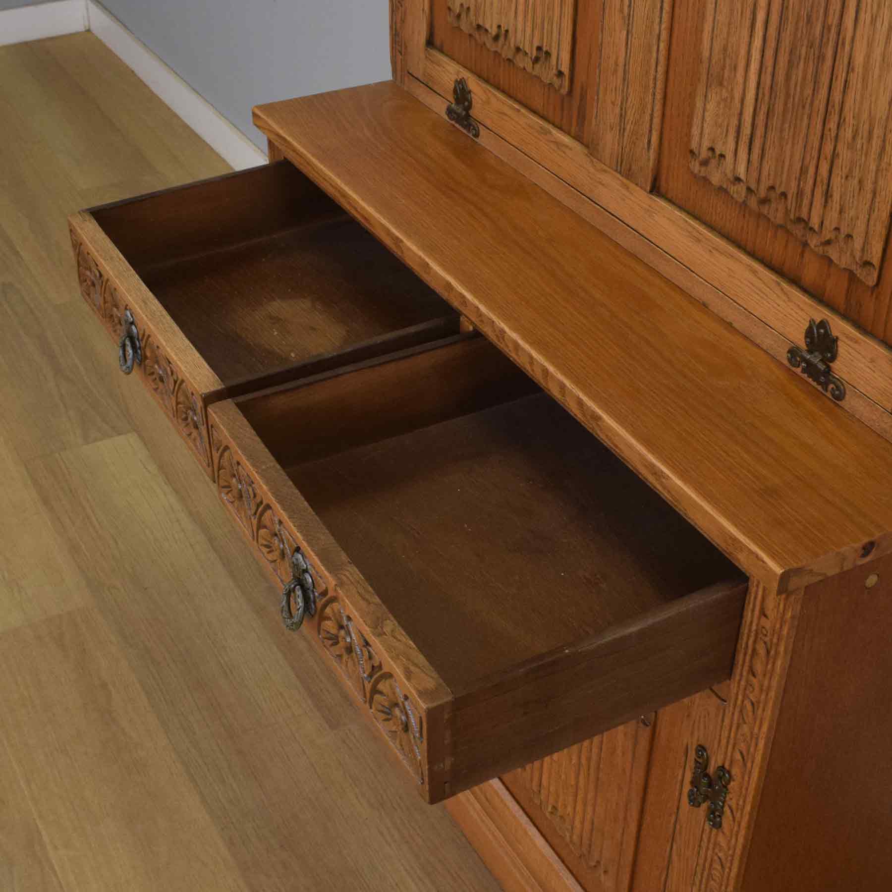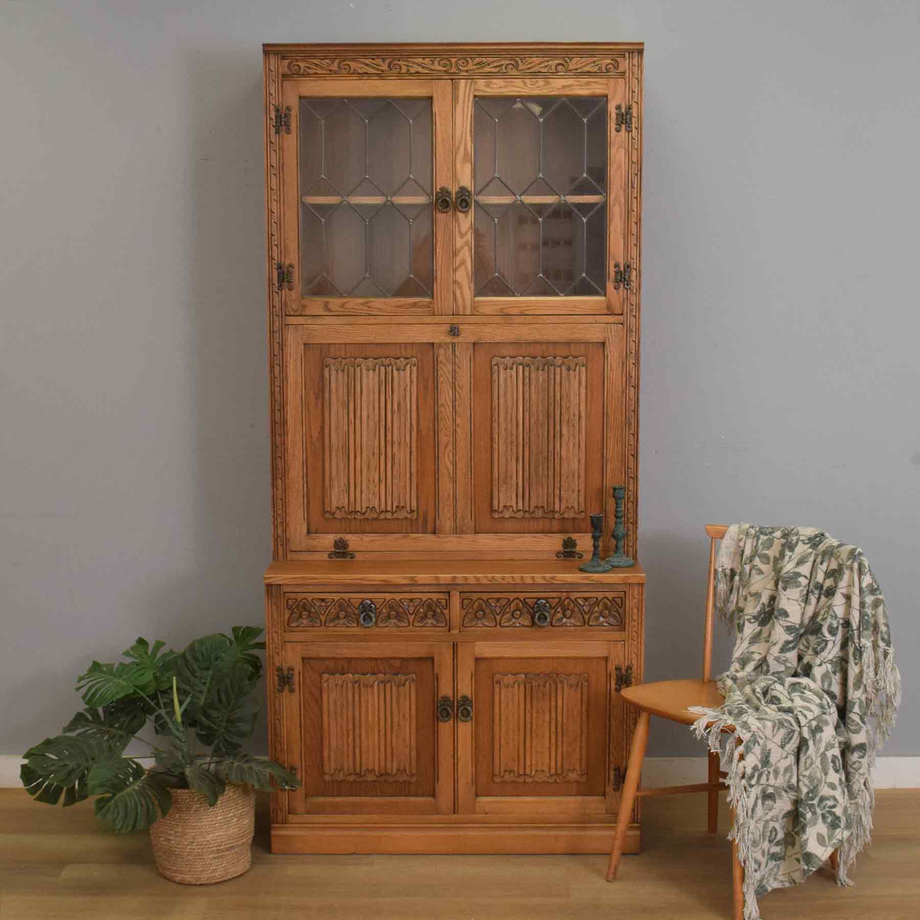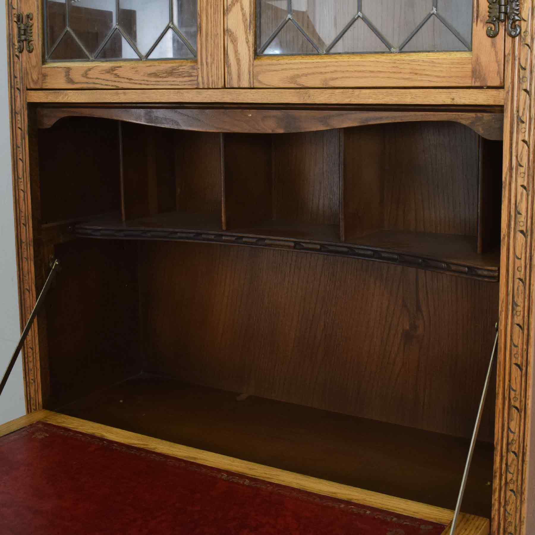 The piece combines several practical features in one compact design, with a glazed upper bookcase for display, a fall-front bureau for writing, two drawers, and a lower cupboard for enclosed storage. The leaded glass doors, carved decorative panels, and dark metal handles and hinges give it a recognisable Old Charm style, while the red leather writing surface adds a smart finishing touch when the bureau is opened. Inside, there is good space for books, paperwork, and everyday household items, making it a useful choice for both display and storage.