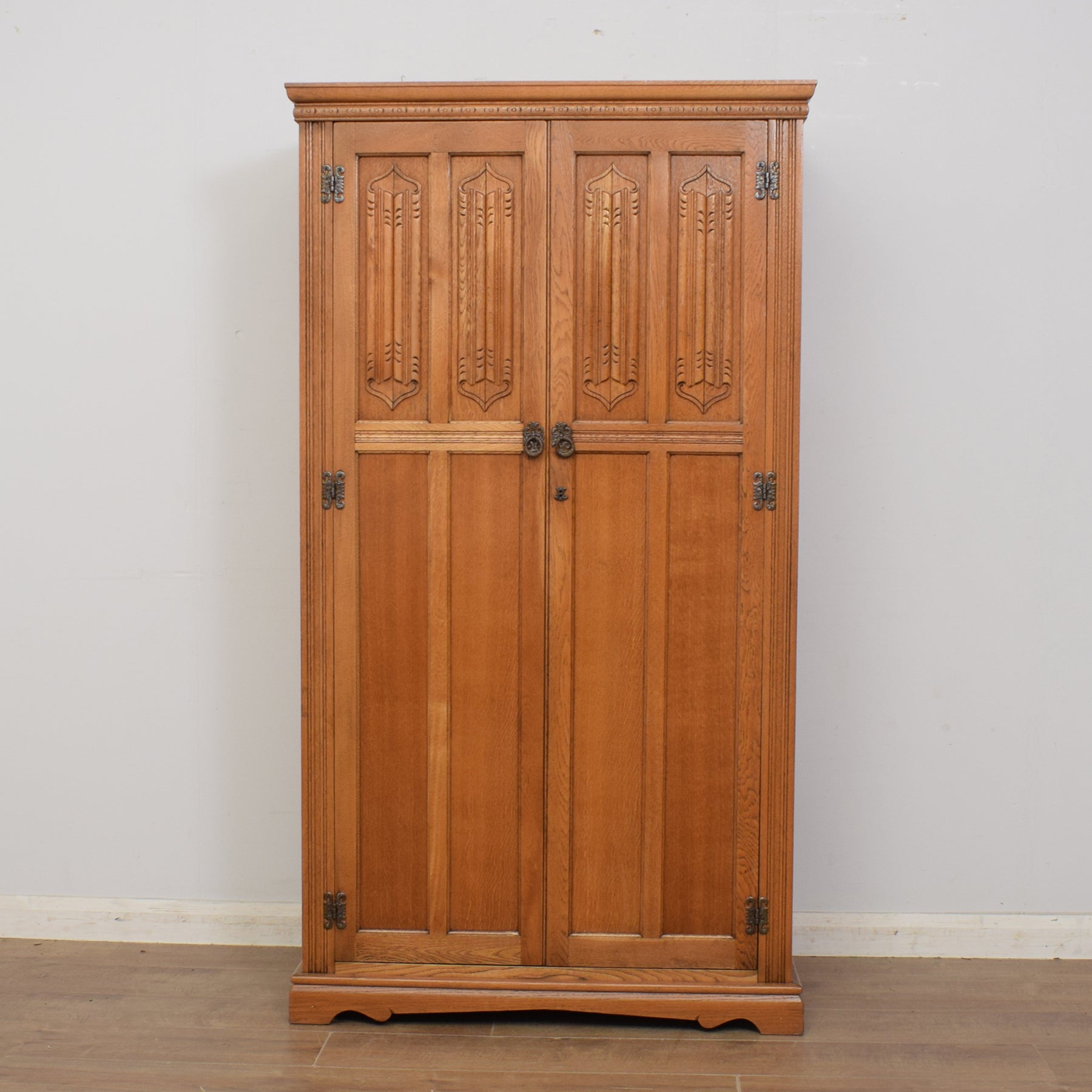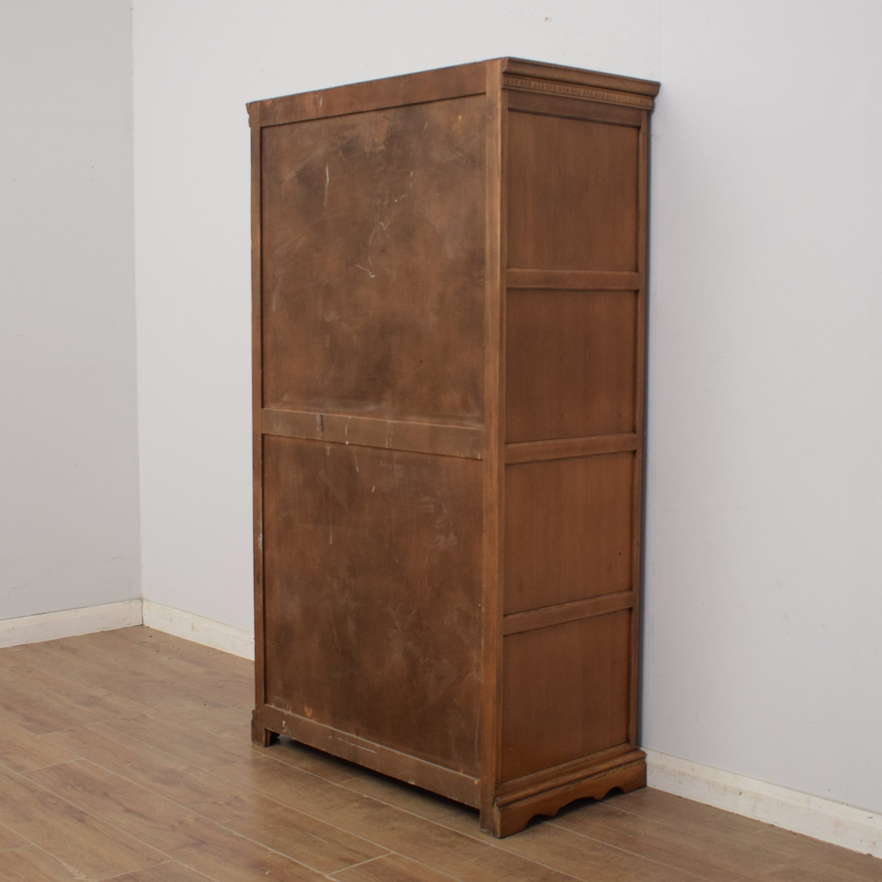 Our restoration workshop has stripped the original finish from this wardrobe and applied a matt lacquer that enhances the natural beauty of the wood and provides protection and durability. The wardrobe is made from a mixture of woods, with some solid oak and some veneer panels. The back panel is plywood.