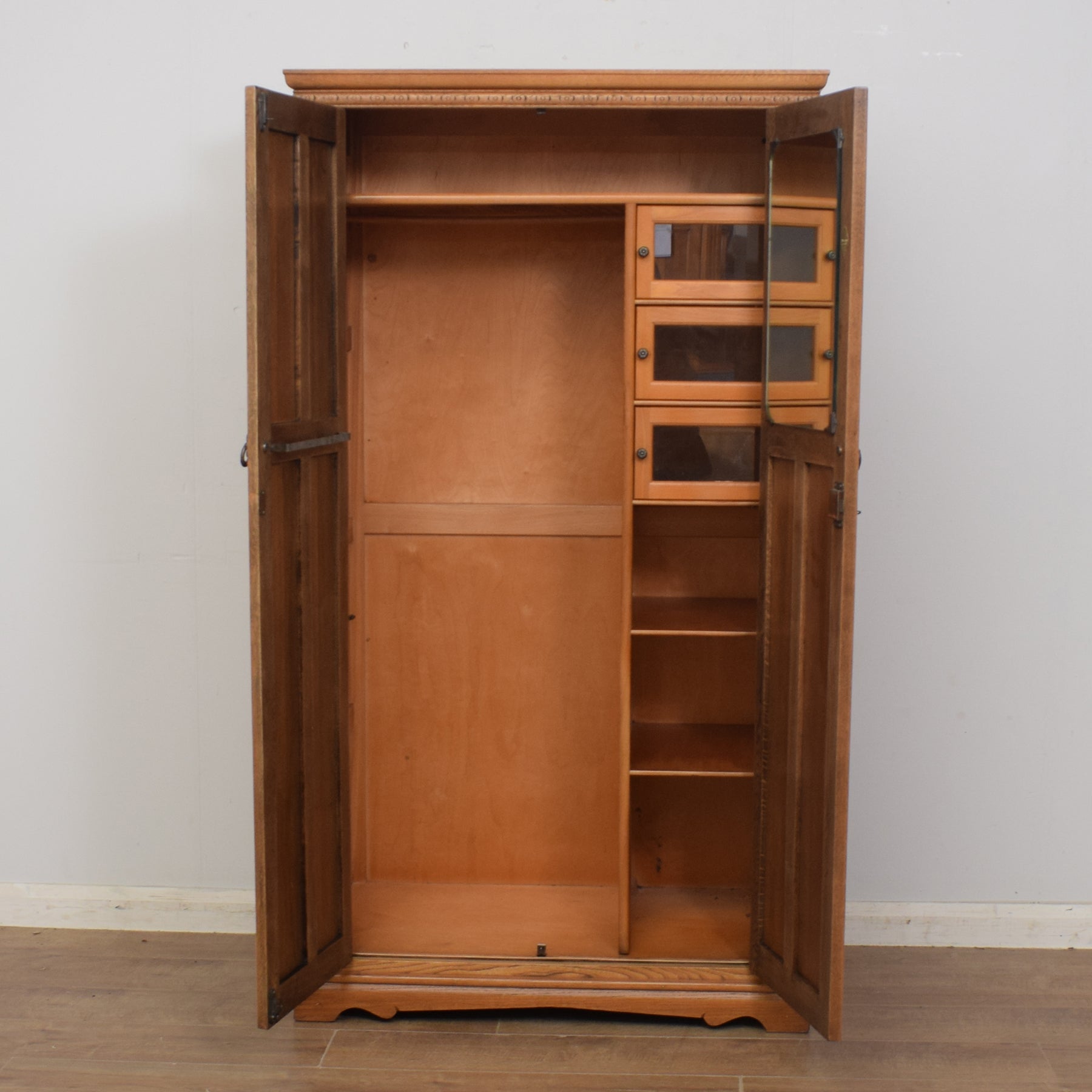 The two panelled wardrobe doors with a traditional linenfold design open to reveal a spacious hanging space on the left and six storage shelves on the right, three of which are covered by glass doors. At the top is a shelf which is ideal for boxes, folded clothing and linen. There is a tie rack on the inside of the right door. One key is provided.