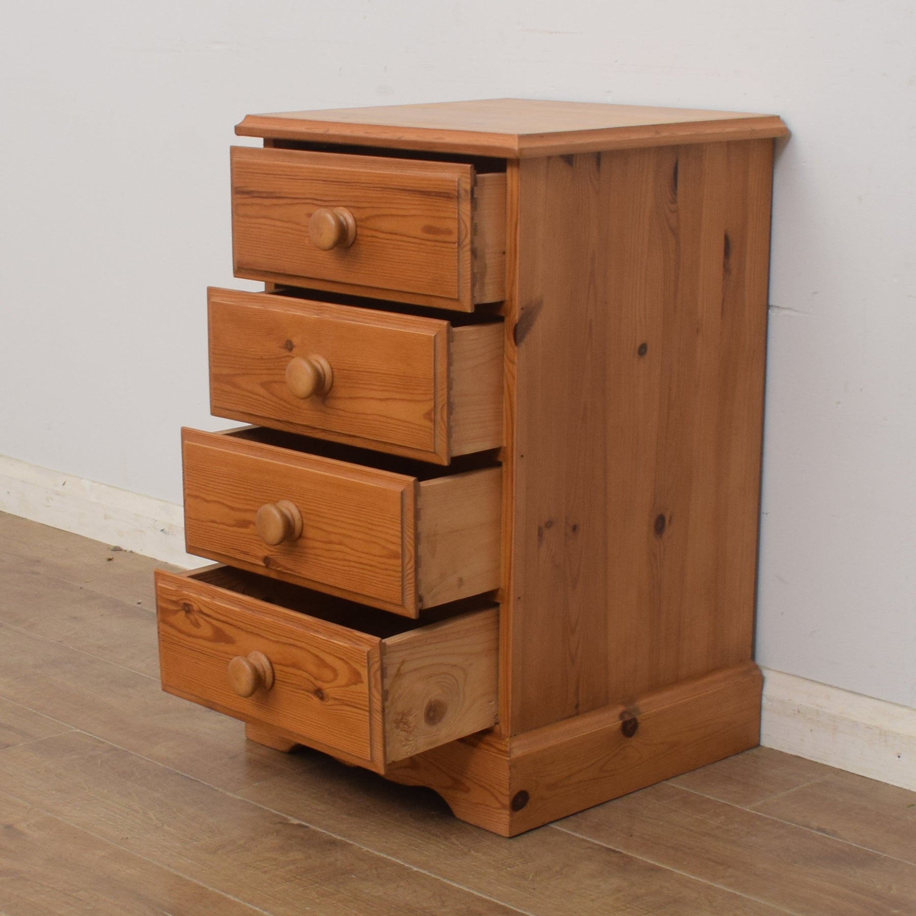 The top surface has plenty of space for a lamp or a clock, along with treasured ornaments or reading material. Below are four spacious drawers, offering storage for various bedroom essentials or smaller items of clothing. The shaped skirt, solid pine handles and beautiful grain of the wood all add to the visual appeal of this functional piece.