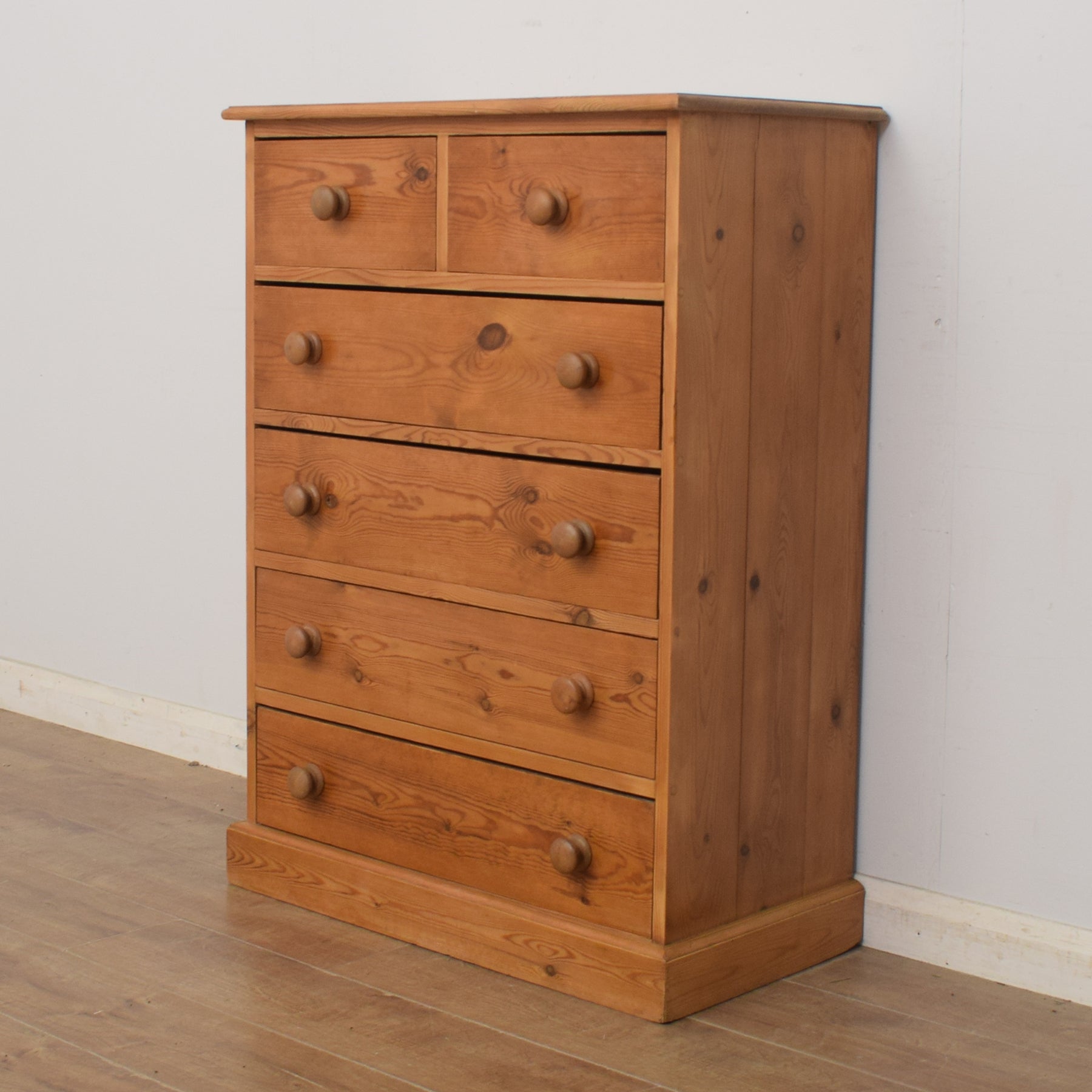 The four generously apportioned full-width and two half-width drawers are excellent functional storage for clothes, towels or spare bedding. The attractive pine top has ample room for a vase of freshly picked flowers or favourite photographs of loved ones. There is a beautiful pine grain on display, right across this piece.