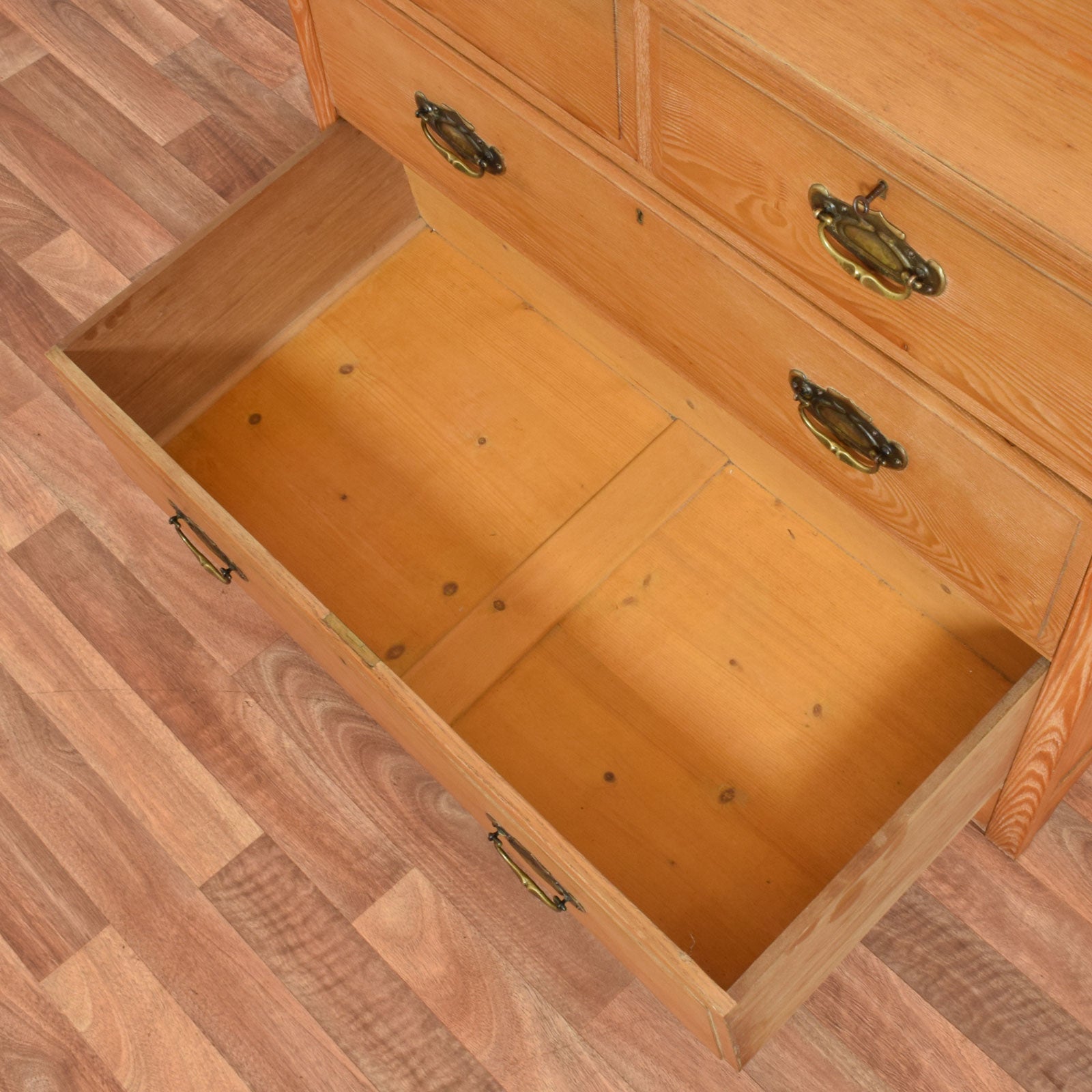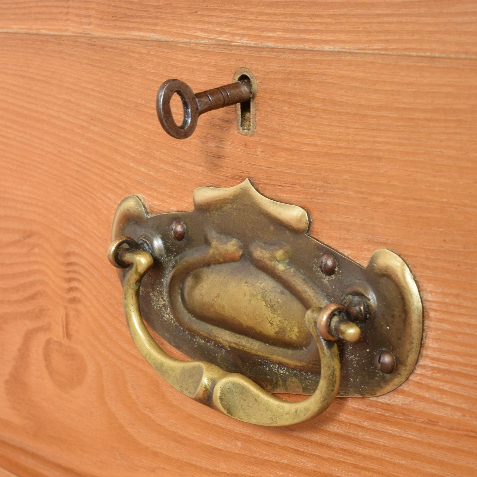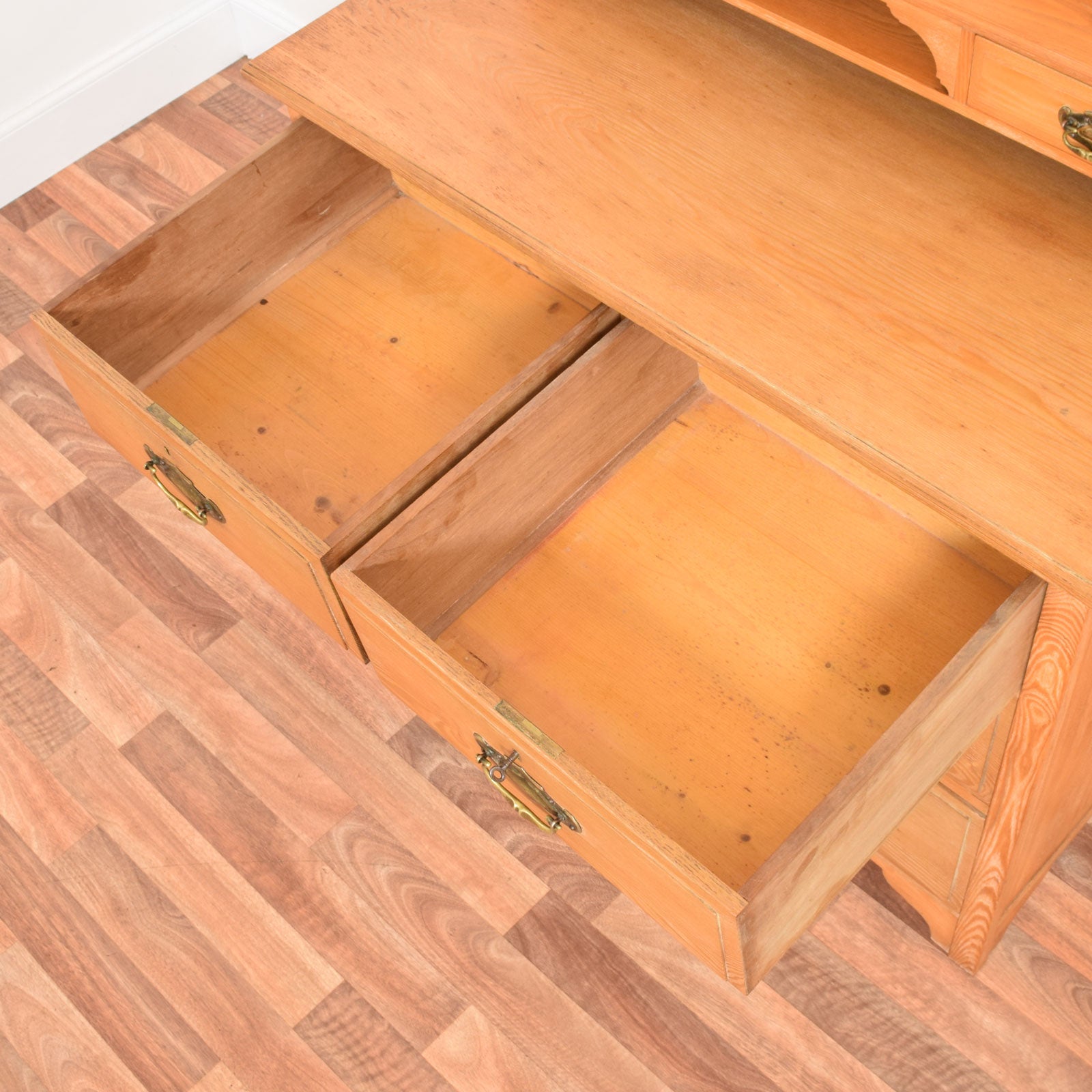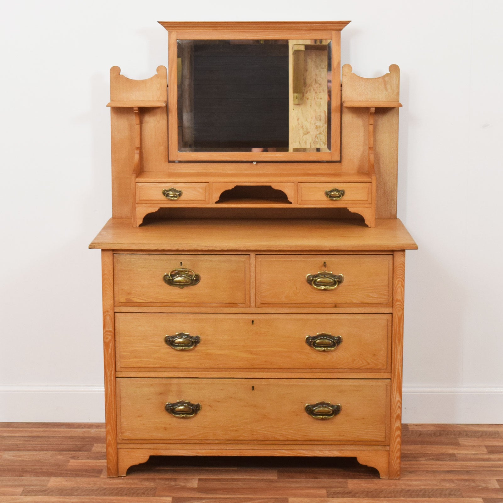 This restored pine dressing table by Black & Son of Brechin features a well-balanced design, including a tilting mirror framed with a simple cornice, flanked by two small display shelves. Beneath the mirror, a raised section houses two small drawers and an open compartment, perfect for jewellery or cosmetics. The lower section provides further storage with two half-width drawers and two deeper full-width drawers, all fitted with original brass drop handles. The included key operates smoothly in all locks, making the piece both secure and functional.