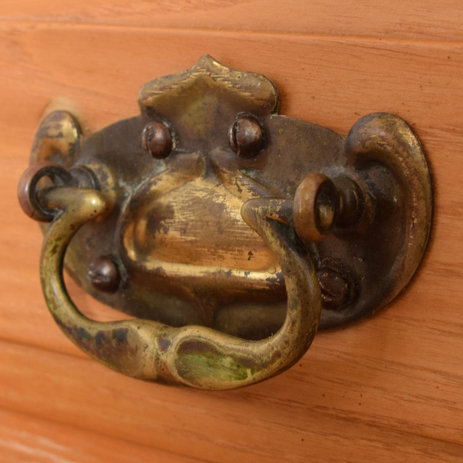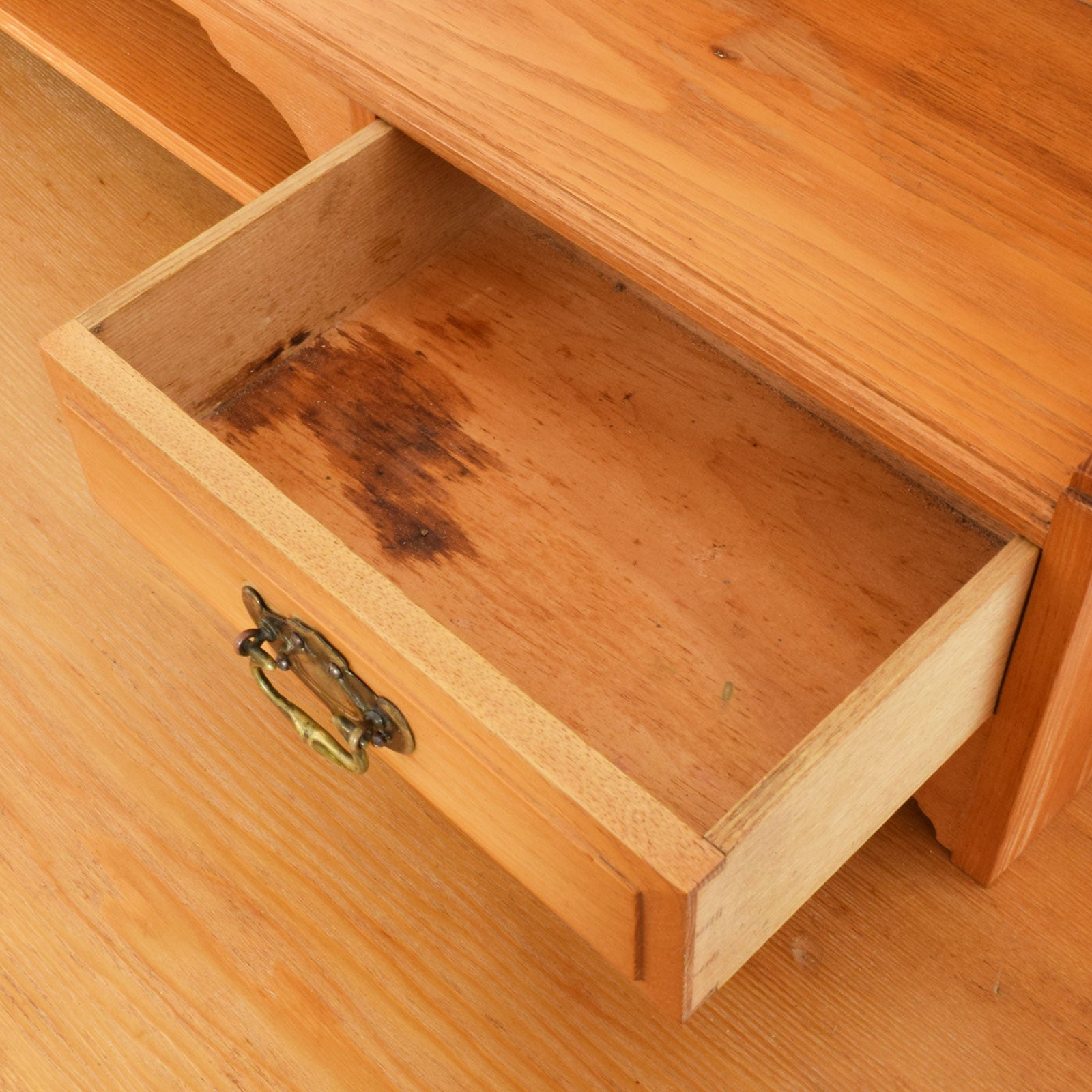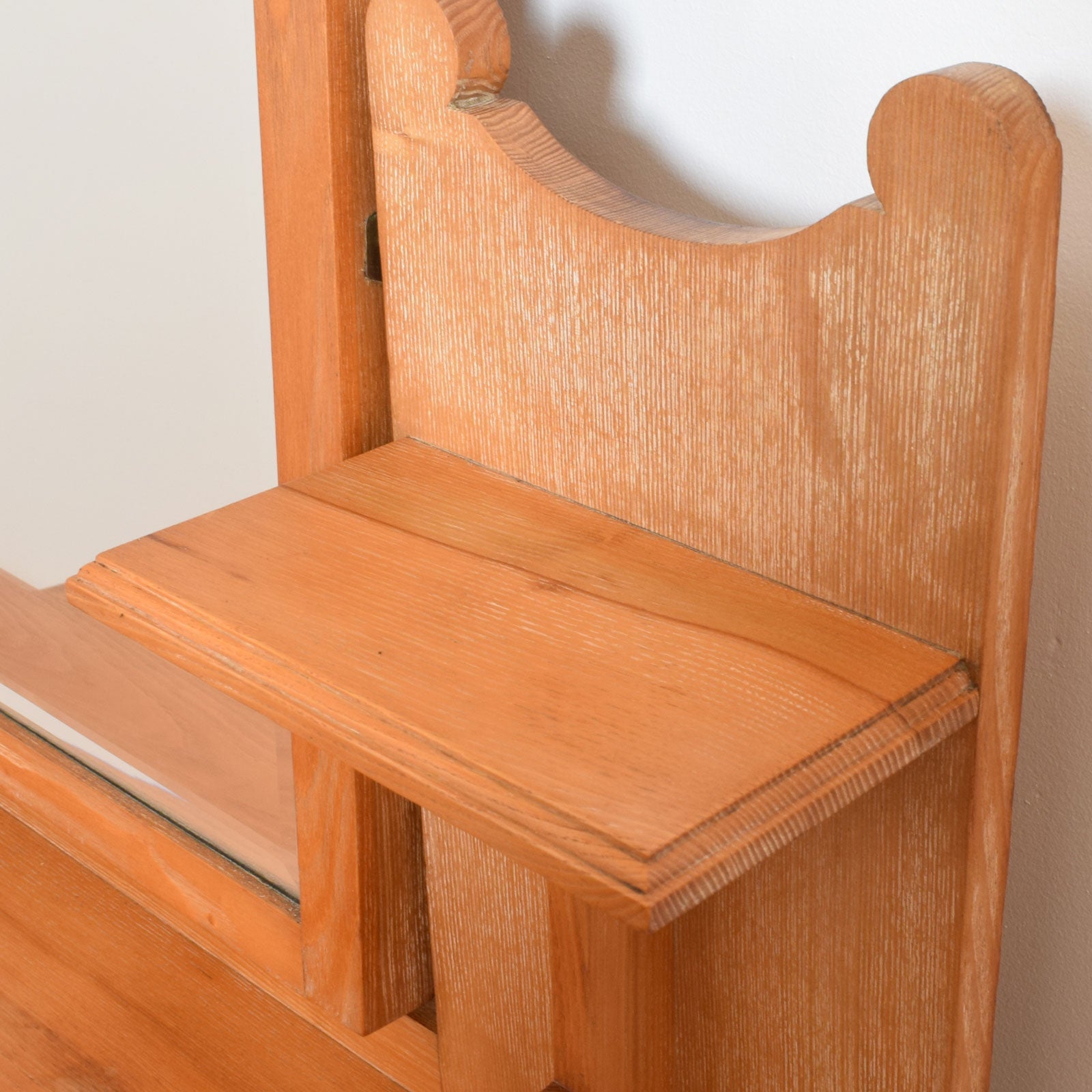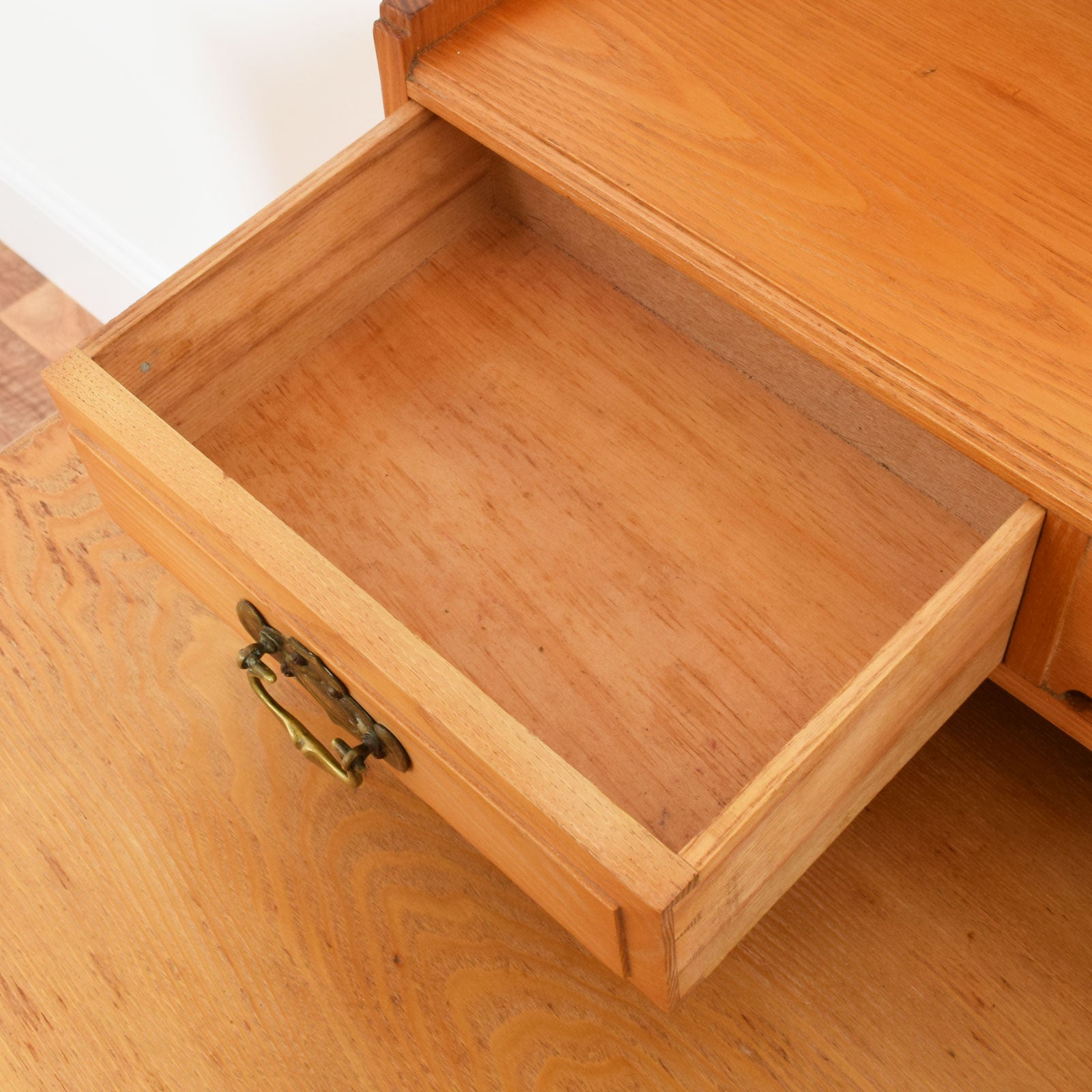 This restored pine dressing table by Black & Son of Brechin features a well-balanced design, including a tilting mirror framed with a simple cornice, flanked by two small display shelves. Beneath the mirror, a raised section houses two small drawers and an open compartment, perfect for jewellery or cosmetics. The lower section provides further storage with two half-width drawers and two deeper full-width drawers, all fitted with original brass drop handles. The included key operates smoothly in all locks, making the piece both secure and functional.