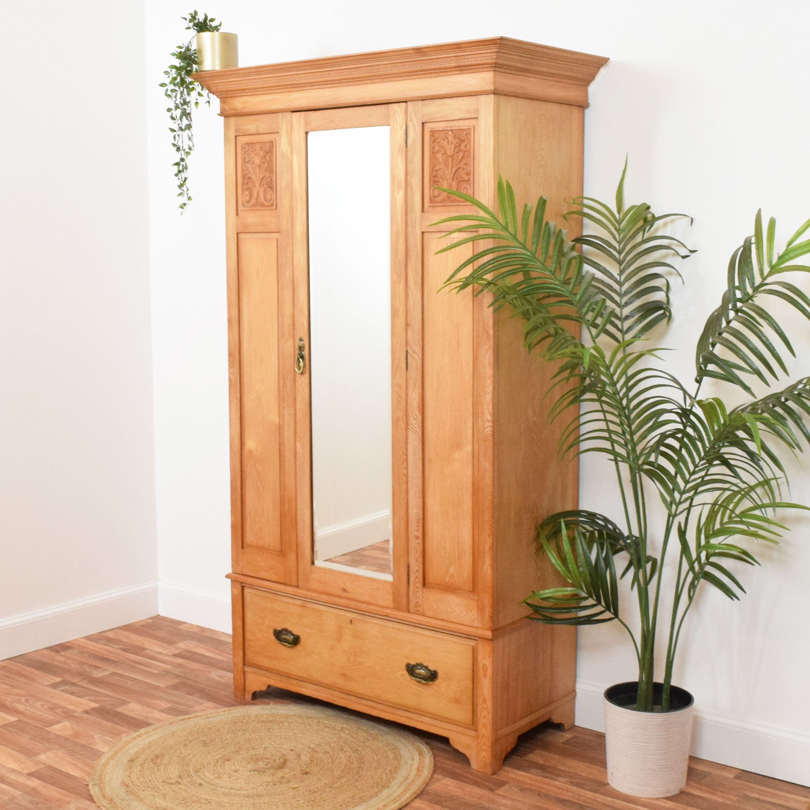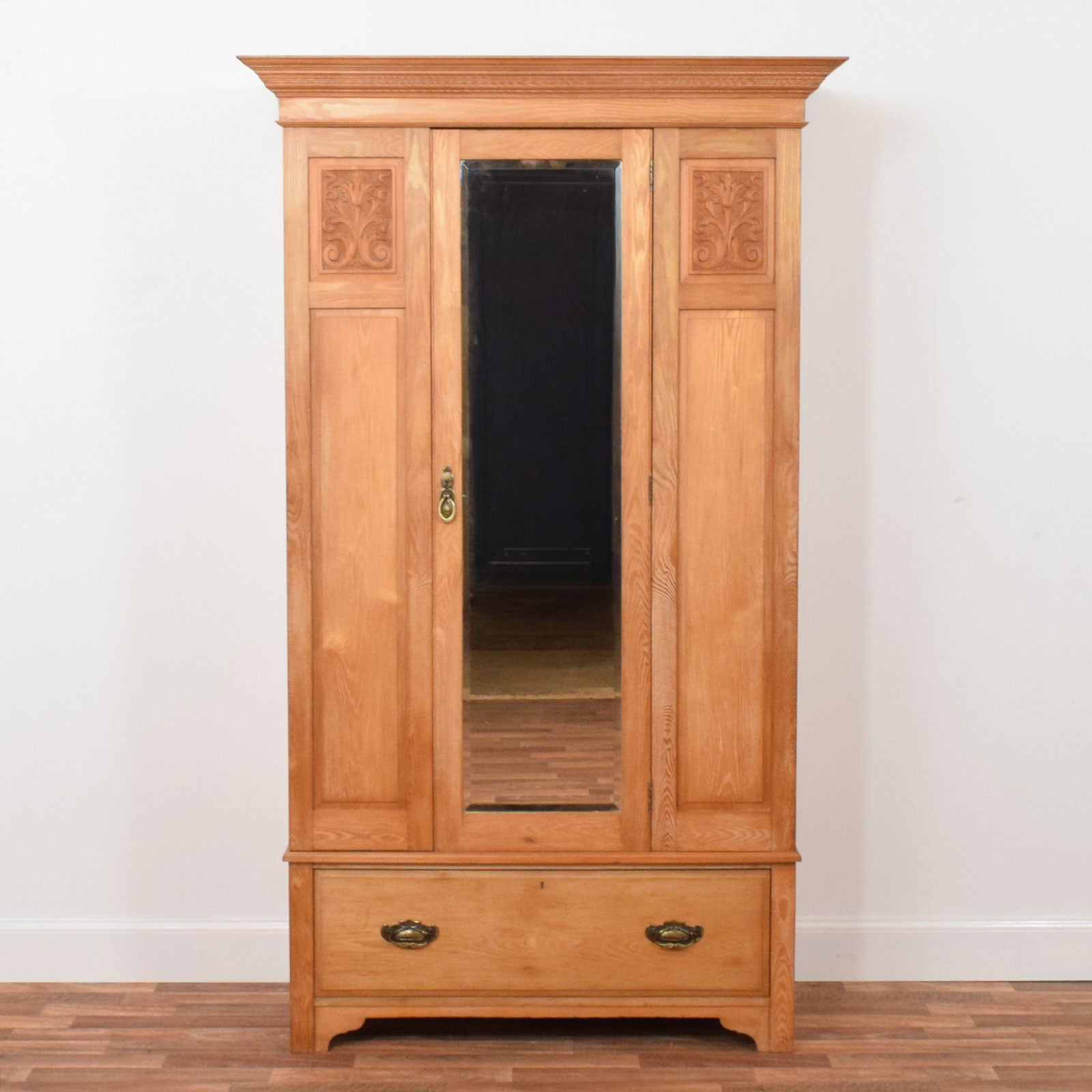 This early 20th-century pine hallrobe by Black & Son of Brechin features a full-length mirrored door flanked by elegant carved panels and crowned with a bold cornice. Inside, six sliding brass hooks on the hanging rail and five fixed hooks along the back provide ample space for coats, hats, or bags. The lower section includes a wide drawer with aged brass handles, perfect for shoes or accessories. A traditional brass keyhole escutcheon and drop handle complete the door, though the original key is no longer present.