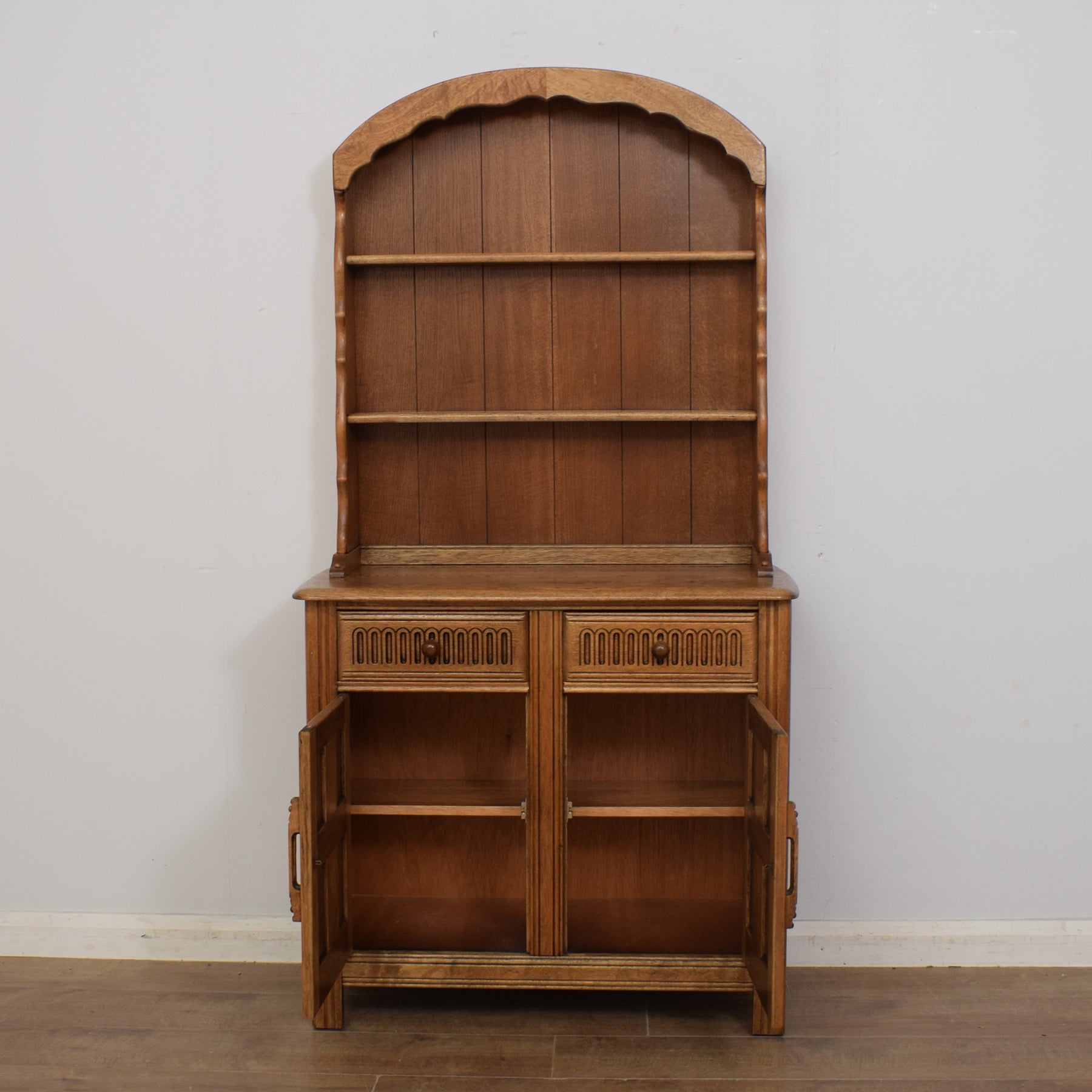 The upper section features two display shelves that have grooves for displaying decorative plates. This sits on the beautiful, naturally-grained oak worktop that also has support for displaying plates at the rear, along with ample space for a vase of flowers or other favourite ornaments. Below are two drawers above a shelved double cupboard, offering a good level of storage for a variety of items.
