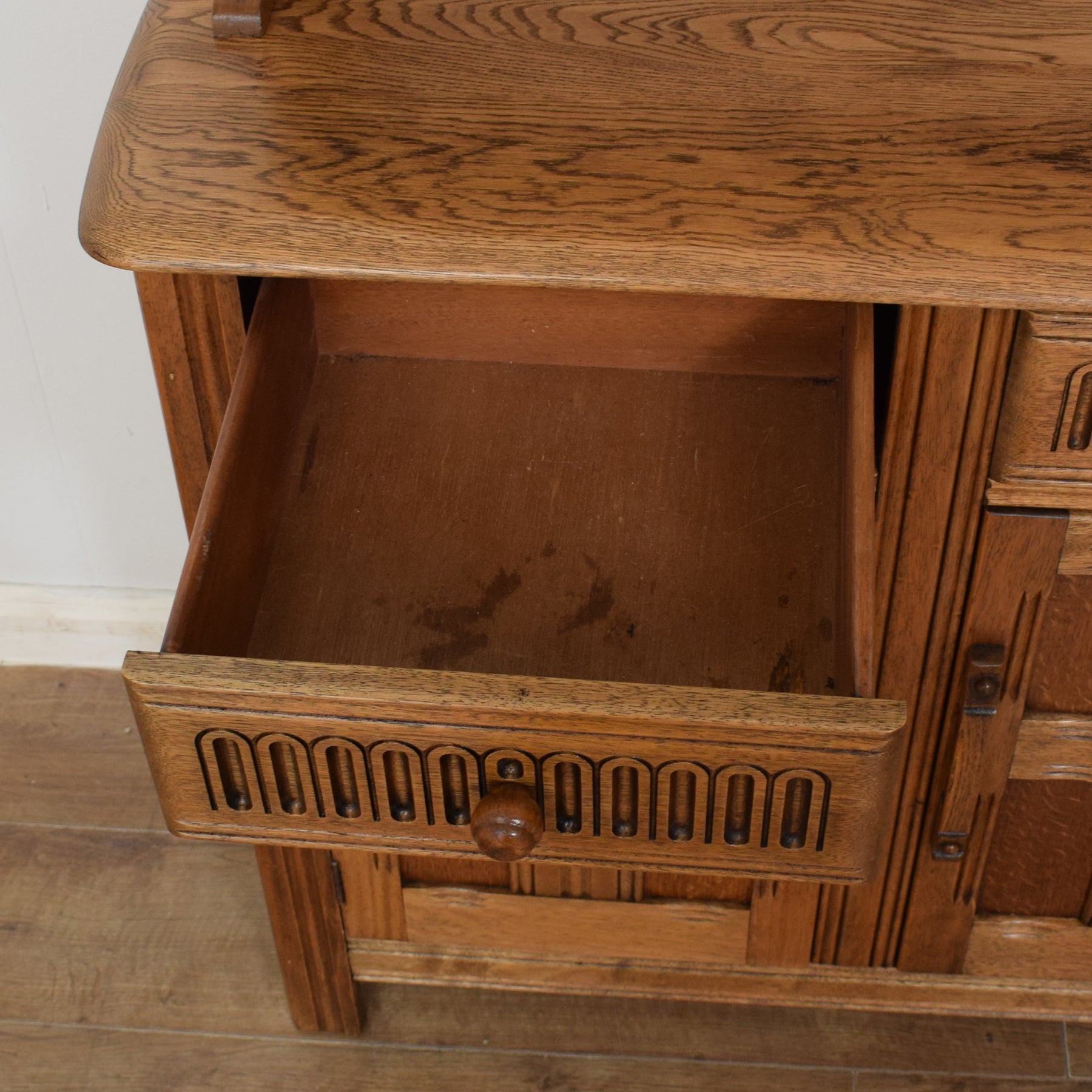 We have lovingly restored this dresser by stripping back the previous darker finish to reveal the lighter, more natural tone of the wood, before applying several spray coats of a clear lacquer to give an appealing and durable finish. This piece is made from a mixture of solid oak and oak veneer. The drawer bases and rear panel are made from plywood.