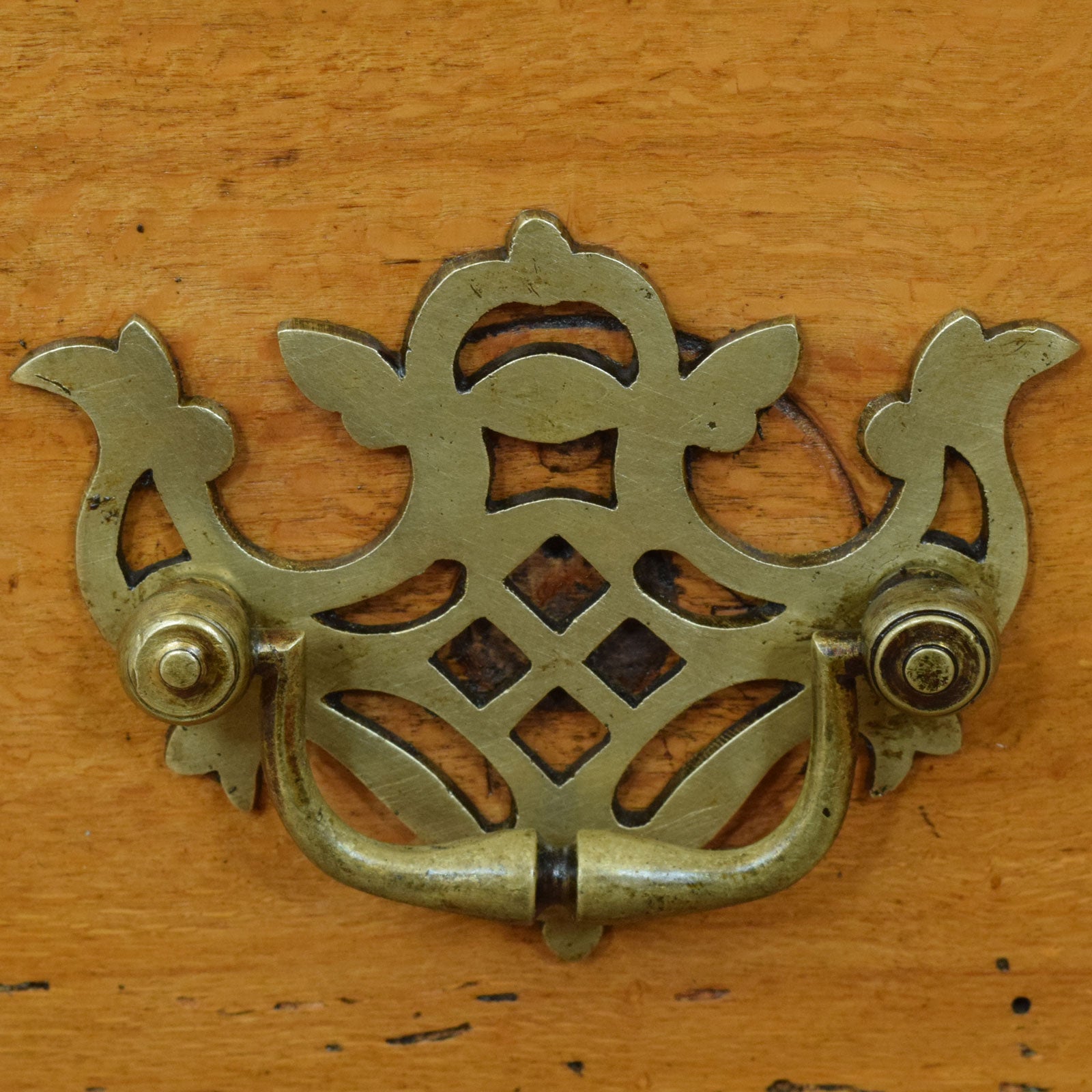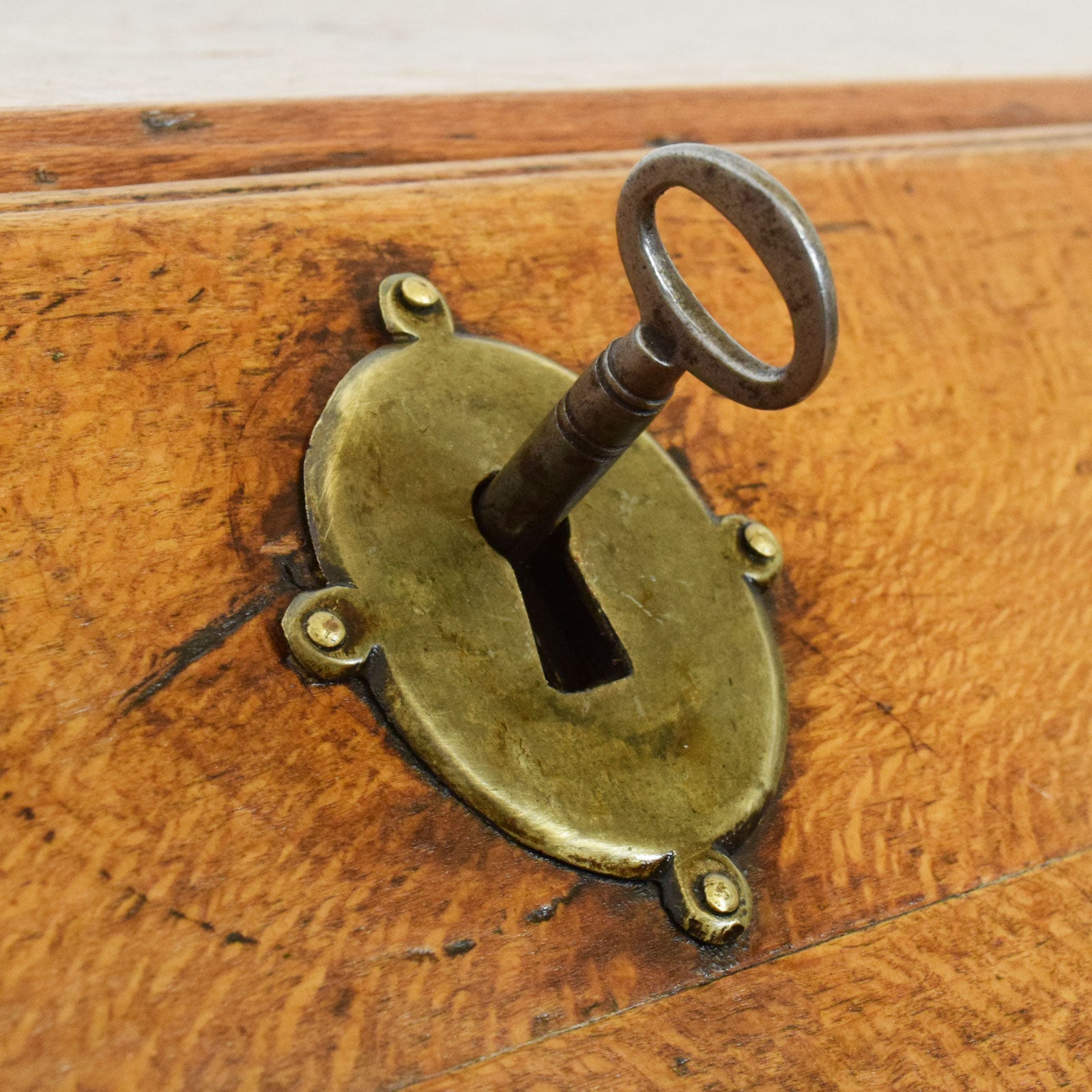This classic drop-front bureau features a sloped fall that opens with a working lock and key to reveal a fitted interior, complete with pigeonholes, small drawers, and a central locking cupboard. Below the writing surface sit four full-width drawers, each fitted with ornate brass handles and traditional keyholes. The fall-front is supported by two pull-out lopers, and the piece stands on shaped bracket feet. Crafted from solid oak with pine drawer bases and back, the bureau has a naturally textured grain and a mellow tone that gives it a warm and lived-in character.