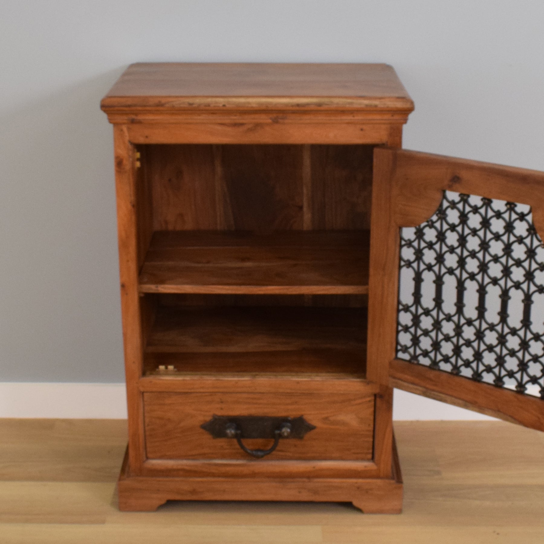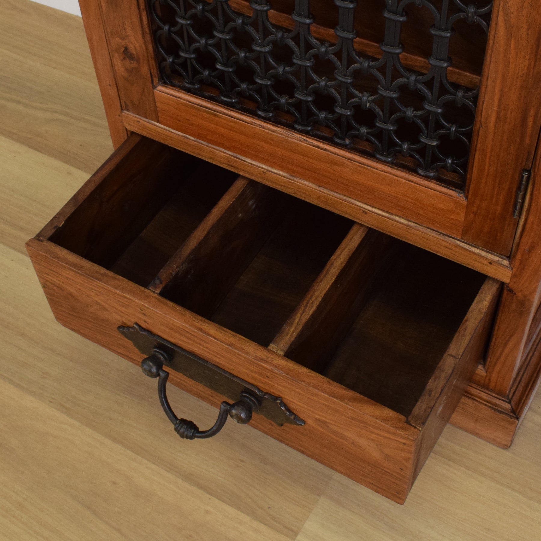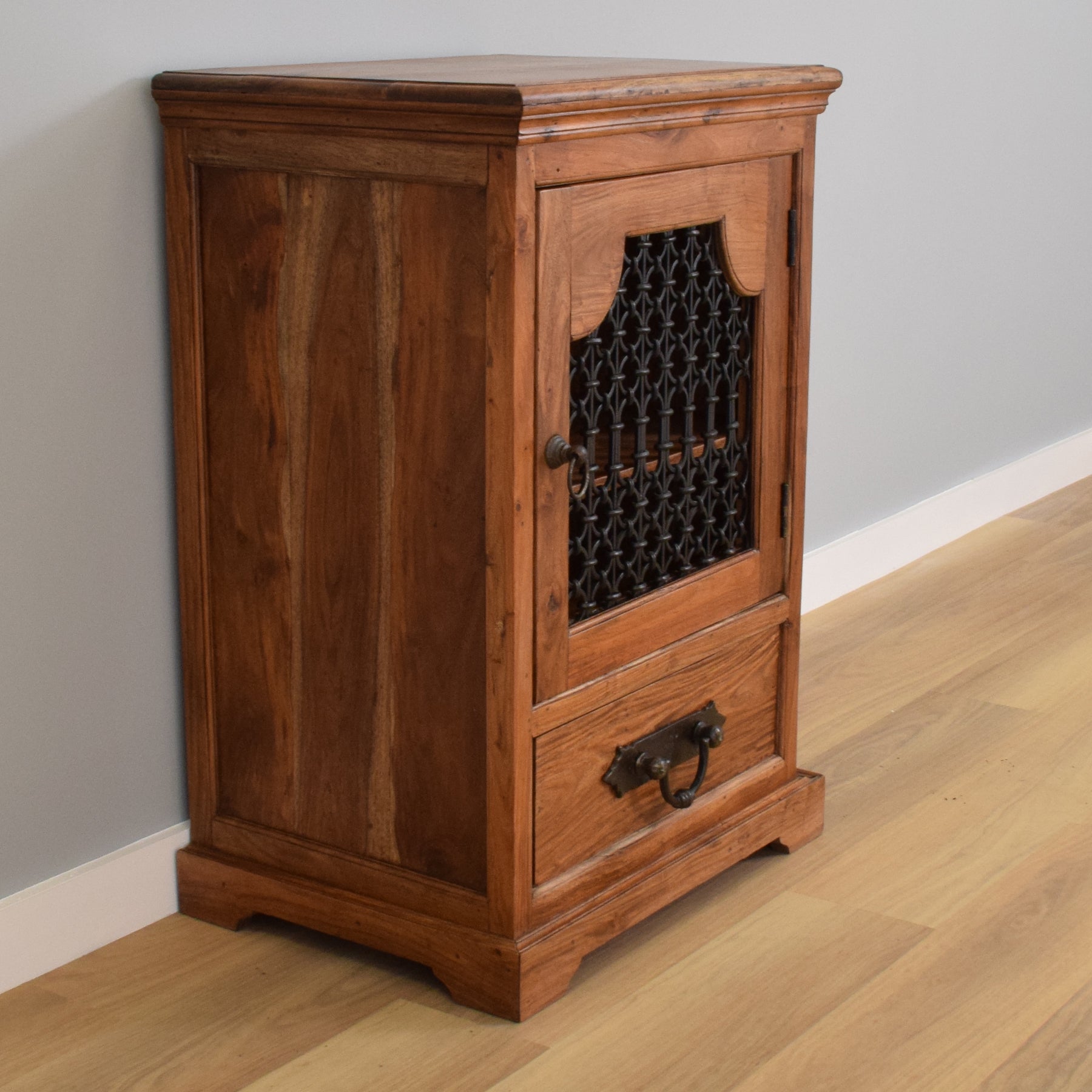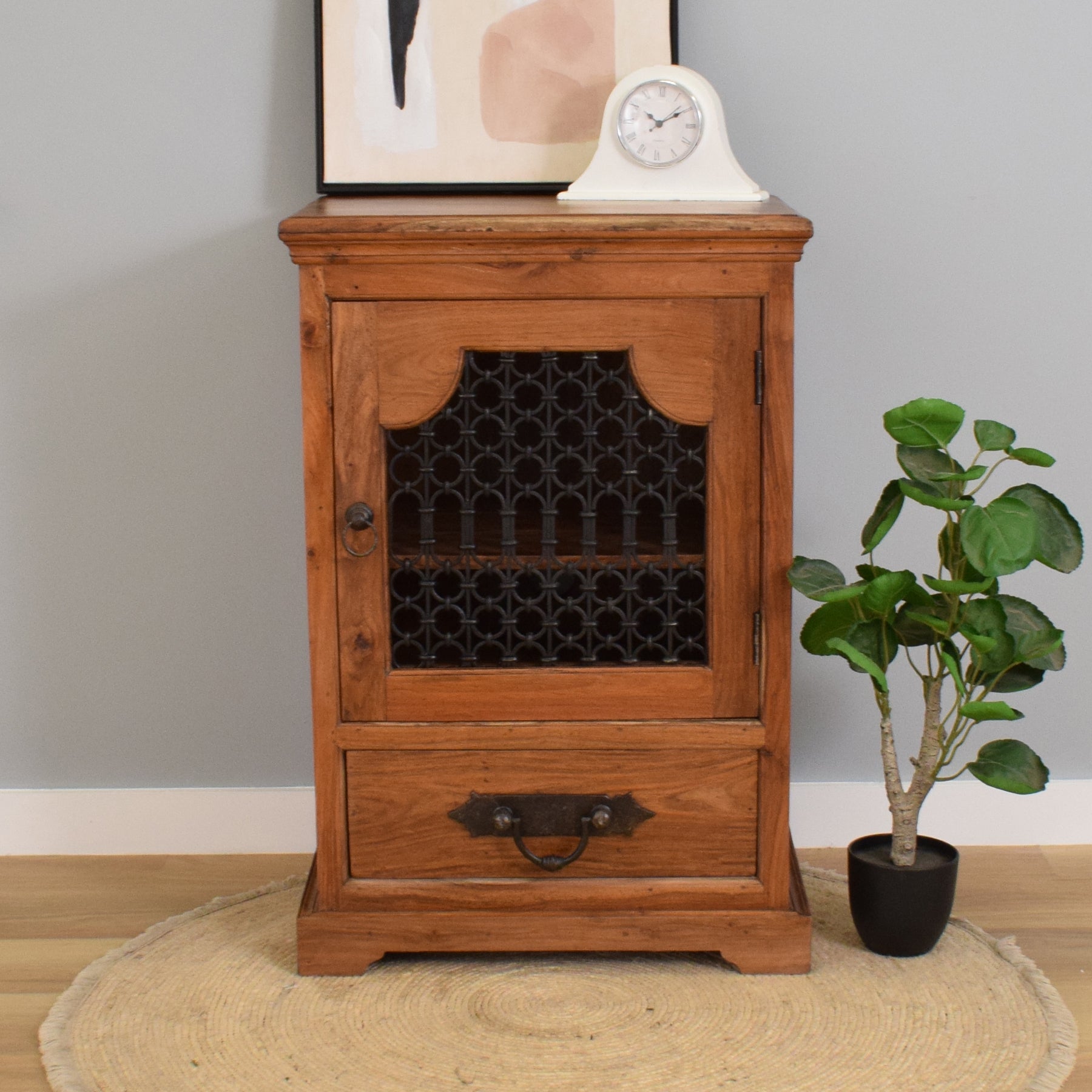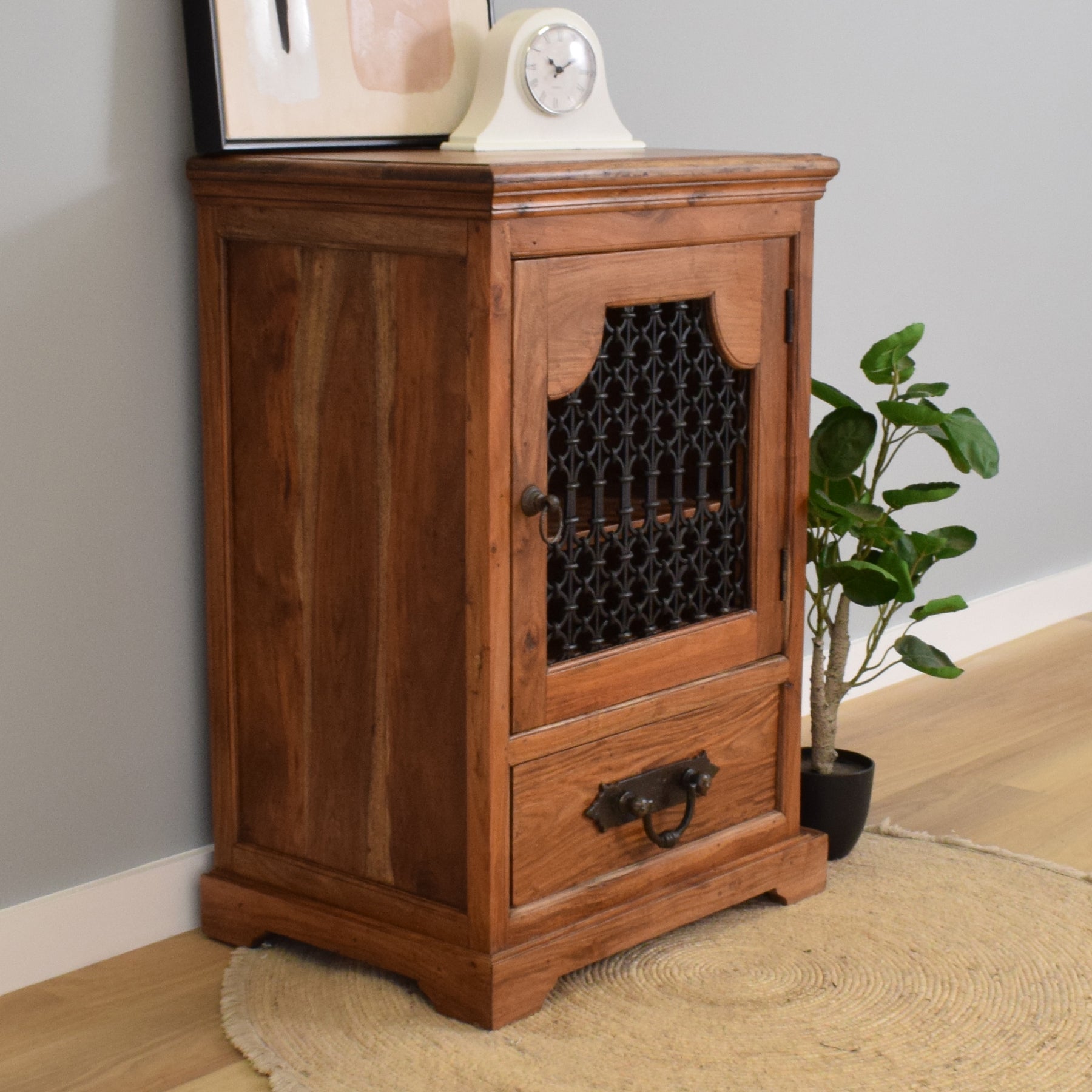 Crafted from solid sheesham, an Indian hardwood celebrated for its rich grain and durability, this cupboard features a single cabinet door adorned with an intricate wrought iron grille. Below, a spacious drawer provides additional storage, each with sturdy wrought iron handles that enhance its traditional look.