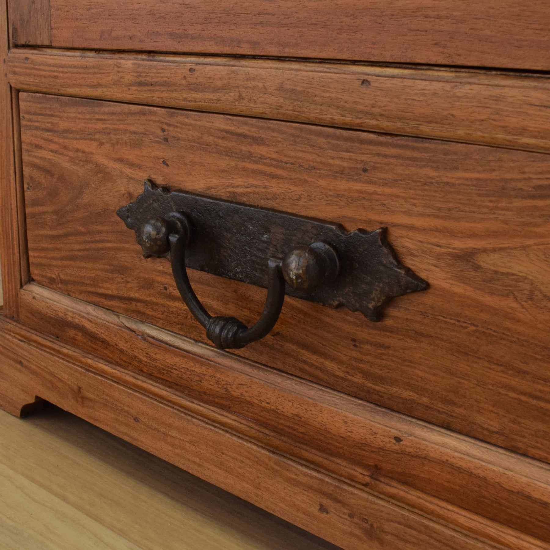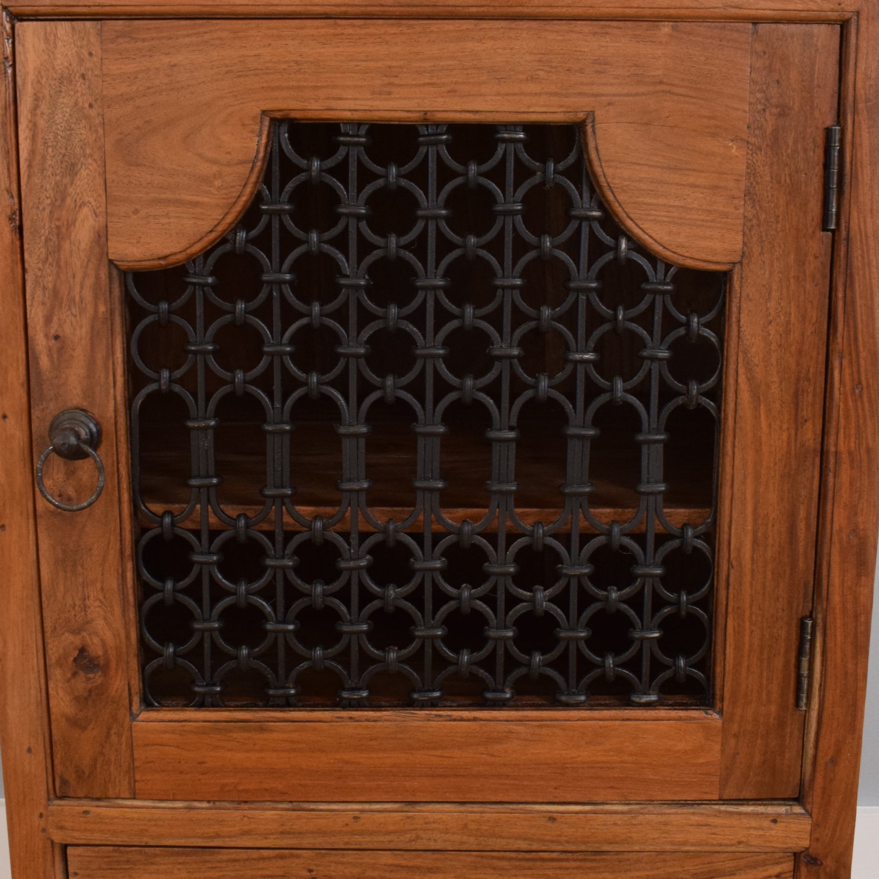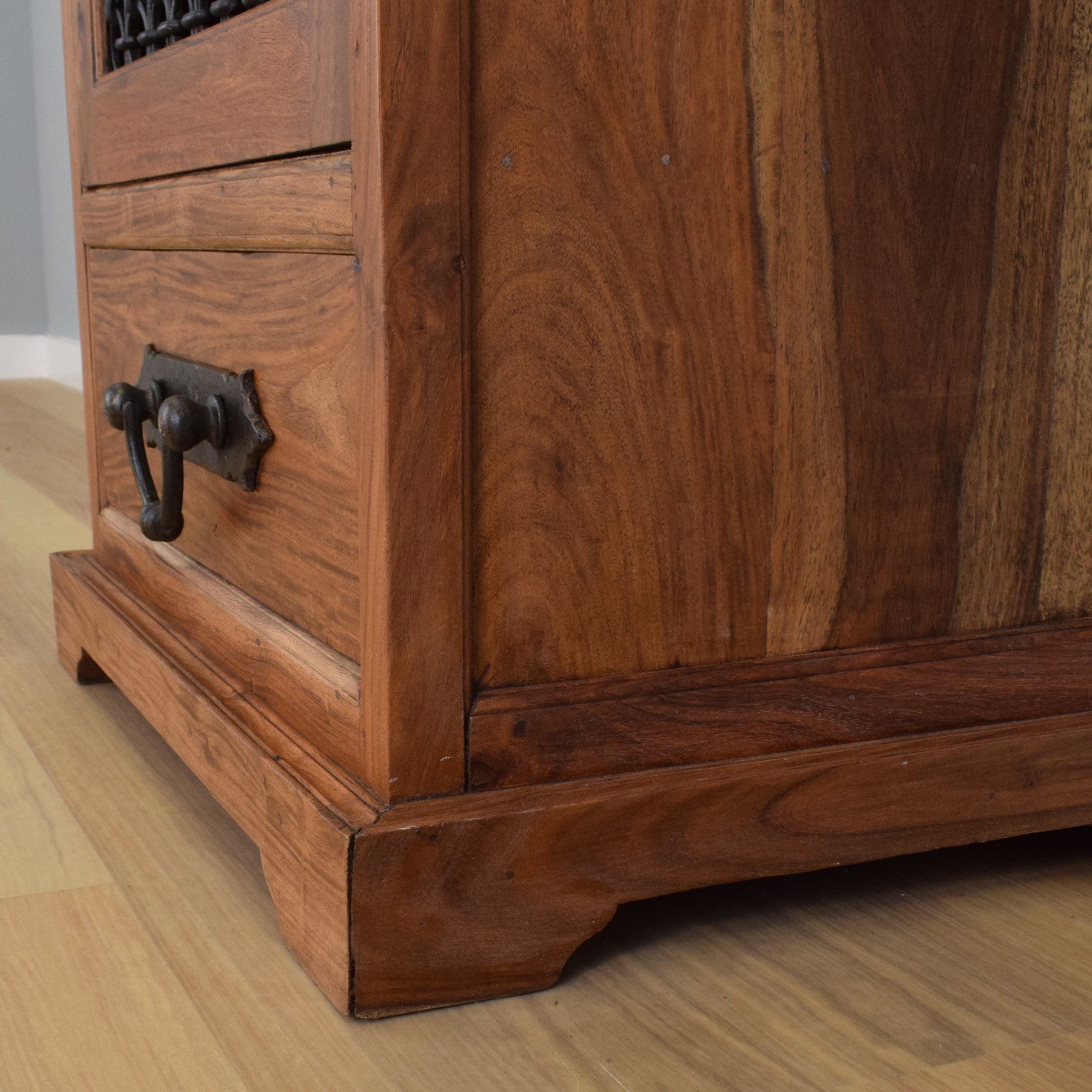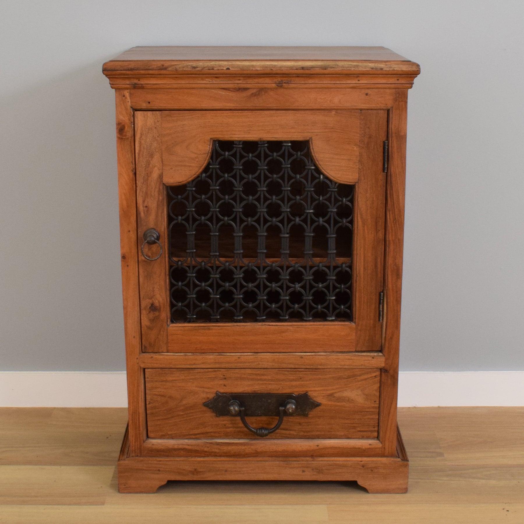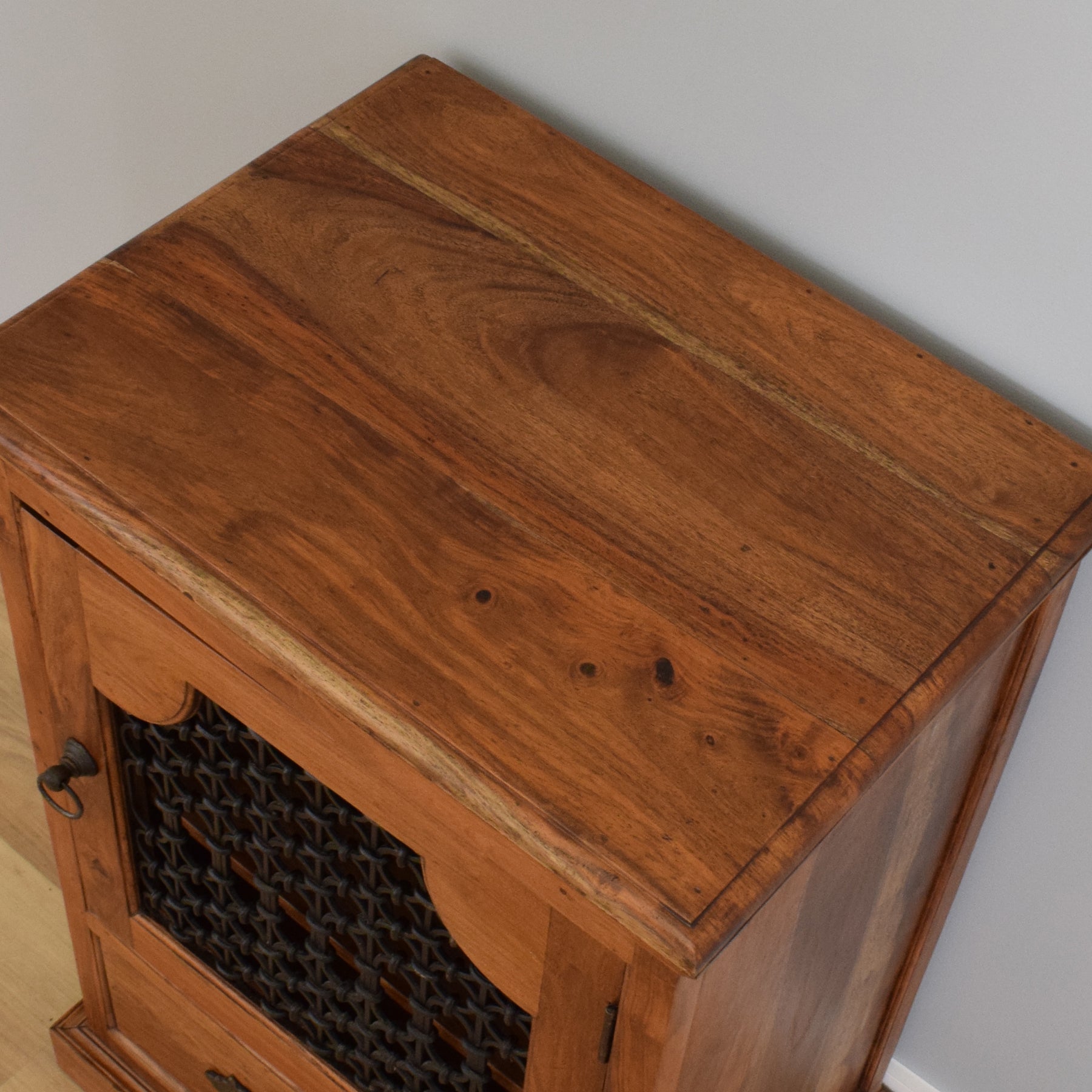 Crafted from solid sheesham, an Indian hardwood celebrated for its rich grain and durability, this cupboard features a single cabinet door adorned with an intricate wrought iron grille. Below, a spacious drawer provides additional storage, each with sturdy wrought iron handles that enhance its traditional look.