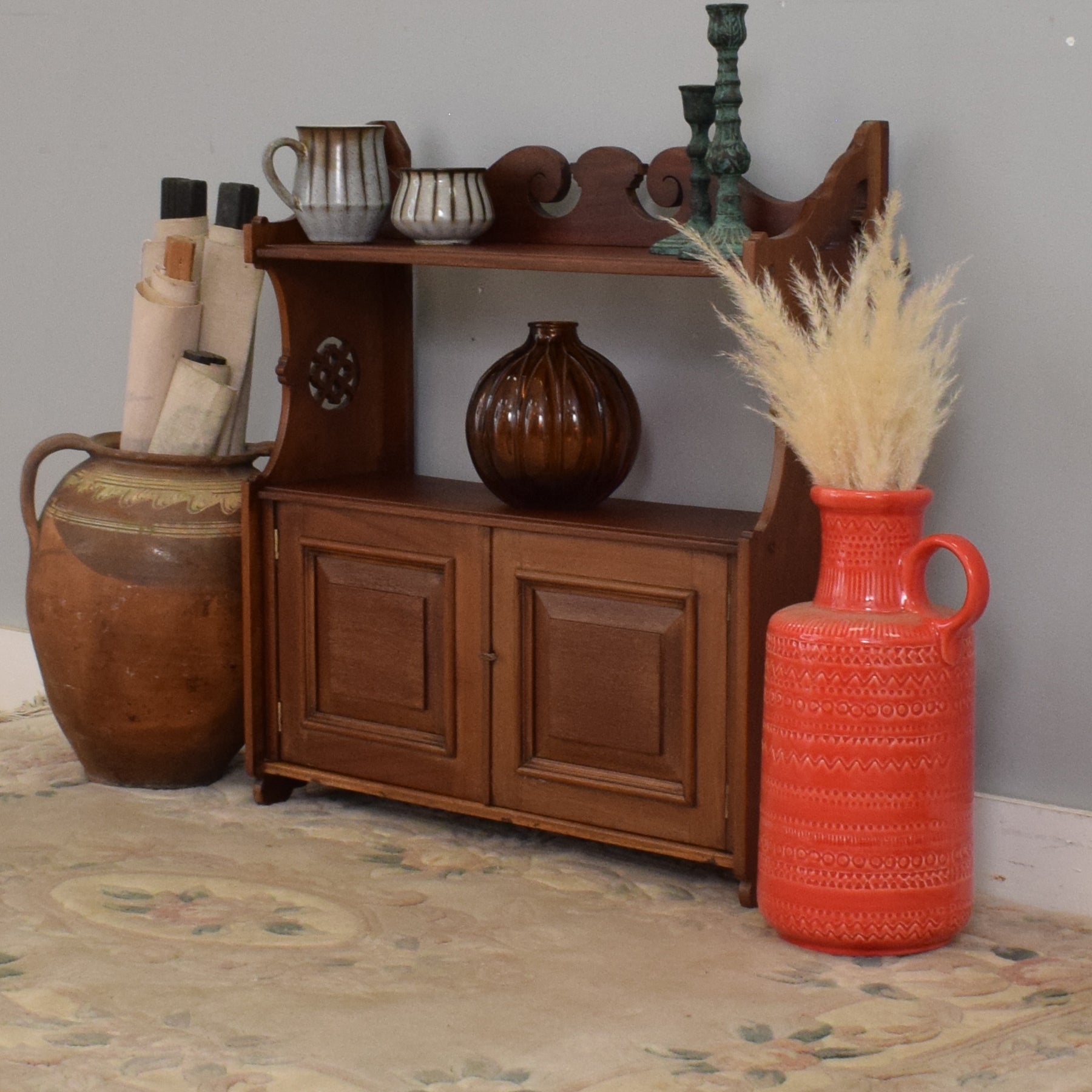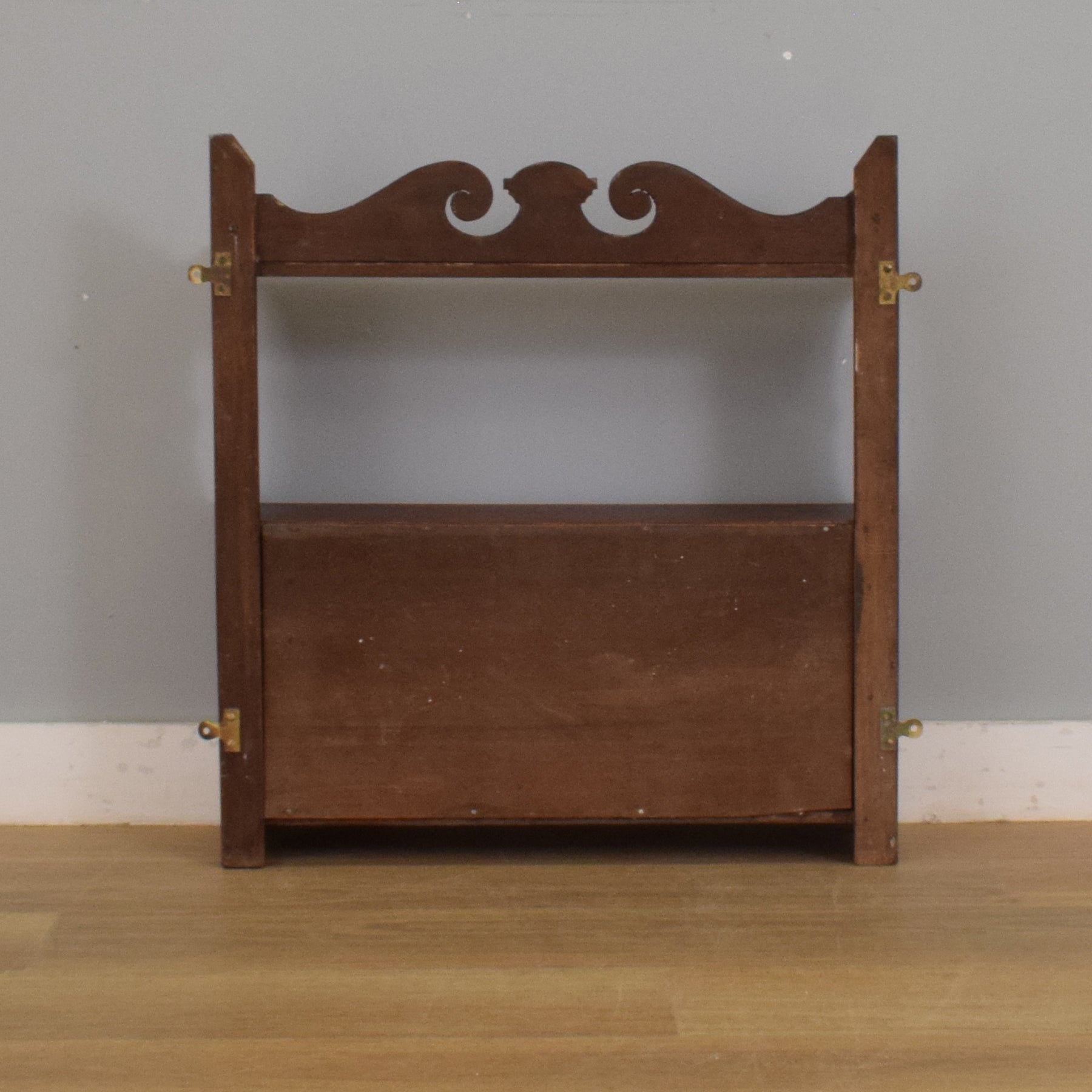 The piece features a shaped gallery top and decorative pierced side panels, adding a traditional feel. An open shelf provides space for frequently used items, while the double-door cupboard below offers concealed storage for jars, packets, or other kitchen necessities. Its small footprint makes it ideal for wall-mounting.
