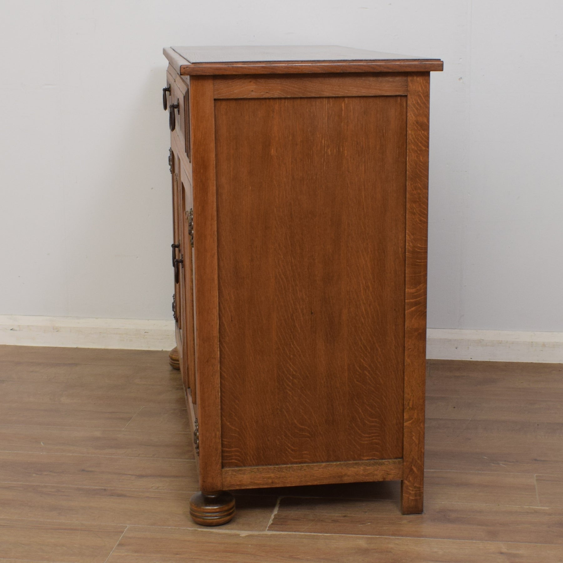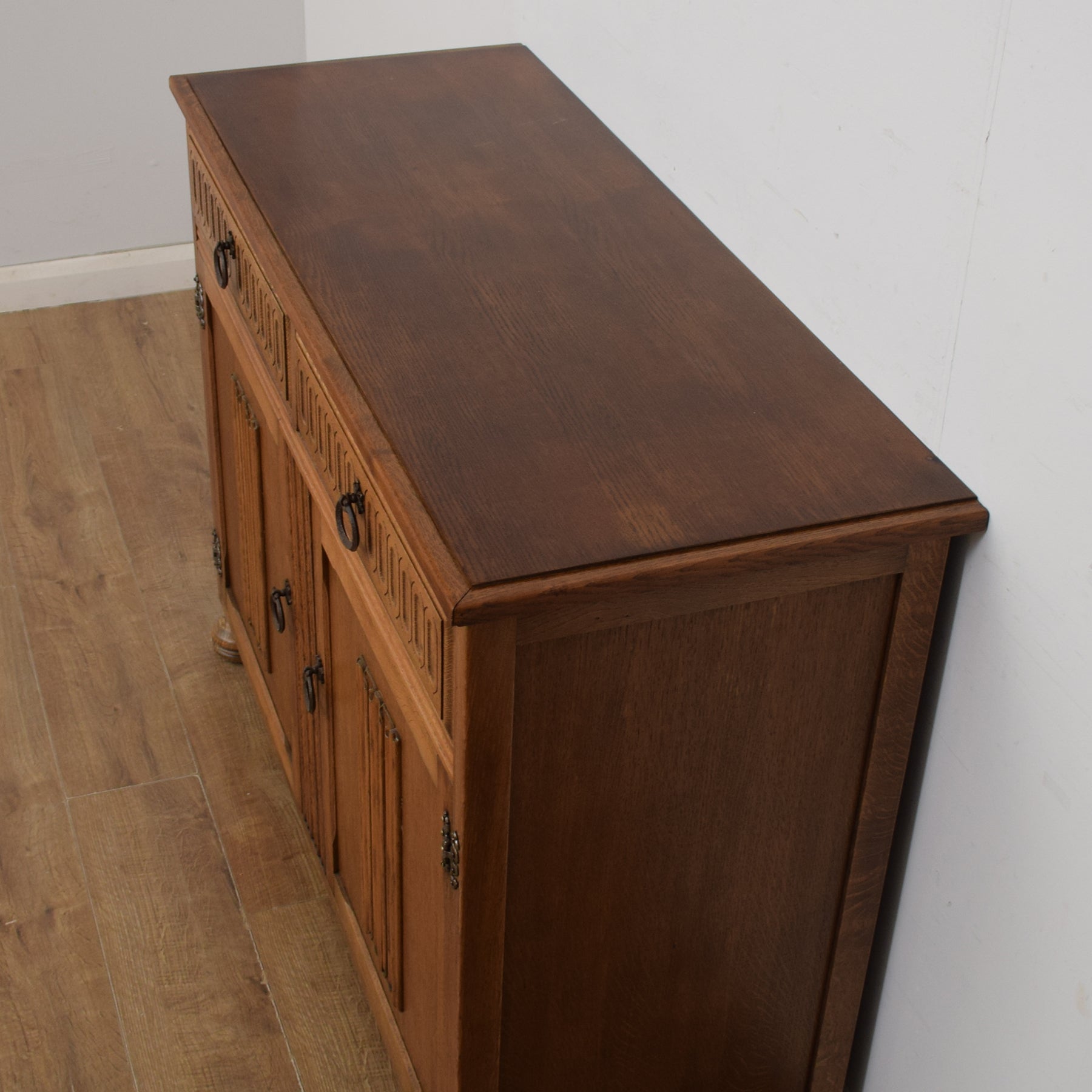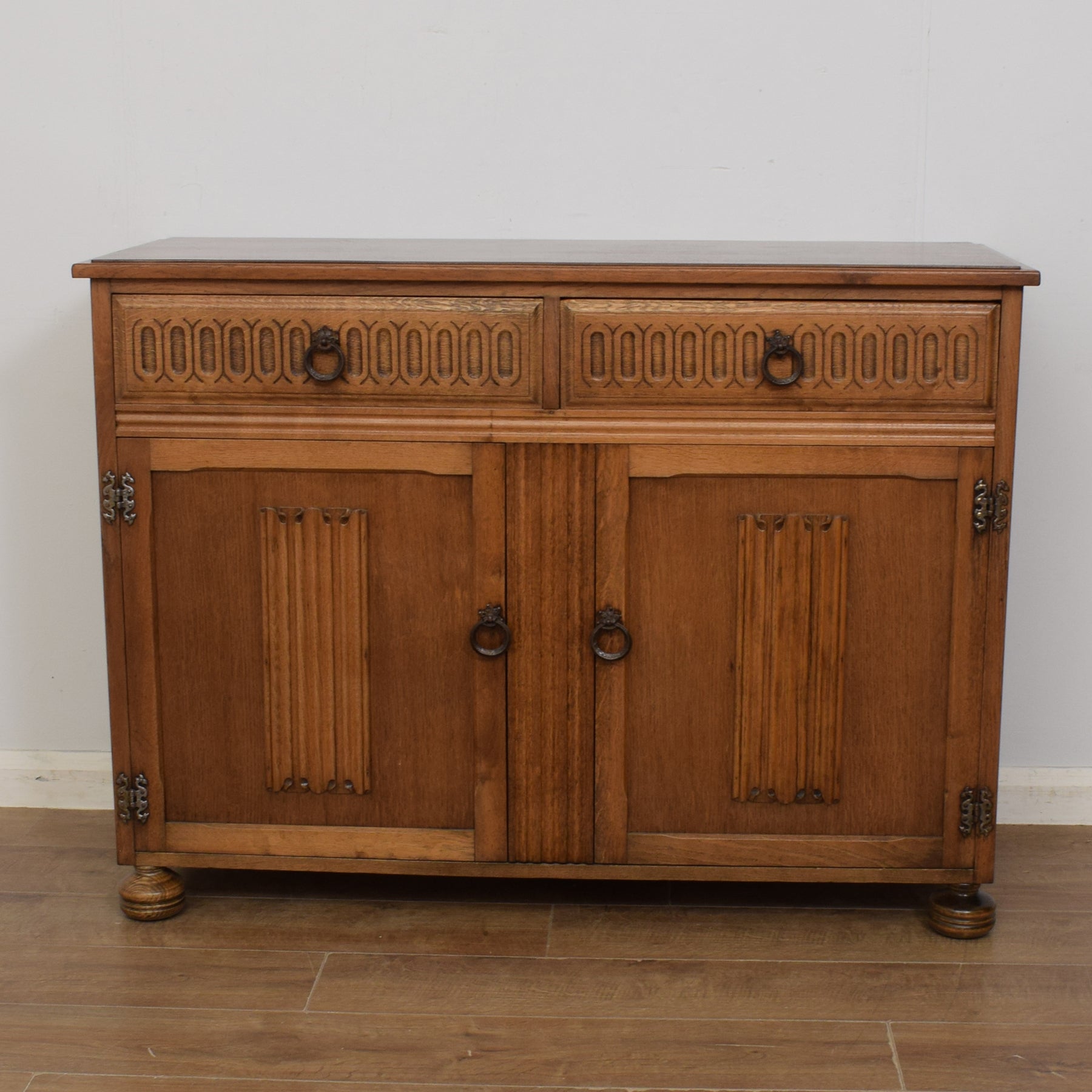 This oak two-drawer, double-door sideboard with attractive carved detail is sure to make a beautiful and practical addition to the lounge, dining room or other family space.