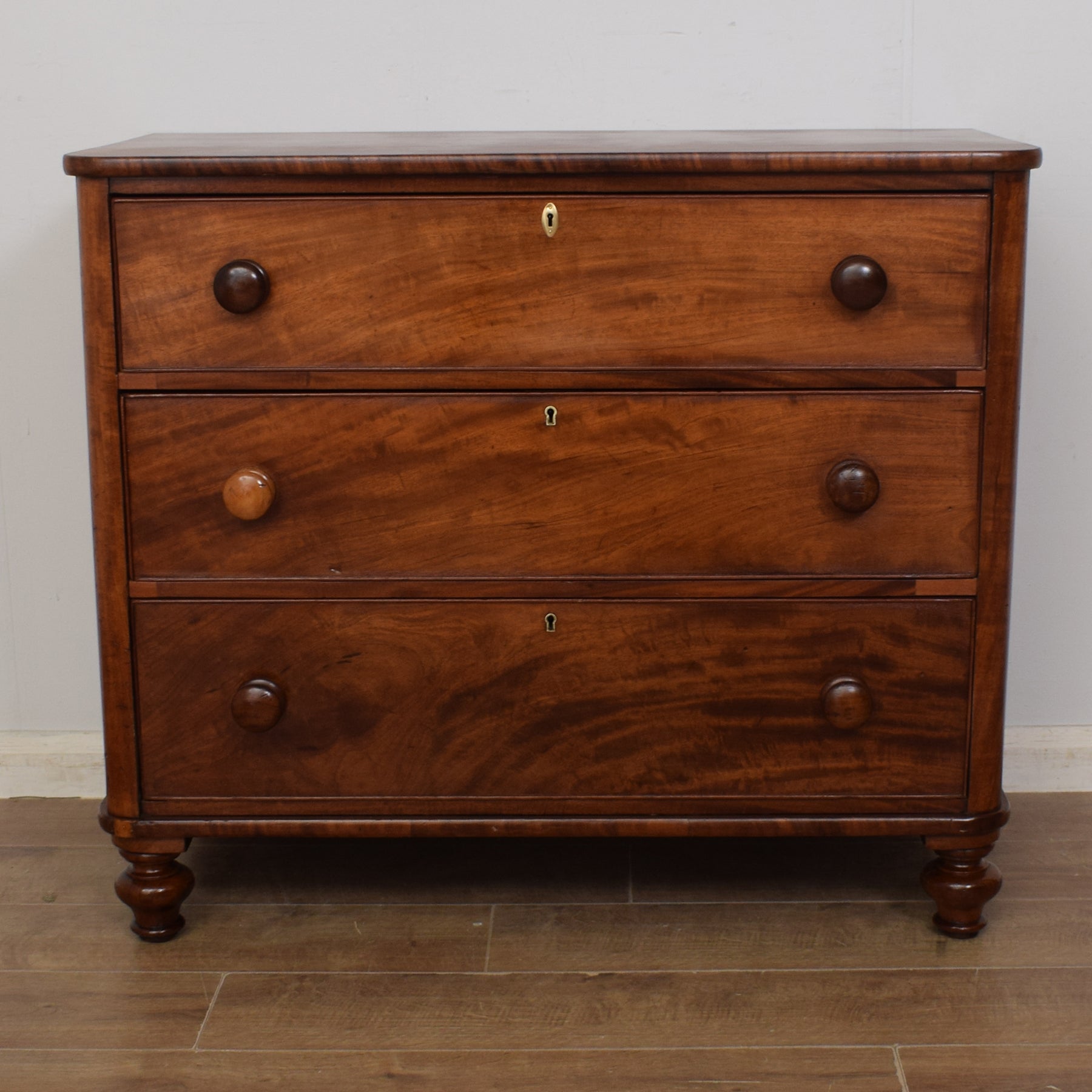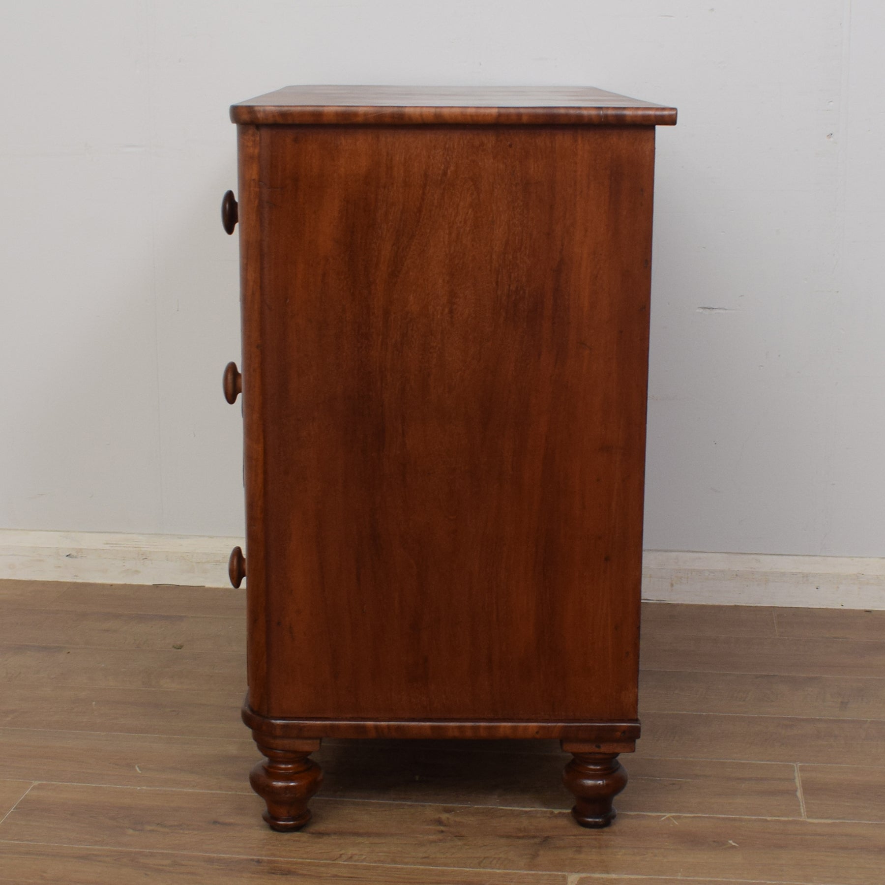 The three full-width drawers are generously deep, as is typical of Victorian-era chests, and all the handles are original to the piece. One of the handles is a different colour to the rest, providing a quirky finish to this piece. The drawers increase in depth as you go down. The large top surface is the perfect place for displaying a lamp or vase of fresh flowers or for arranging treasured photographs of loved ones. This chest of drawers is constructed from a mixture of mahogany and mahogany veneer with a pine carcass.