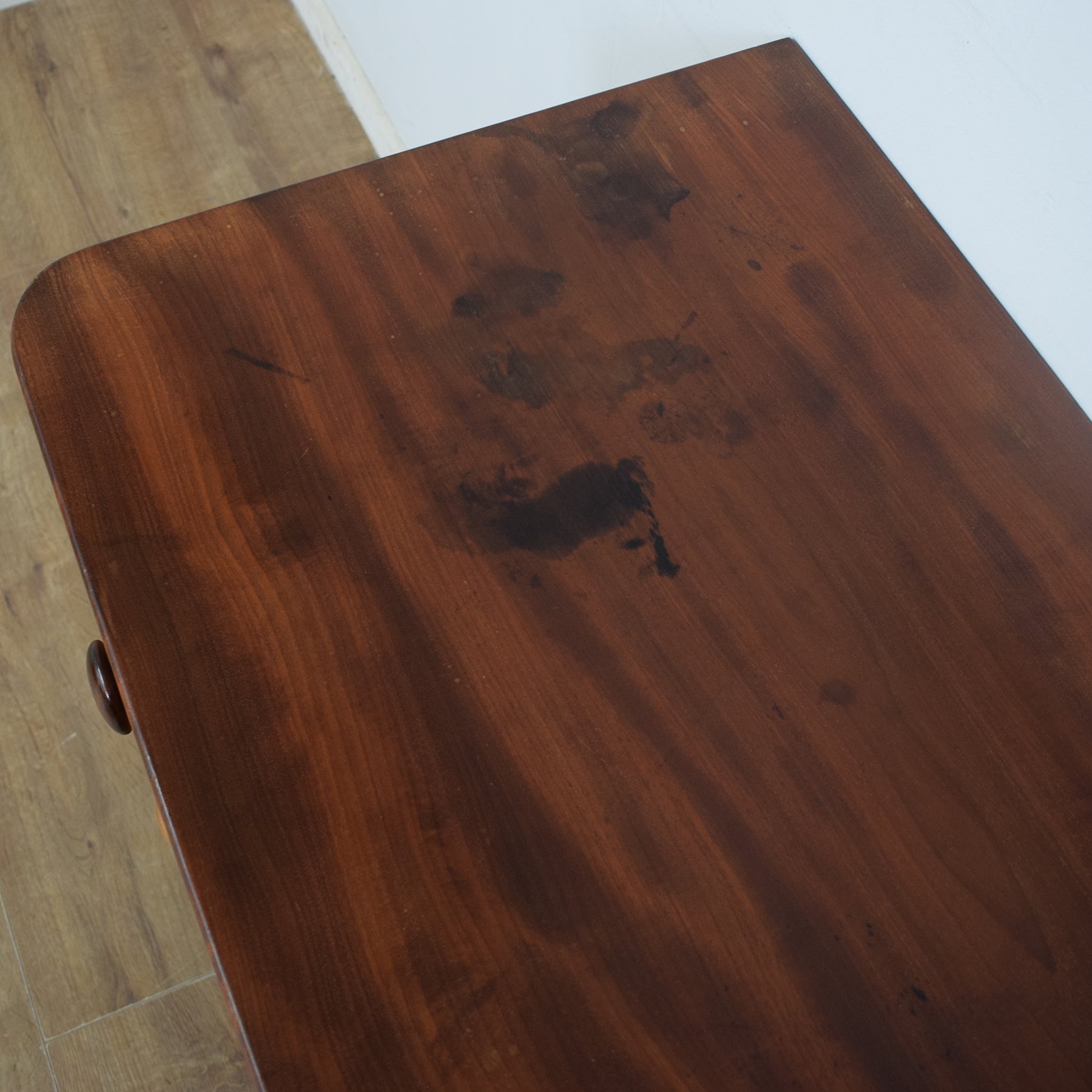 We have restored this chest of drawers by stripping back the old varnish before applying a clear lacquer to accentuate and preserve the rich tones of the mahogany grain. This is an antique period piece and therefore exhibits some signs of age and wear, with staining on top and a chip to the veneer, but is structurally sound and in excellent condition for its age. The imperfections can be seen in the photos.
