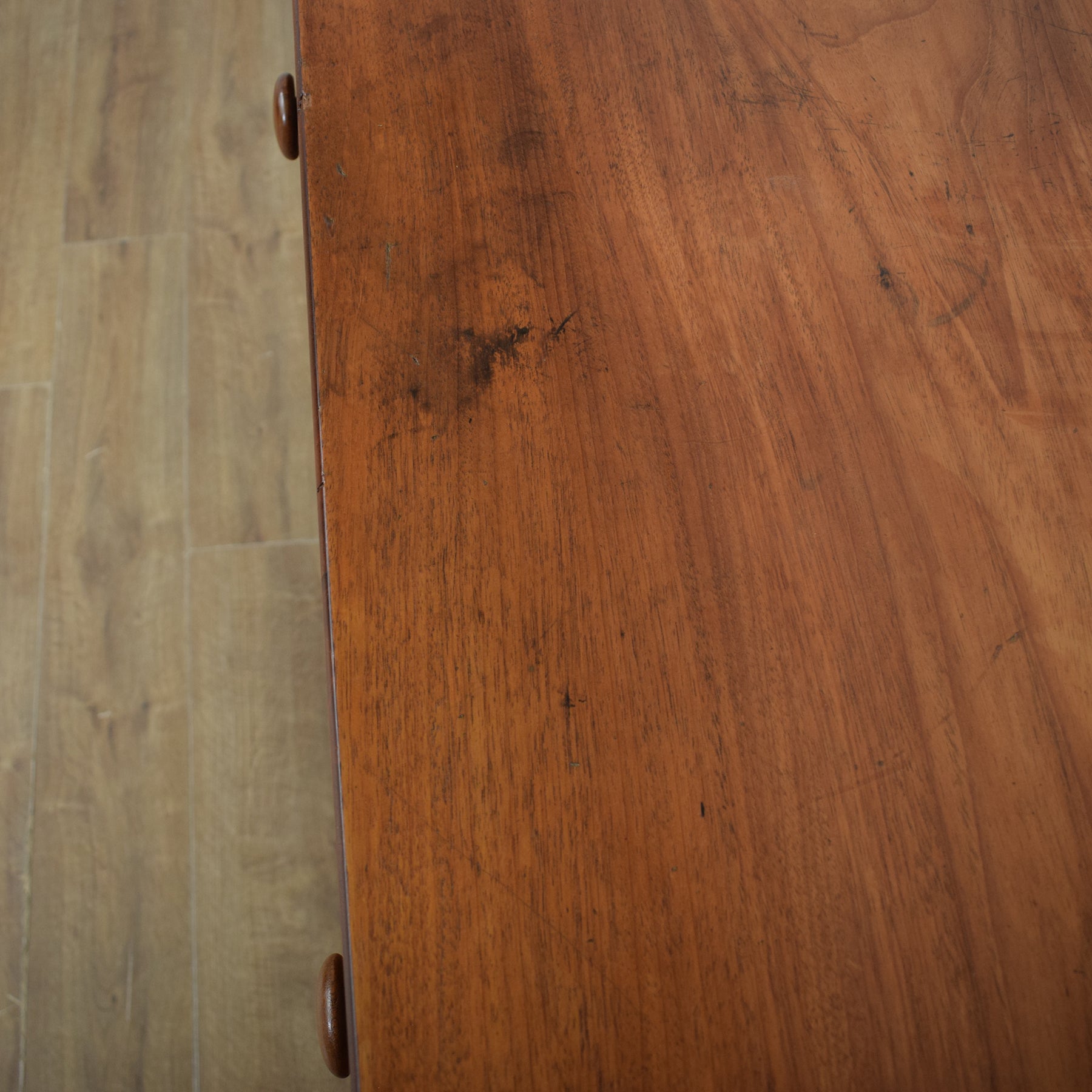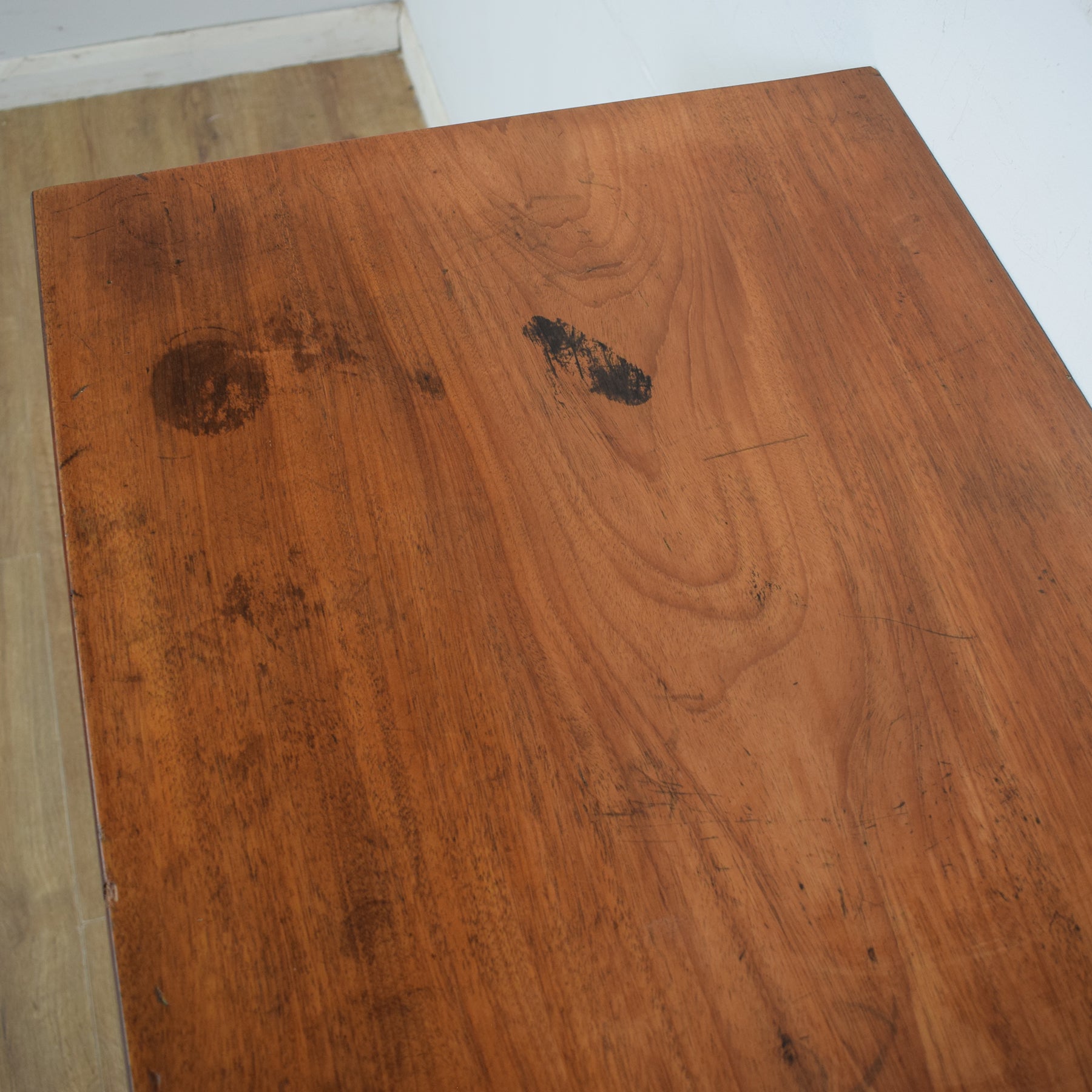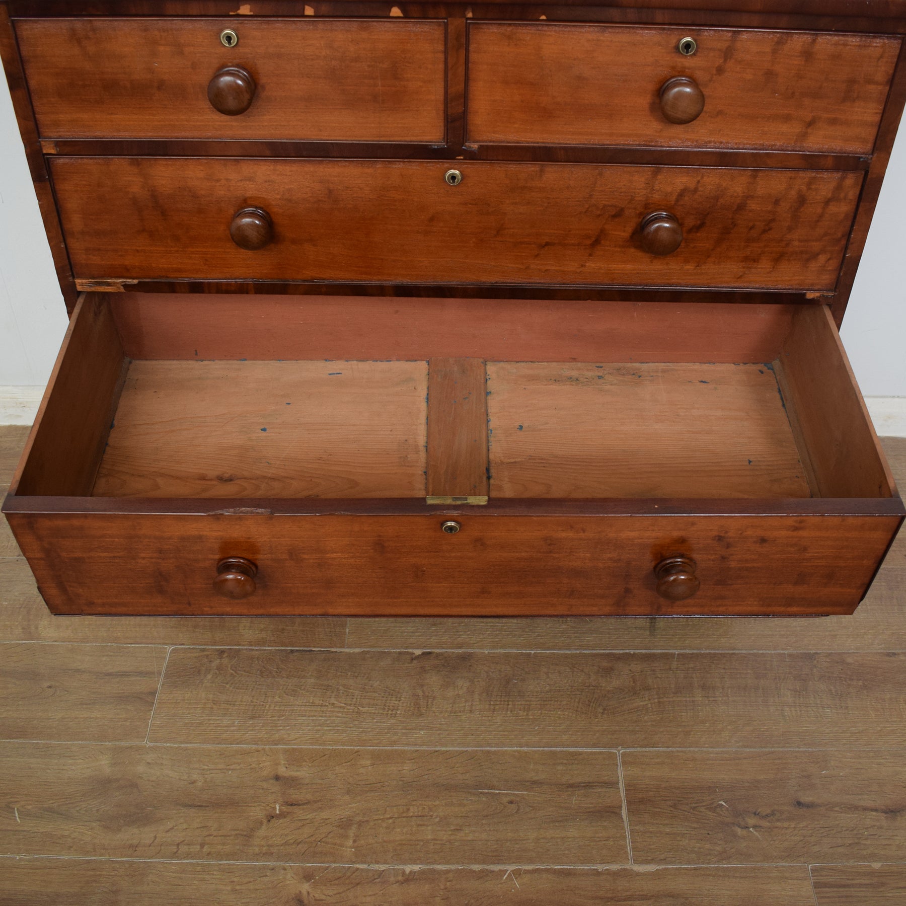We have restored this chest of drawers by stripping back the old varnish before applying a clear lacquer, to accentuate and preserve the rich tones of the mahogany grain. This is an antique period piece and therefore exhibits some signs of age and wear. The photos show some damage to the veneer, and staining on the top surface, however, this chest of drawers is structurally sound and in excellent condition for its rich heritage and age. It is constructed from mahogany and mahogany veneer with a pine carcass.