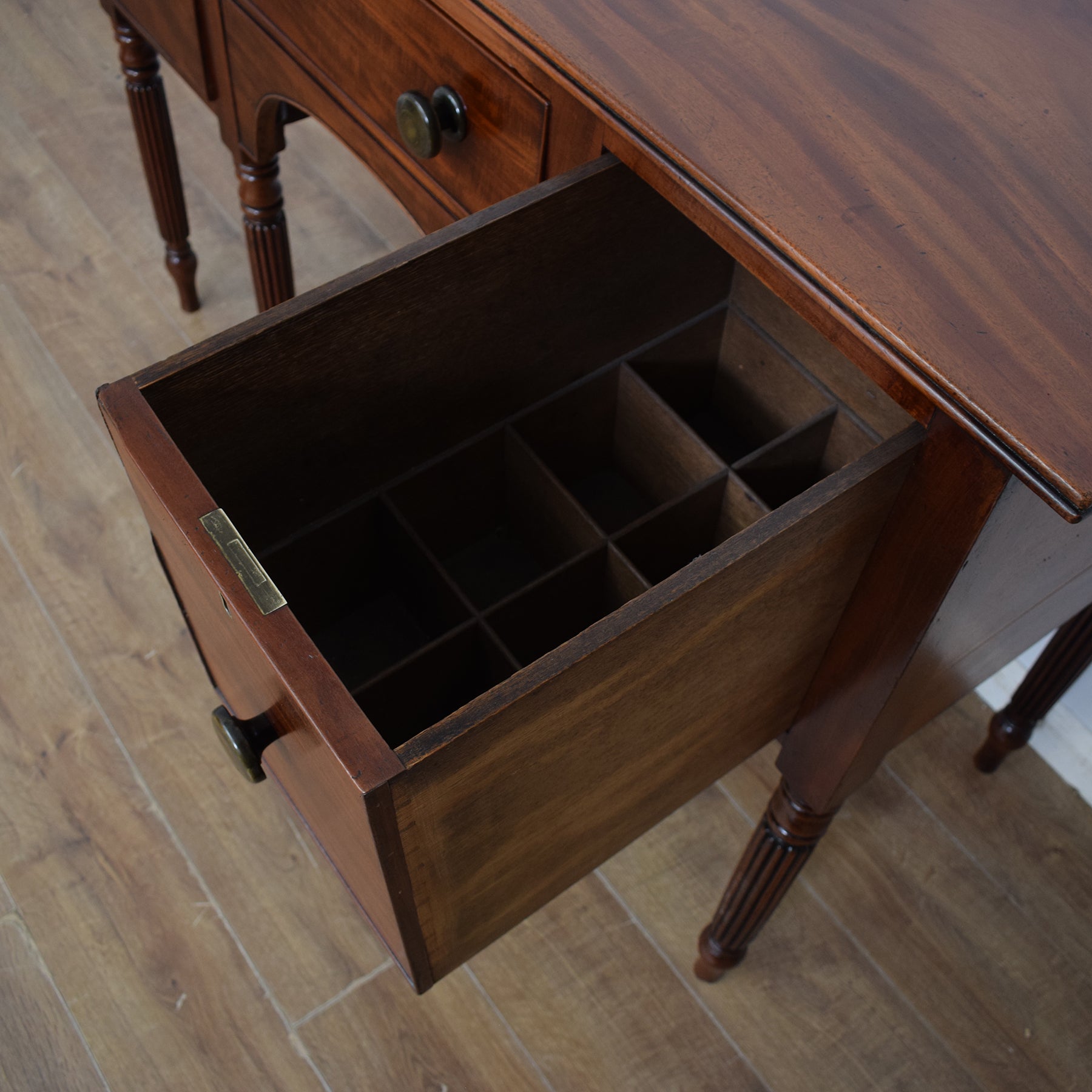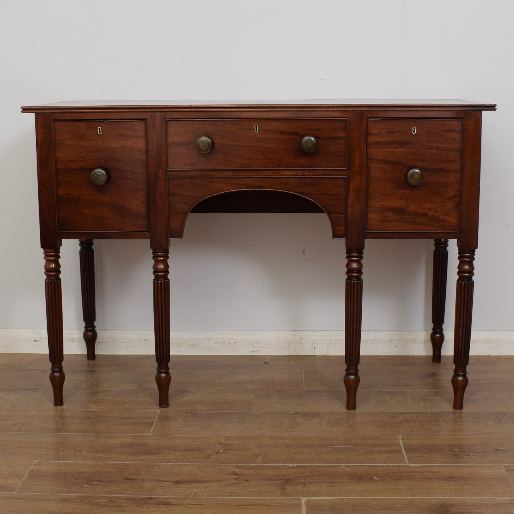 Our dedicated restorers have breathed new life into this sideboard by removing the old finish and applying a fresh coat of lacquer. This process not only enhances protection but also accentuates the natural colour and tones of the wood. The construction of this sideboard is predominantly solid mahogany; the drawers are constructed from oak and are covered in an attractive mahogany veneer.