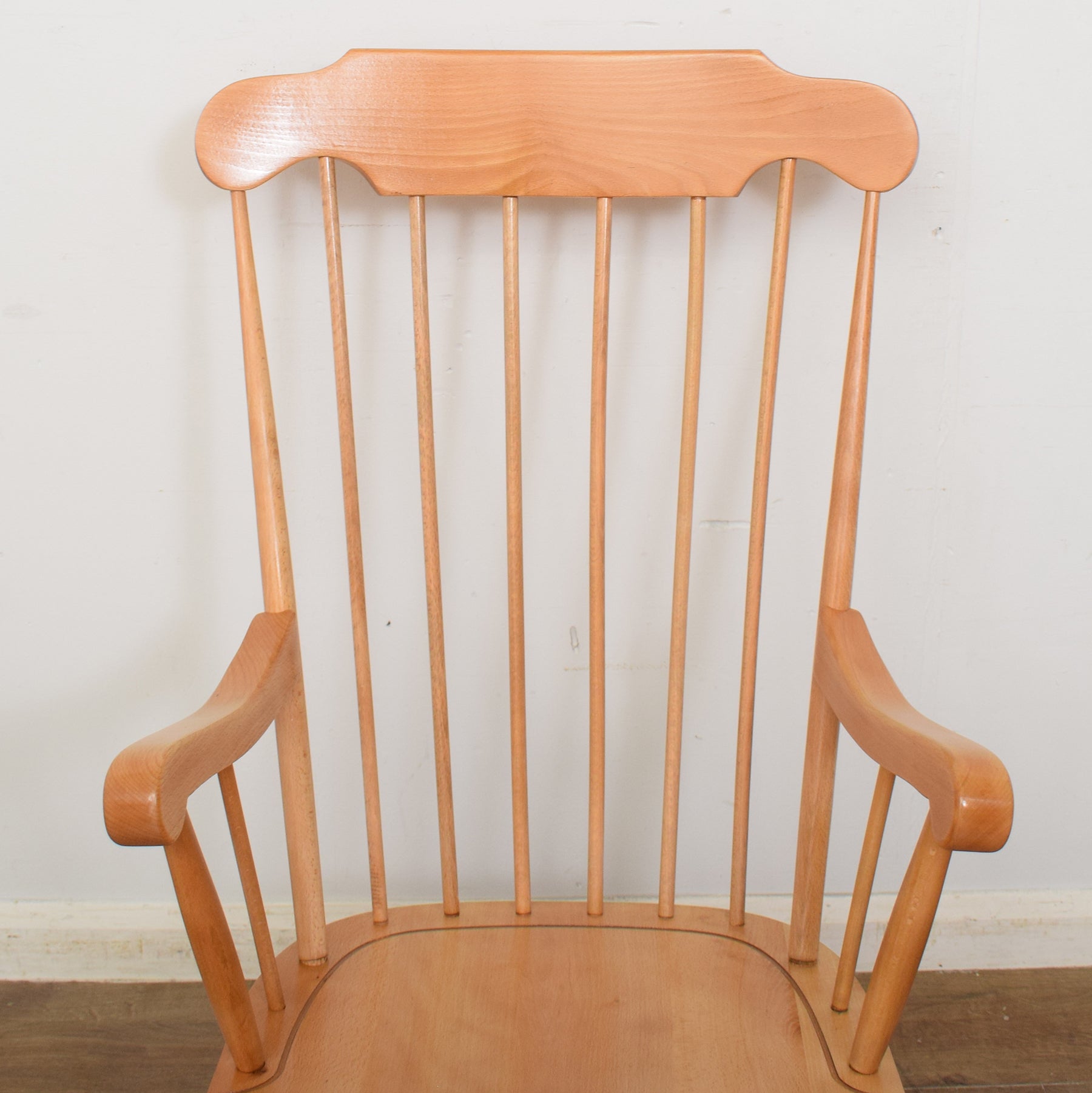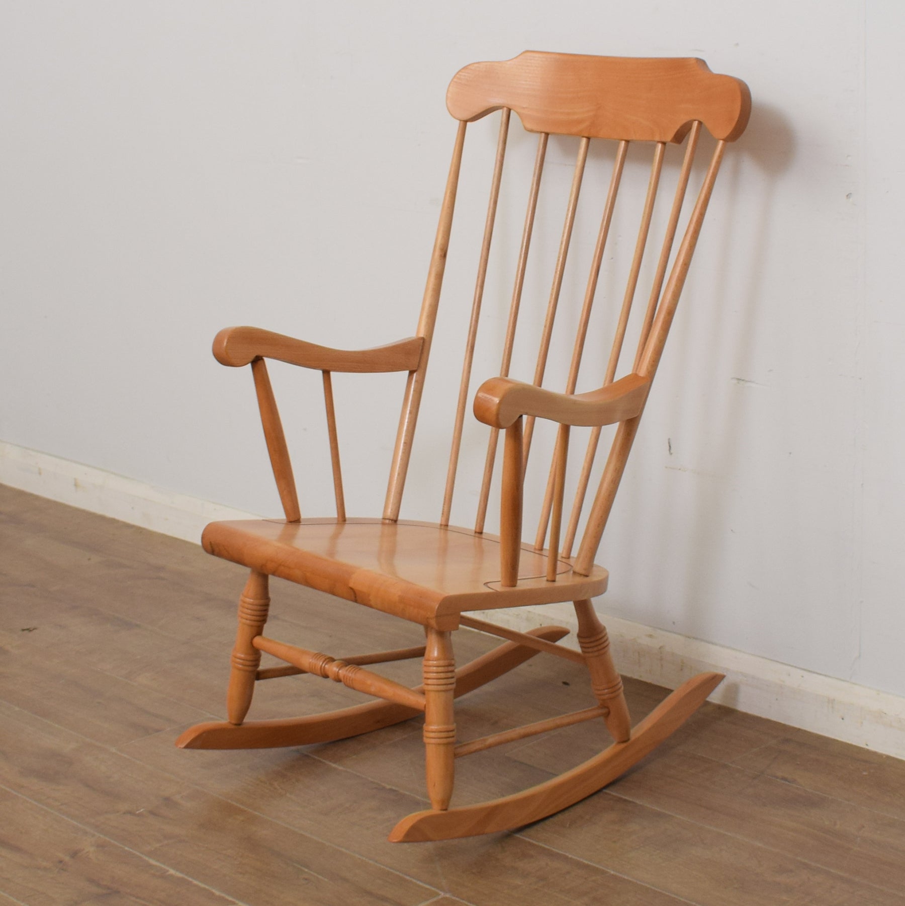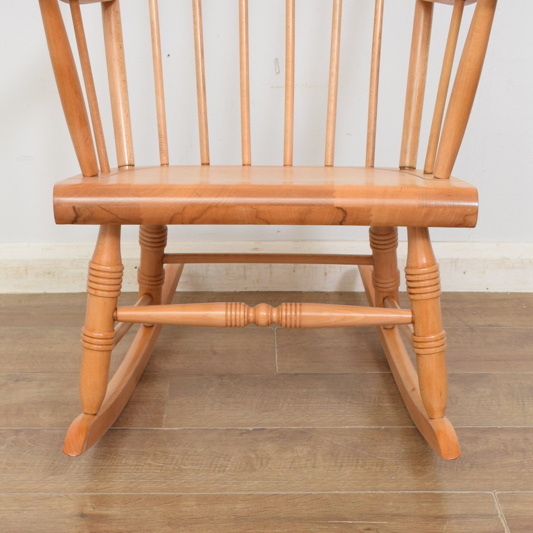 The chair features a high spindle back with a gently curved head rail, providing excellent support when relaxing. Its attractive armrests and smooth seat pad ensure comfort, while the slender rocking legs allow for a gentle, soothing motion. The turned stretchers supporting the frame ensure this chair has a solid base.
