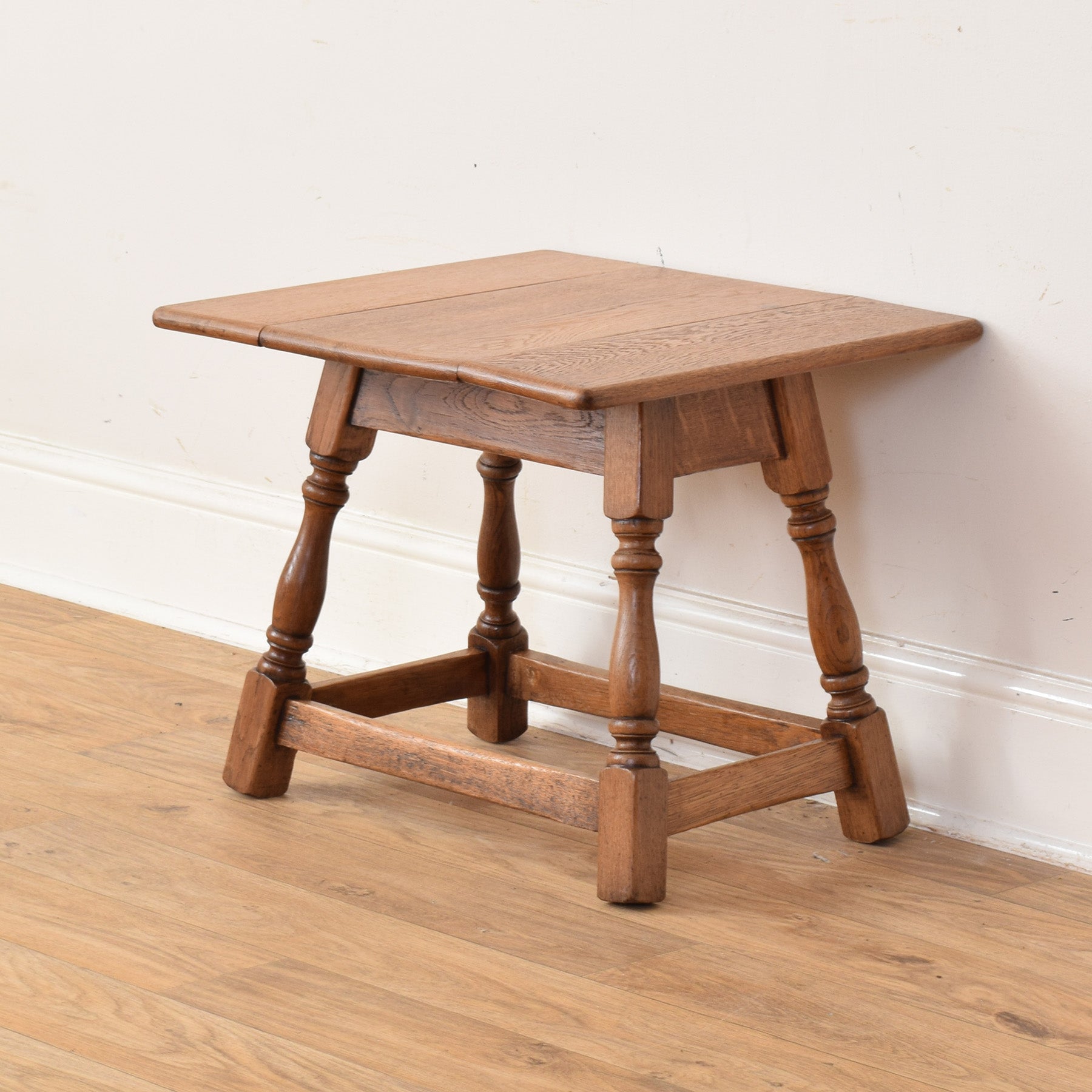 A small coffee table of this style brings a practical and traditional feel to a living room or snug. Its modest proportions make it easy to place alongside seating, while the rotating top and drop-leaf design allow the table to adapt to different uses, from everyday drinks to occasional extra surface space.