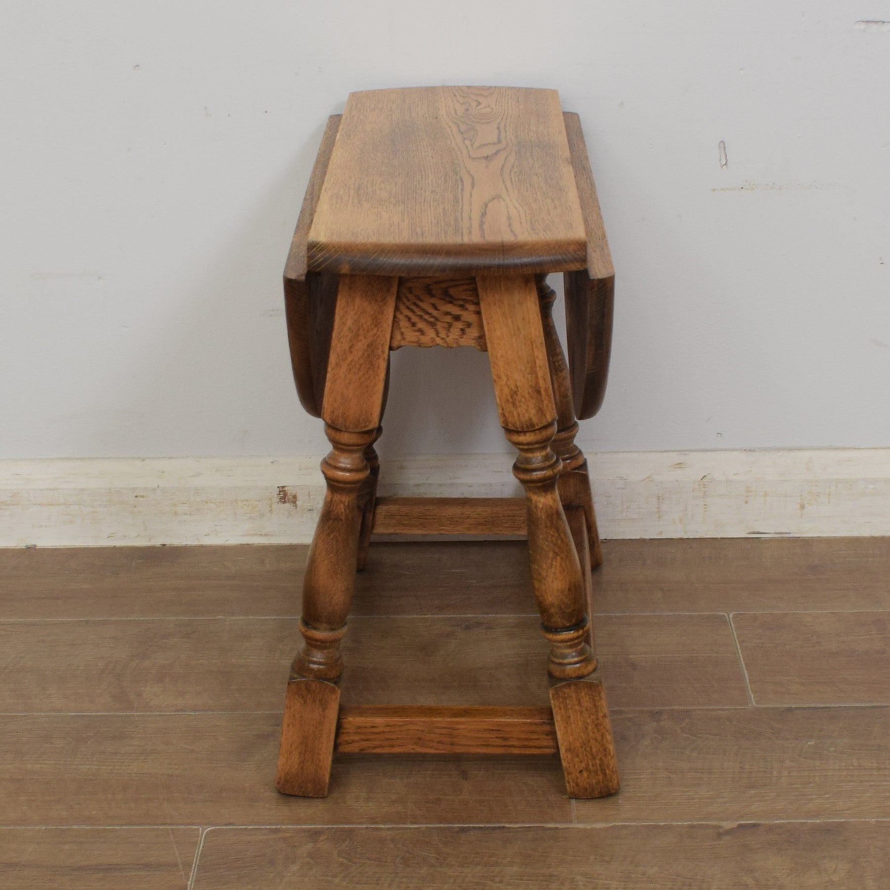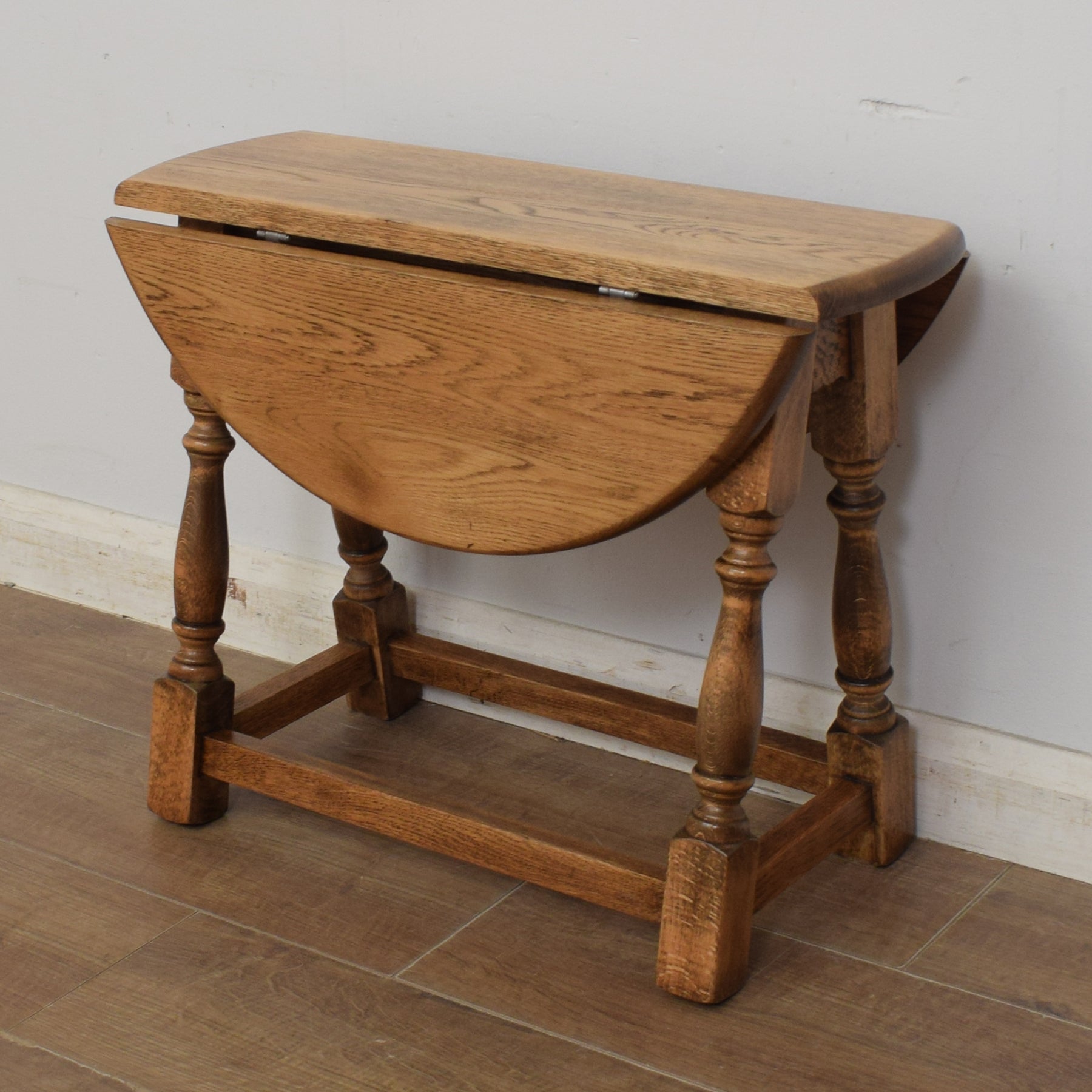 With its two extended leaves folded up, it provides ample space for a couple of coffee cups, a good book, or a laptop. When not in use, the leaves can be effortlessly dropped down by simply rotating the top through 90 degrees, a clever space-saving feature. The beautiful oak grain, attractive turned legs and solid stretcher base give this table plenty of visual appeal.