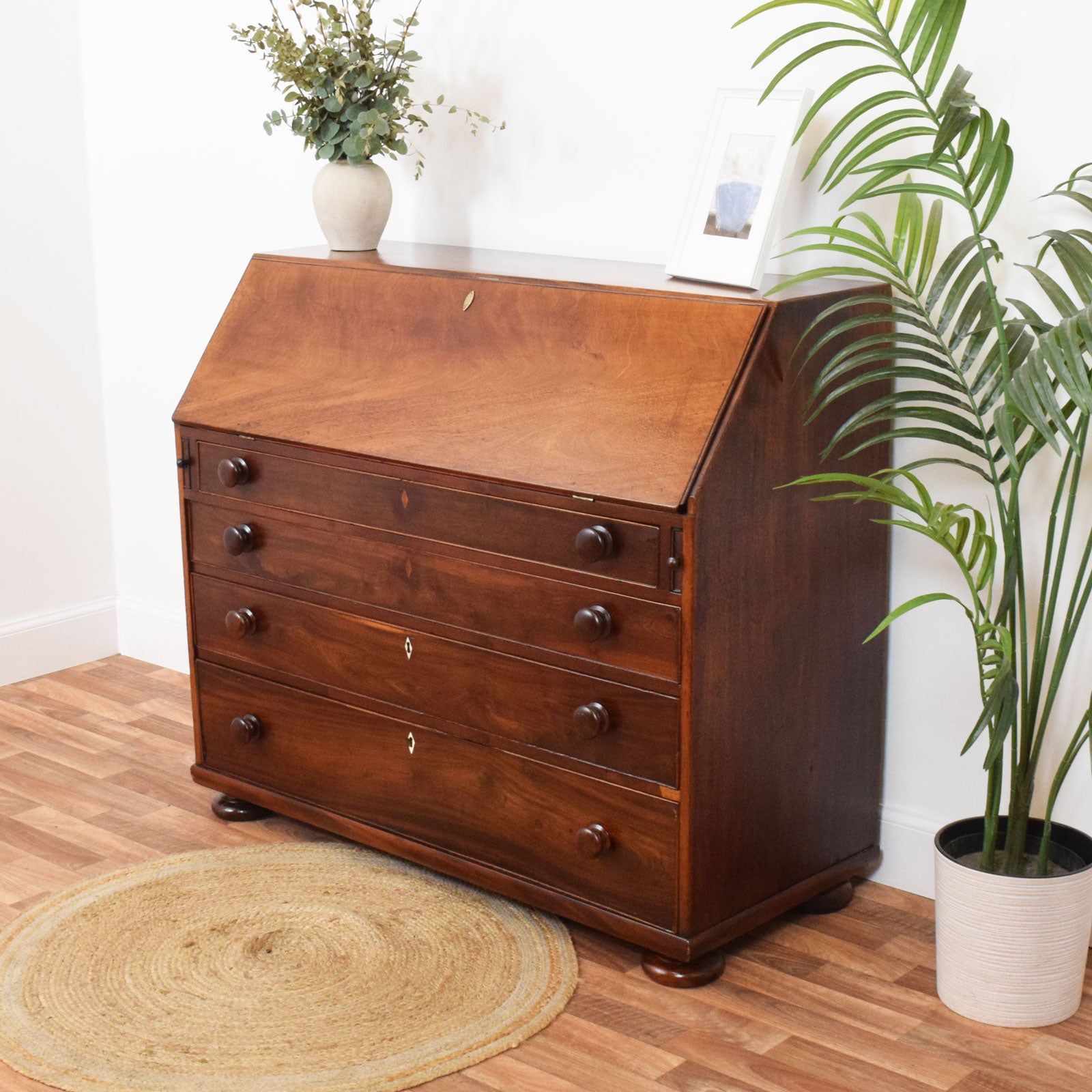 This early 19th-century bureau features a classic drop-front design that opens to reveal a beautifully detailed interior, complete with pigeonholes, eight small inlaid drawers, and a central cupboard door with a striking compass star motif. Inside, a concealed tray and two more small drawers add an extra touch of interest. The fall-front is supported by traditional pull-out runners and retains a working lock and key, as does the central cupboard. Below, four full-width drawers offer generous storage, though all drawer locks are missing. The top two drawer keyholes have been neatly filled with mahogany for a clean appearance. The piece rests on turned bun feet and retains its original turned wooden knobs.