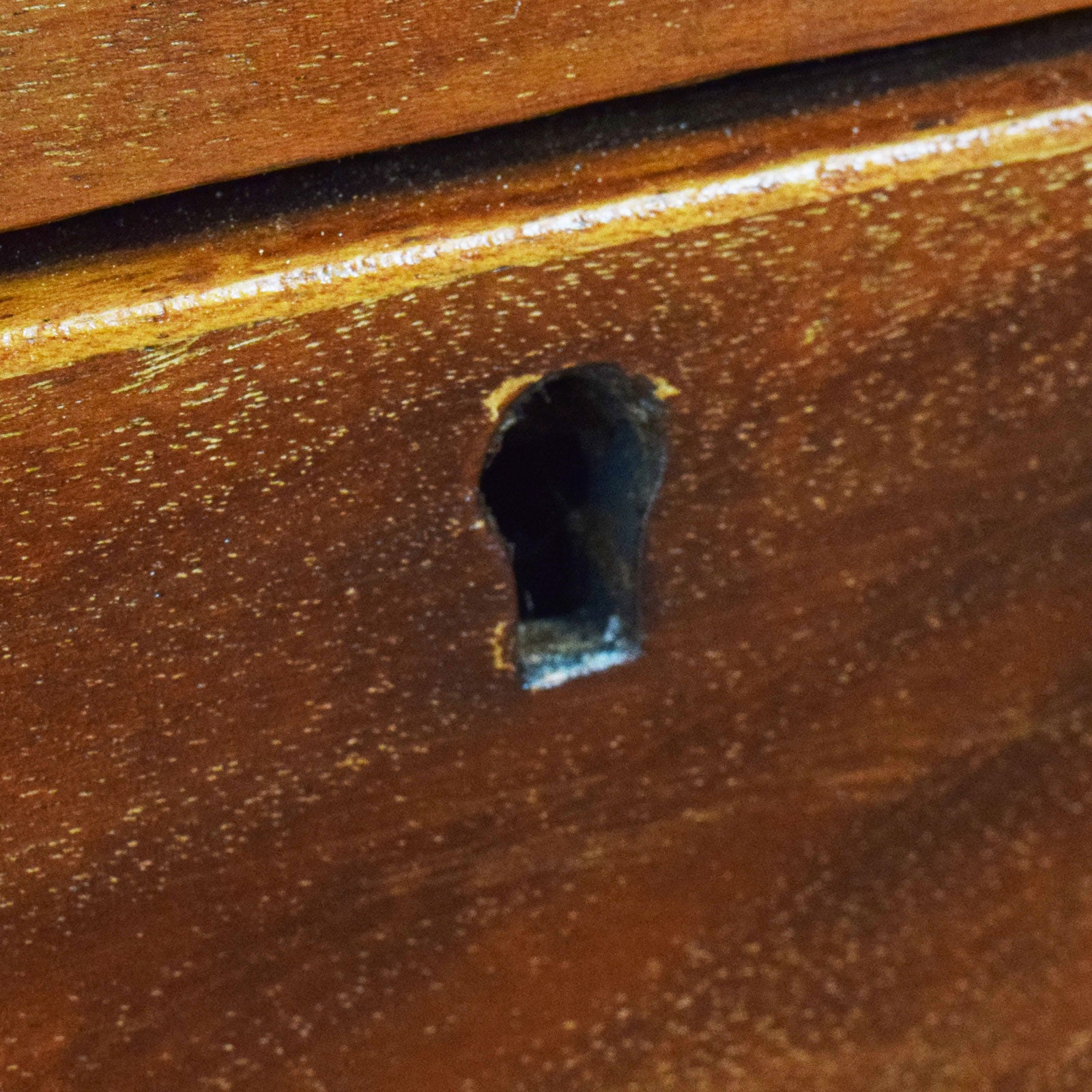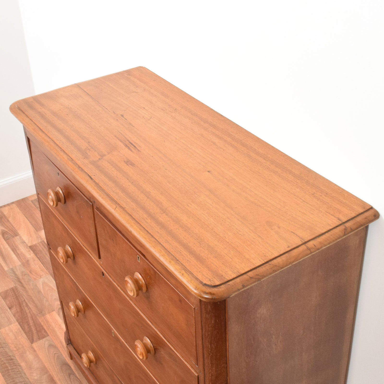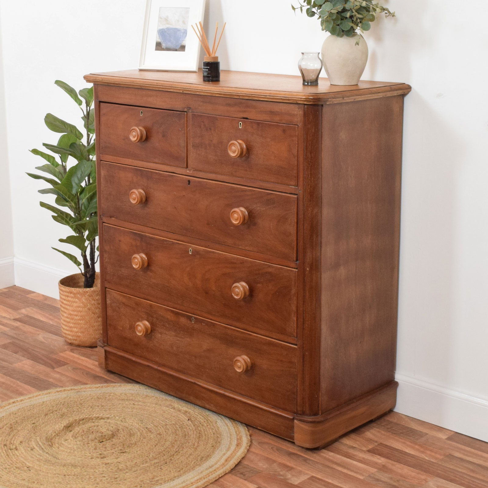 This vintage mahogany chest features five drawers, including two smaller upper drawers and three full-width graduating drawers beneath, offering generous and versatile storage. Rounded corners, turned wooden knobs, and subtle keyhole detailing add to the traditional appeal. The wood grain is attractively visible throughout, enhanced by the natural tones of the stripped finish. Its proportions and understated style make it ideal for both bedrooms and living areas.