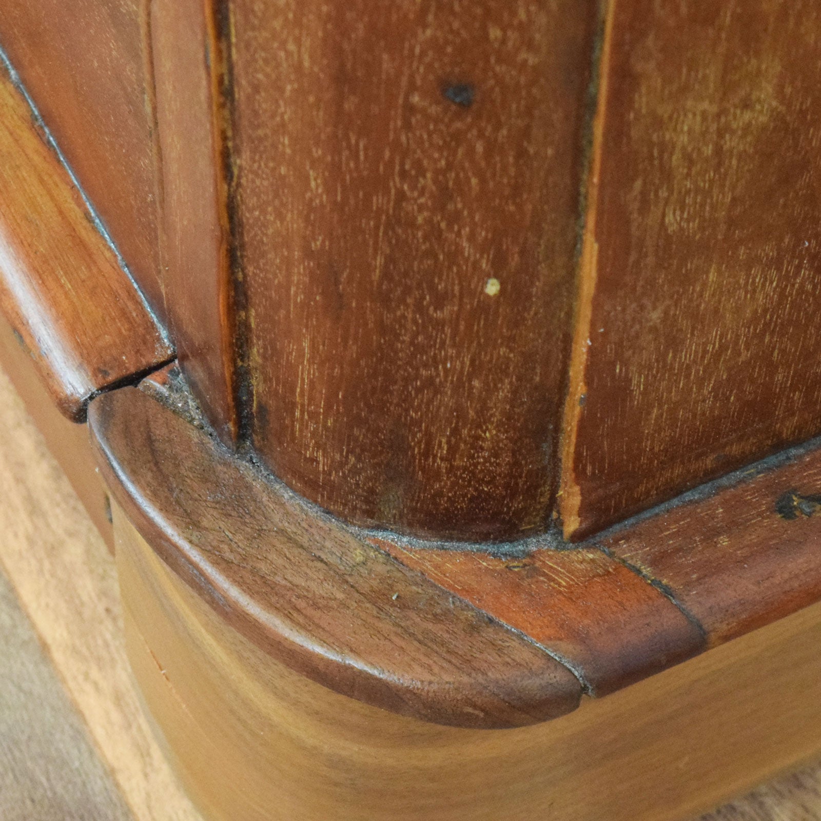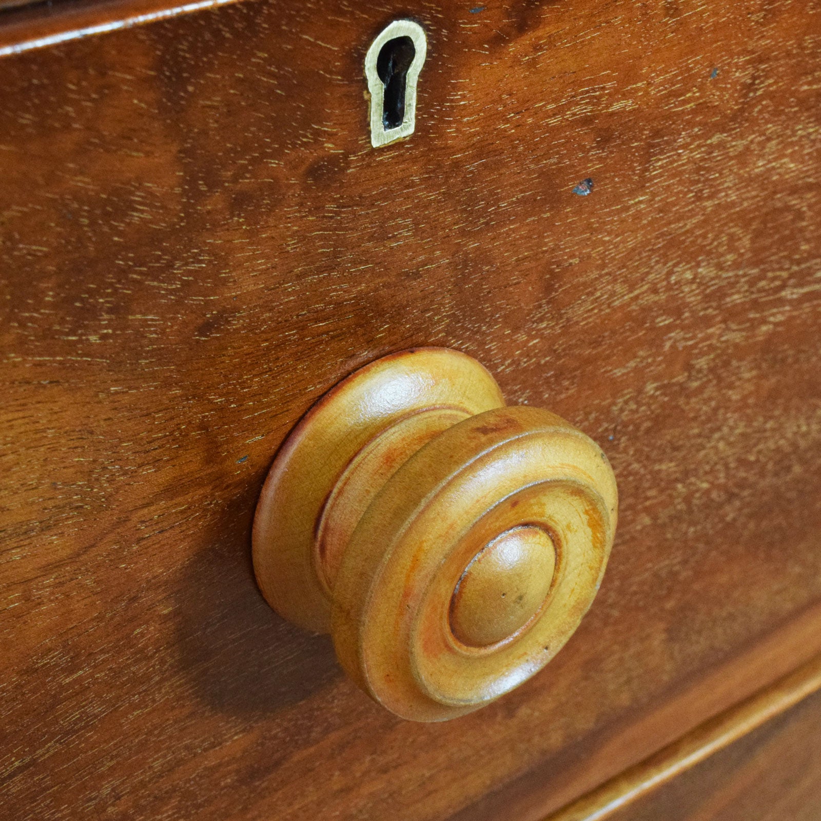 The piece has been carefully restored. The previous darker stain has been stripped, and then multiple coats of hard-wearing matte lacquer have been applied, providing a durable, long-lasting finish, while also accentuating the rich tones of the mahogany grain. The internal drawer structure has been completely replaced, ensuring reliable functionality for daily use. A section of trim has been handmade and fitted around the skirt of the chest, and veneer has been added to the base of each side to achieve a more finished look. On the top surface, there are shallow markings—scratched in by a previous owner—which add to the rustic, well-loved character of the piece. This chest of drawers is made from mahogany and pine, covered in mahogany veneer.