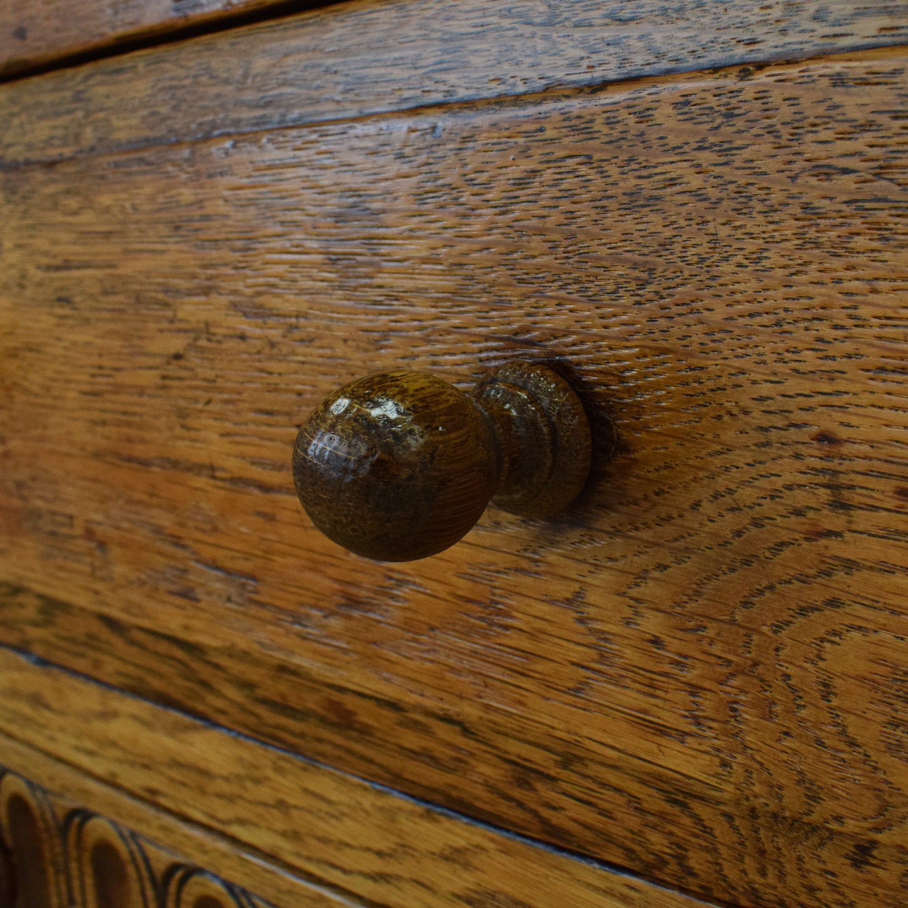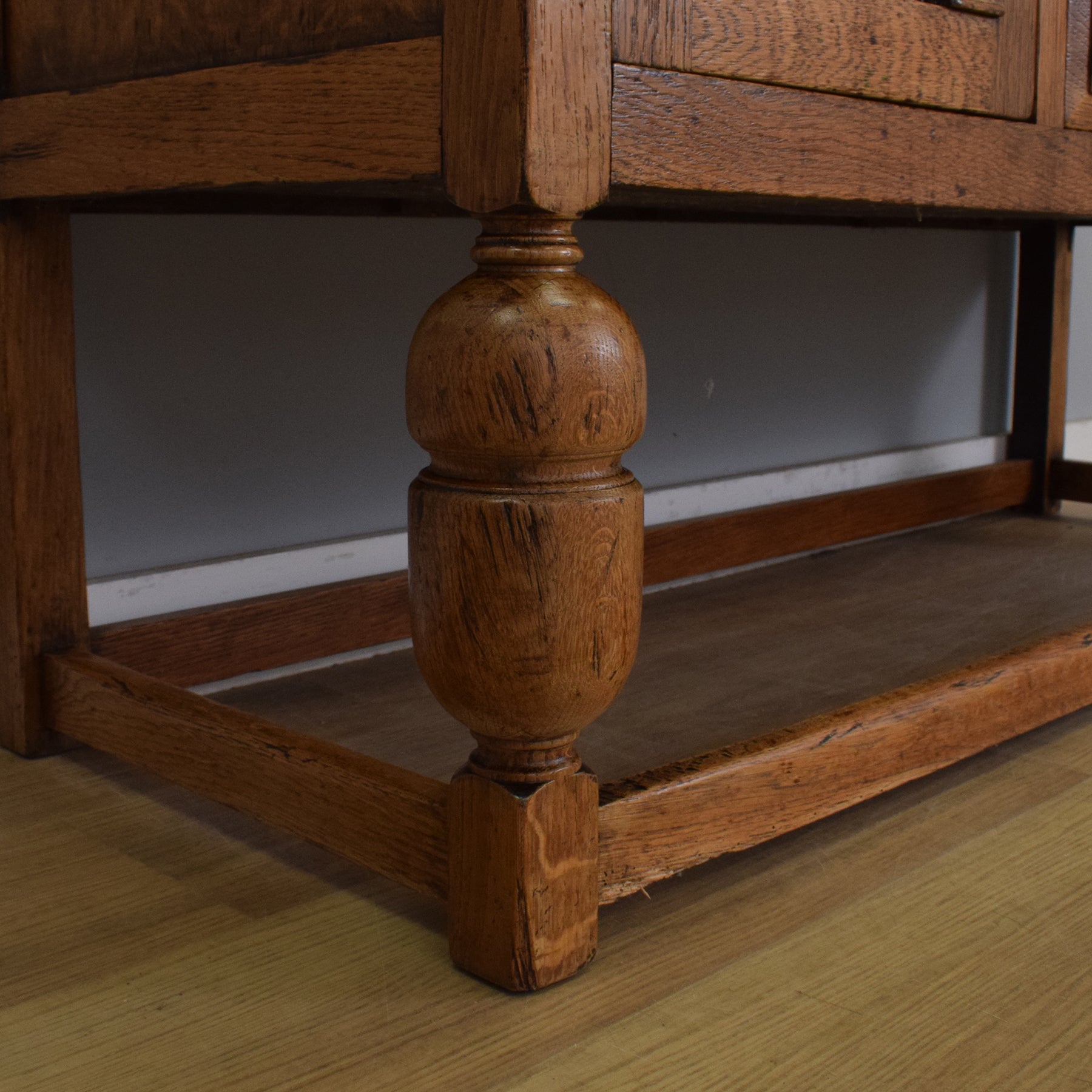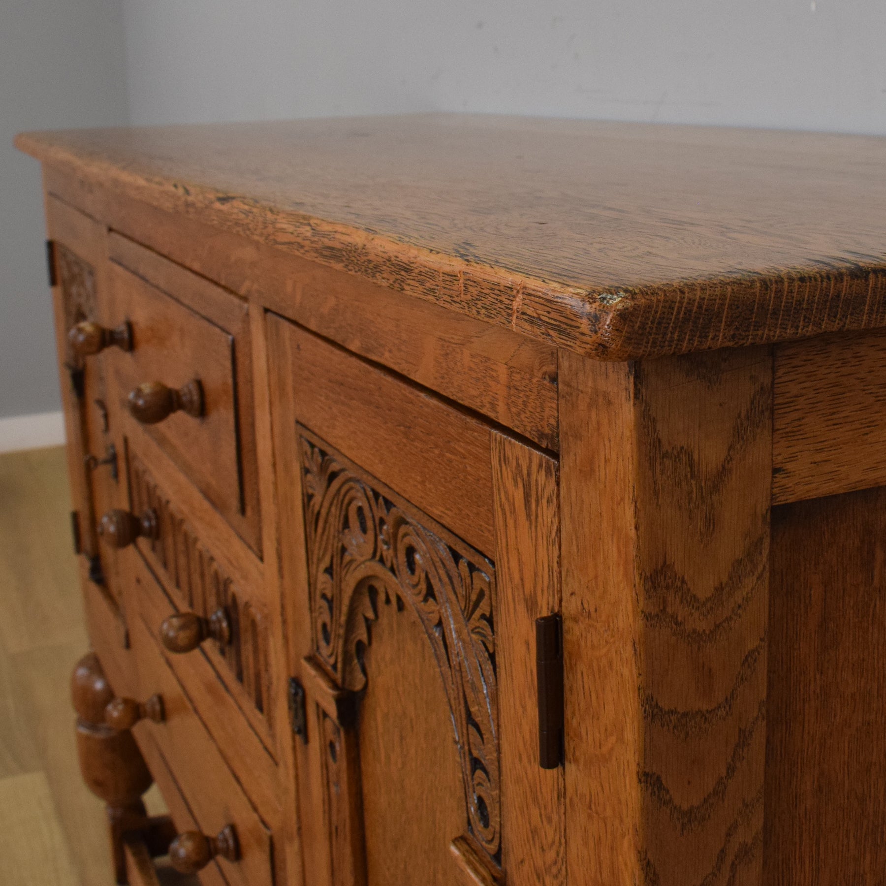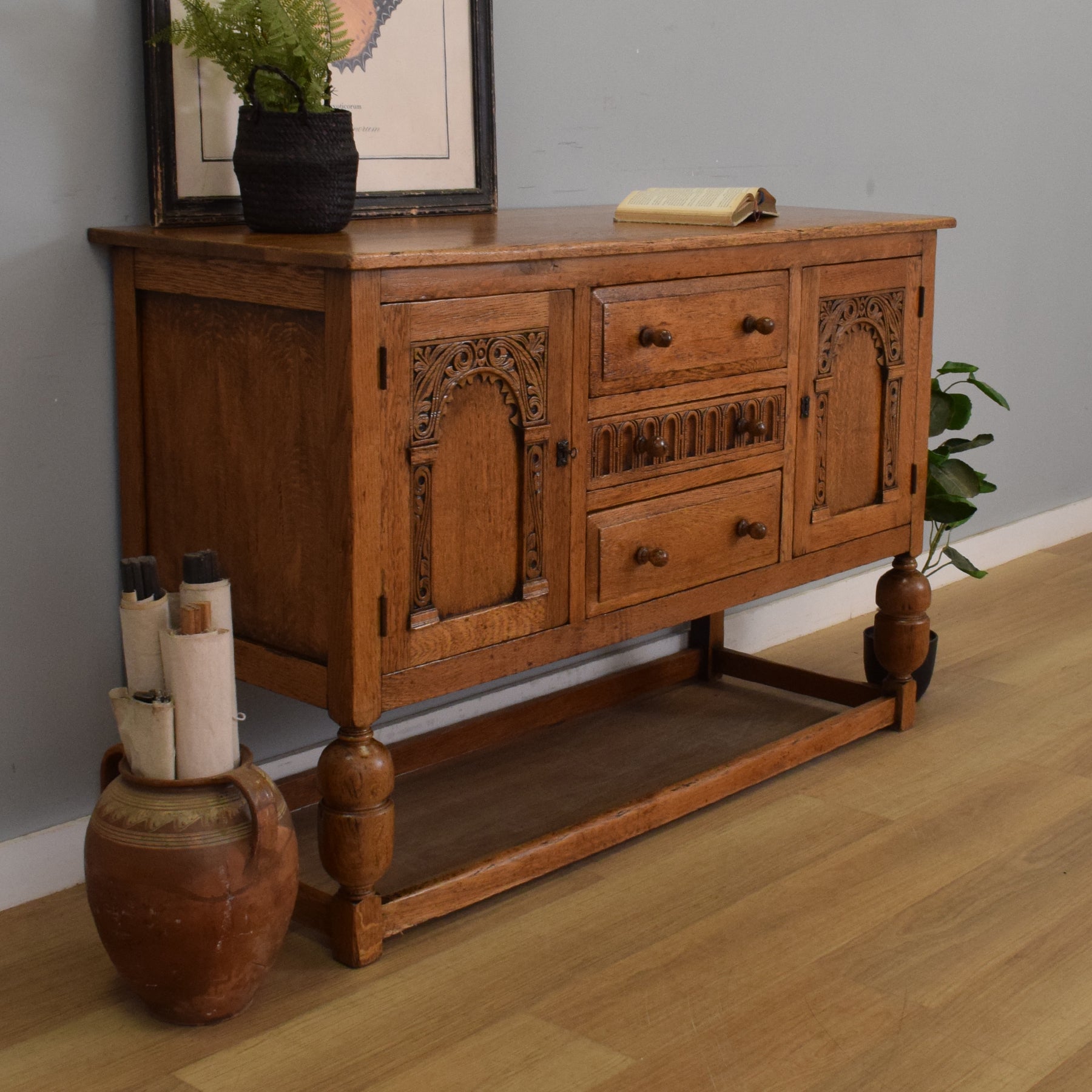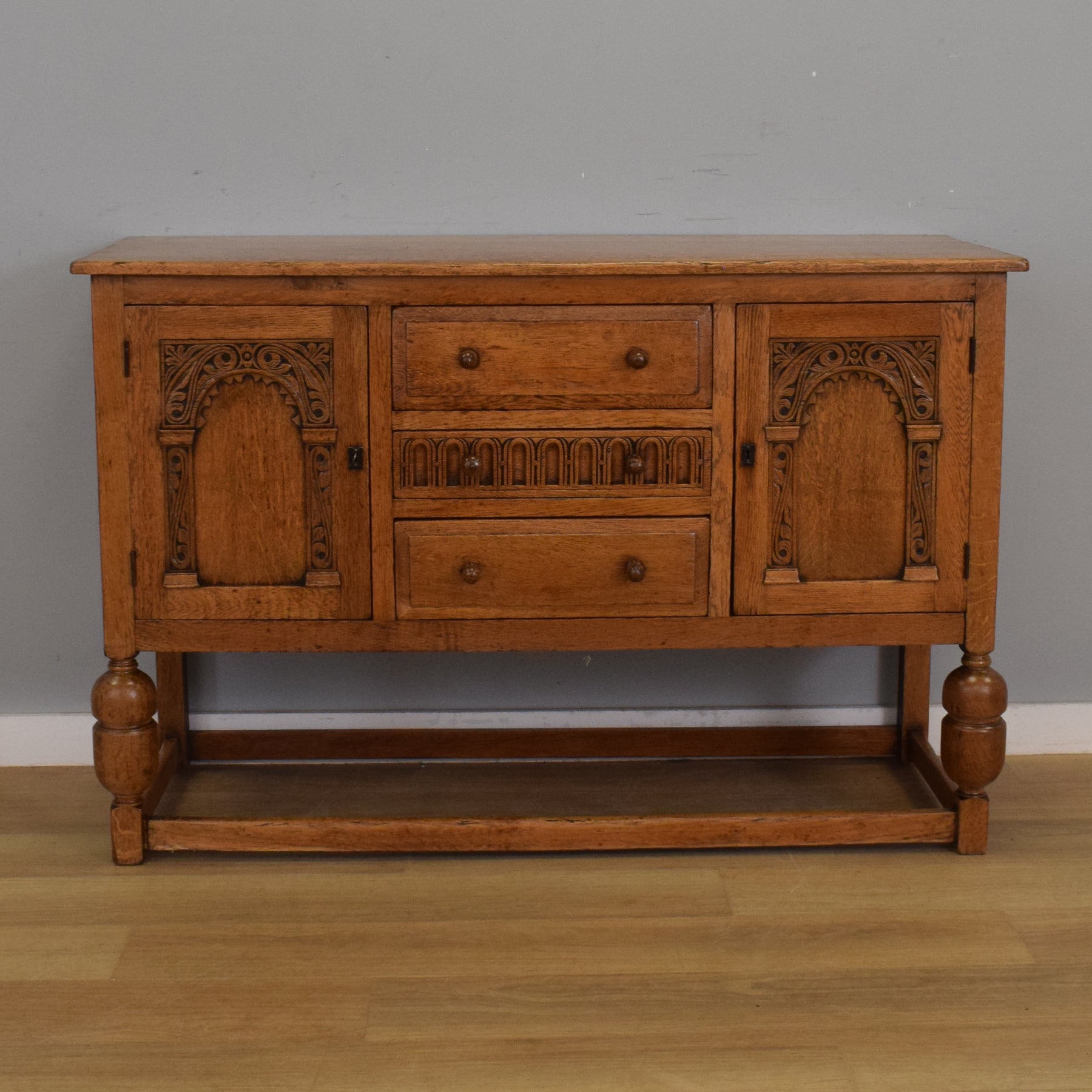 With its generous storage and distinctive carved details, this sideboard offers a practical statement piece that brings authentic character to the home. It is a strong choice for anyone seeking traditional oak furniture with a naturally timeworn look.