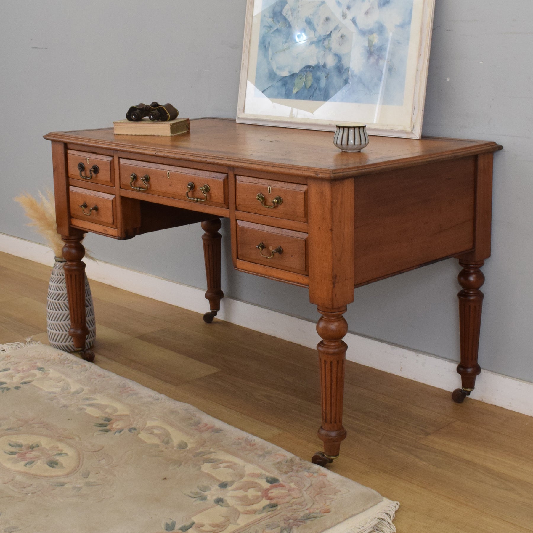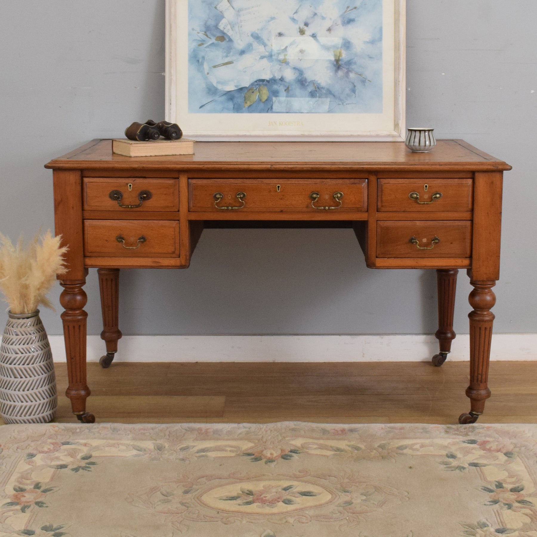 The desk features a traditional arrangement of five drawers, with a wide central drawer flanked by two smaller drawers on either side. Each sits on finely turned and fluted legs with brass castors, lending a hint of formality to the otherwise relaxed design. The surface has been left in its natural rustic state, showing the warm grain of the solid oak with rich colour variation and timeworn character. The drawers are fitted with a mix of aged brass handles, adding to the desk’s eclectic and lived-in aesthetic.