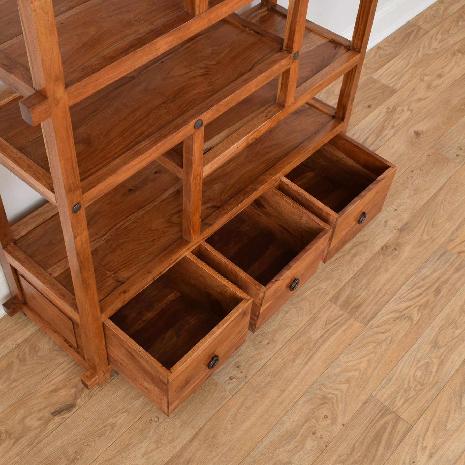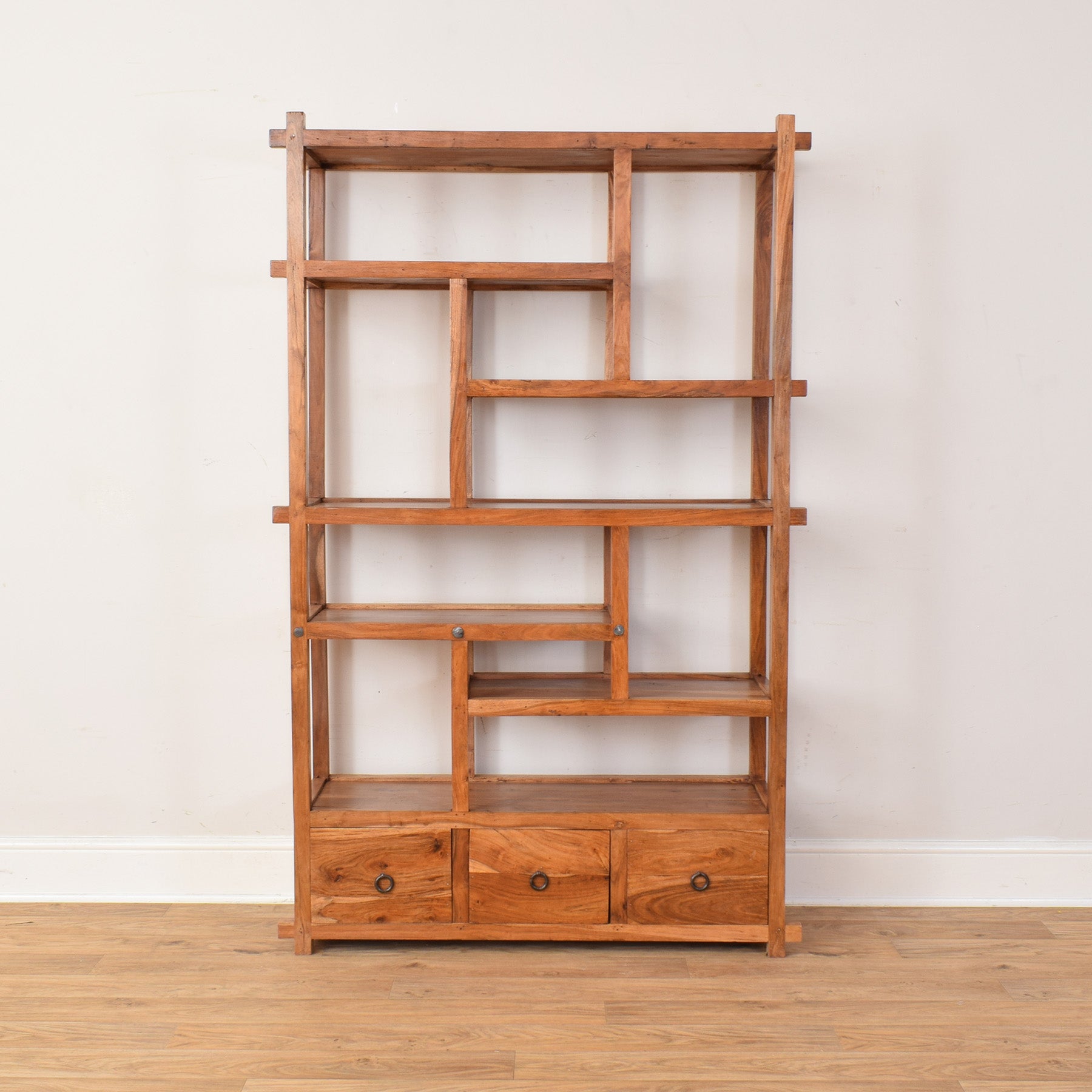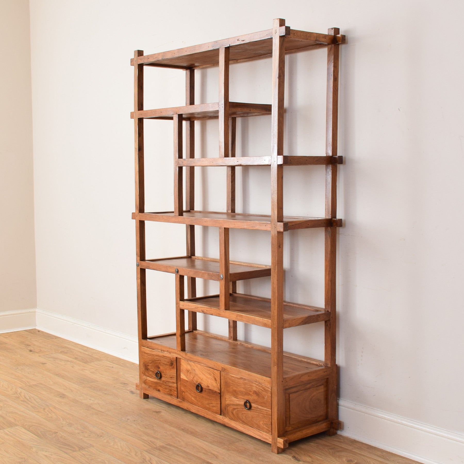 The unit features a striking, asymmetrical shelving layout that adds visual interest while providing flexibility for books, decorative items, or personal collections. Three drawers along the base offer useful concealed storage, helping to keep everyday items neatly out of sight. The natural grain and rich tone of the sheesham give the piece a strong yet welcoming presence, allowing it to work equally well as a display unit or a bookcase.