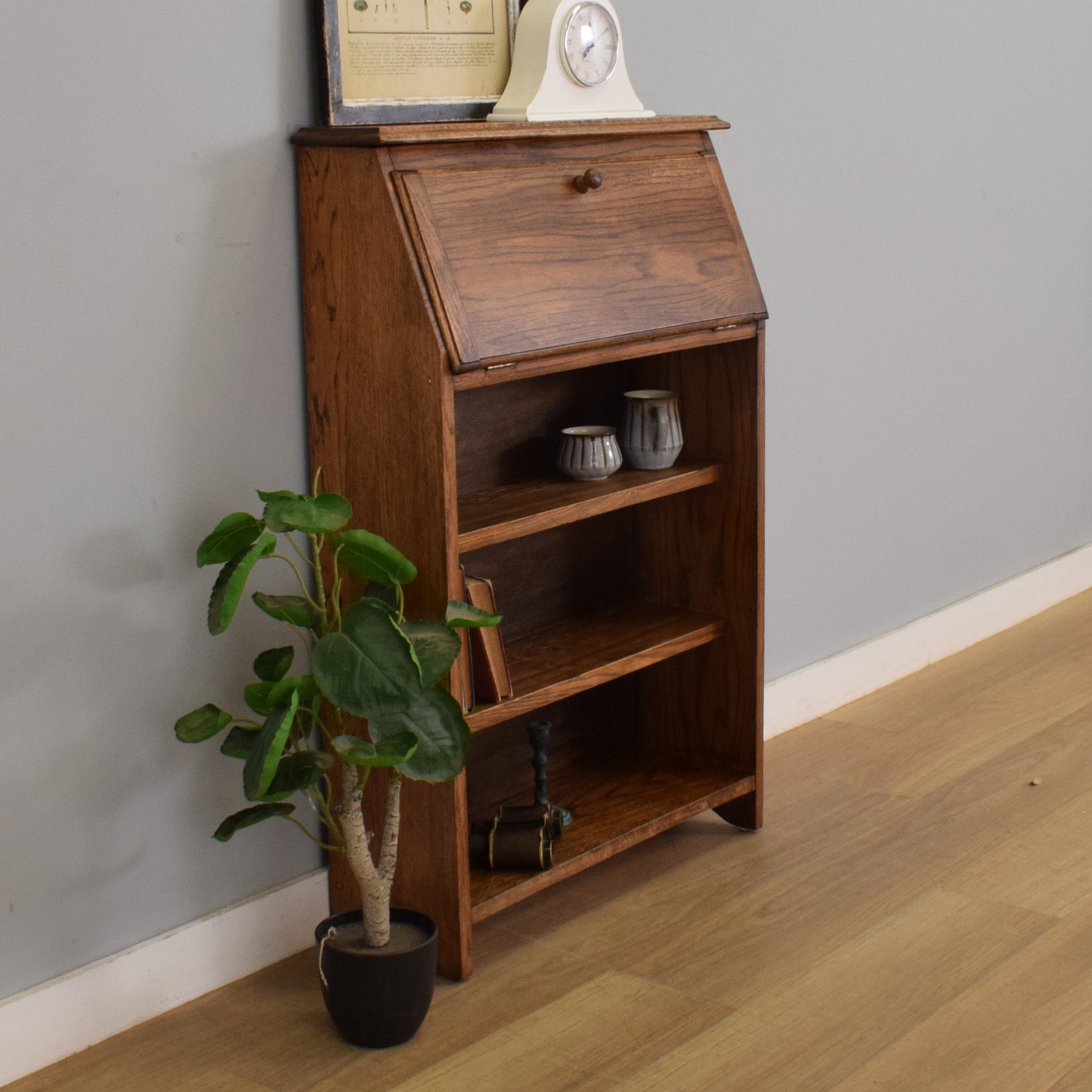 This neat, narrow bureau features a classic drop-down front which opens to reveal a writing or laptop space, while three fixed shelves below provide ample storage for books, papers, or decorative items. The original lock has been made redundant and replaced with a simple turned wooden handle for ease of access and a more relaxed, functional look.