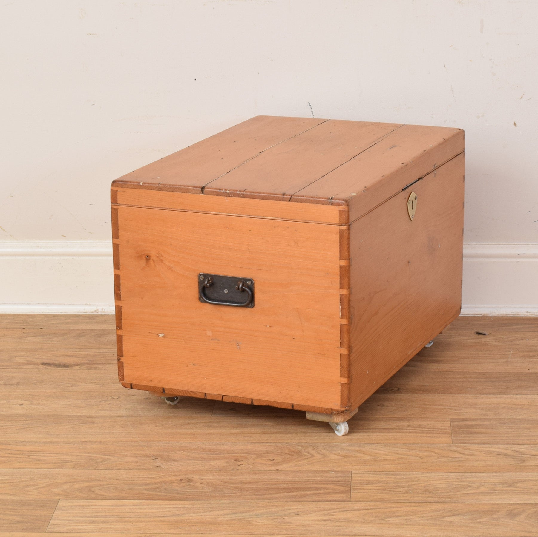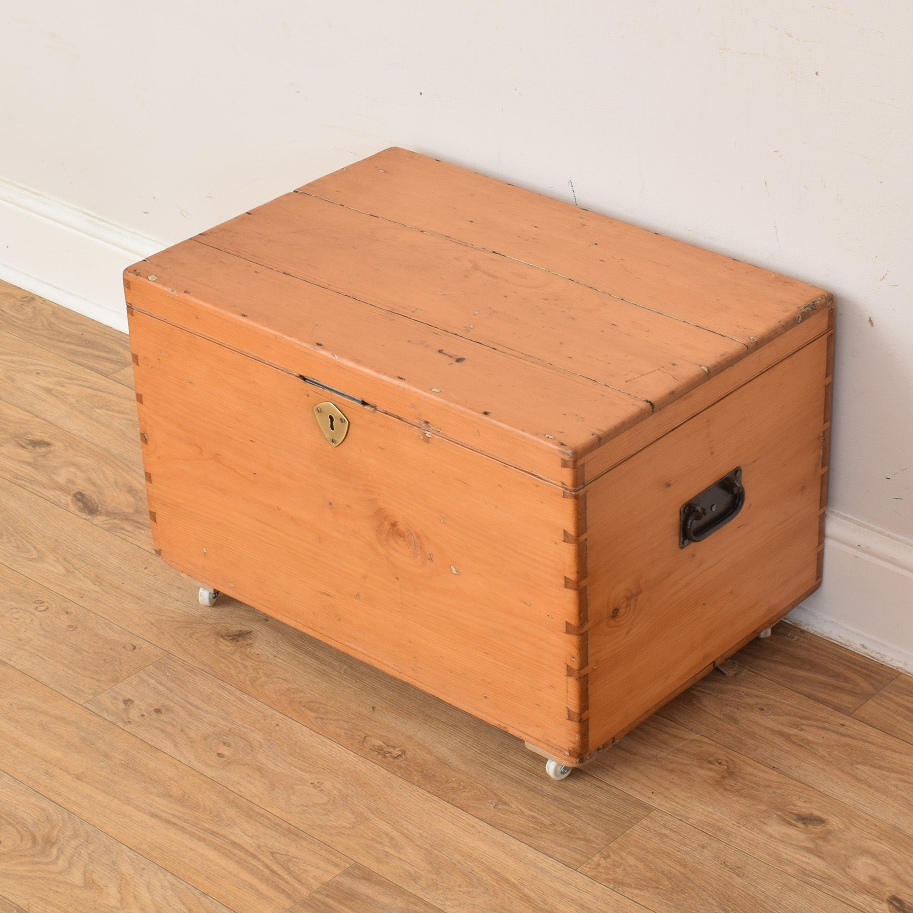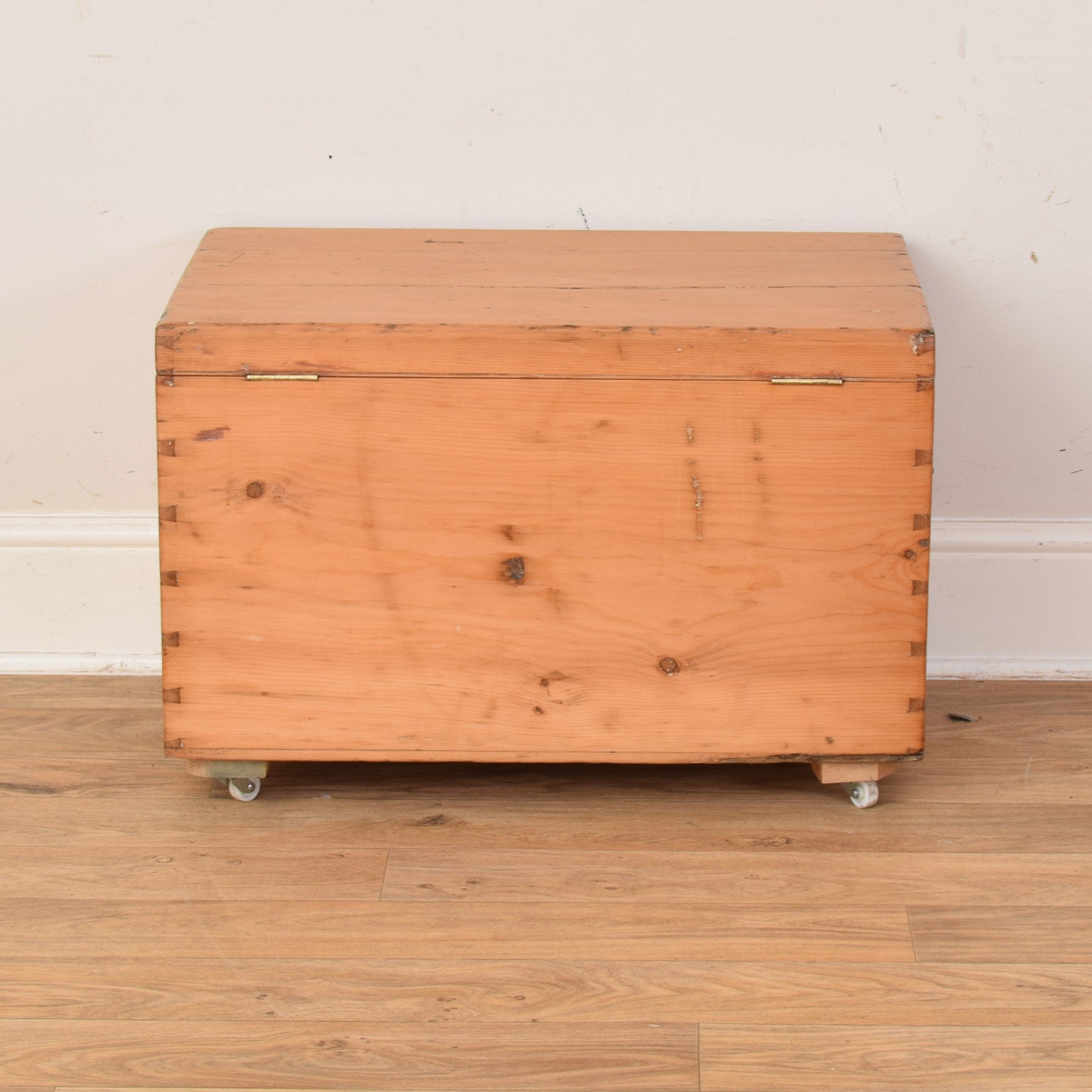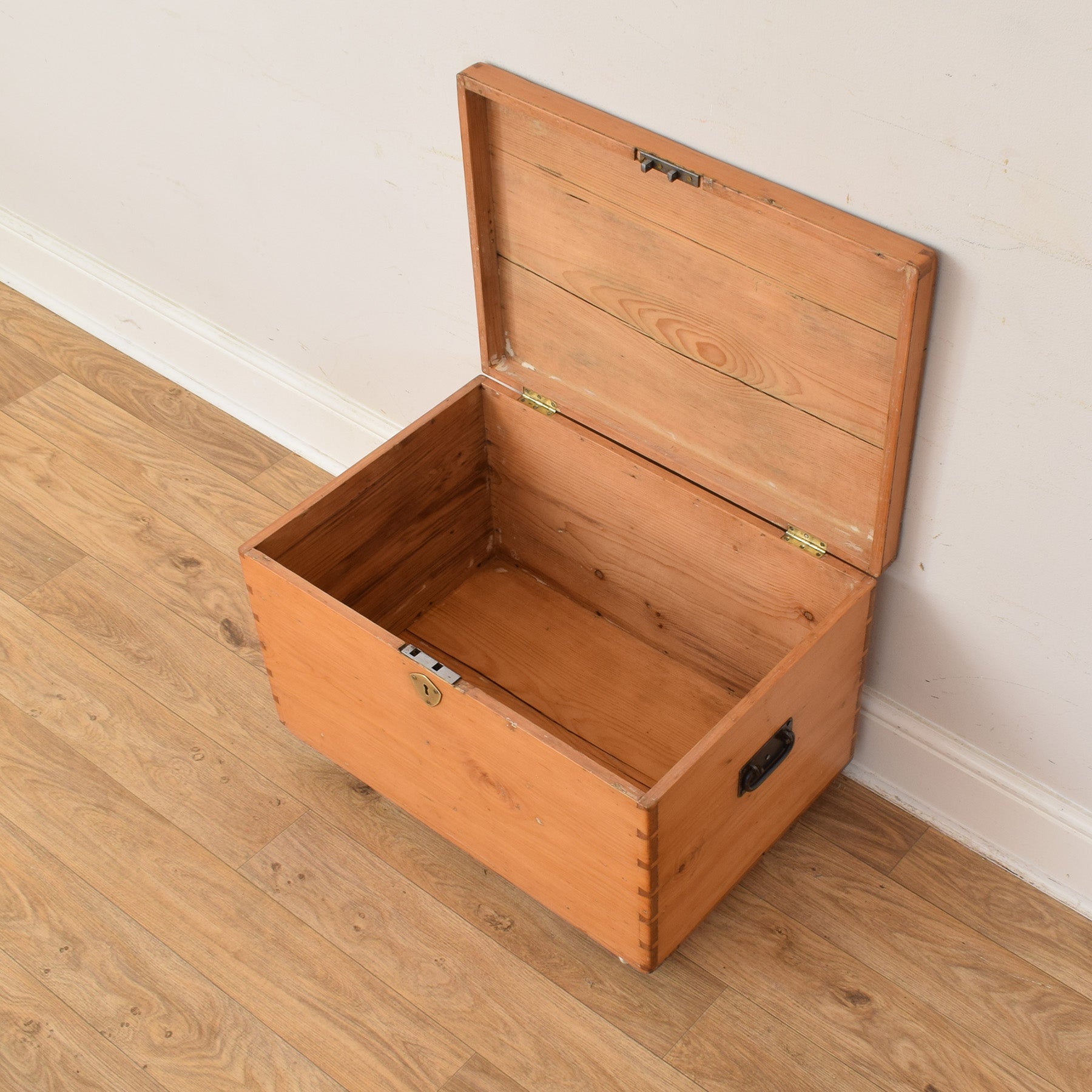 The chest features a sturdy rectangular shape with a hinged lid, traditional dovetail jointing to the corners, and original-style metal handles to the sides. The visible pine grain and natural colour highlight the honest, utilitarian design typical of antique storage chests. Its solid construction makes it ideal for storing blankets, linens, toys, or general household items.