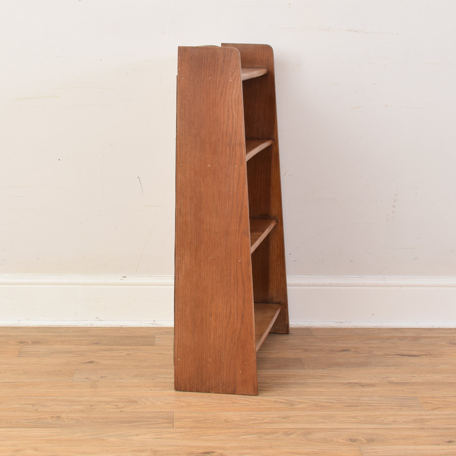This small bookcase features four fixed shelves, each framed by gently rounded side edges and a subtle curved top rail. The warm tone of the oak veneer highlights a natural grain pattern that gives the piece a welcoming, lived-in appeal. Its modest size makes it suitable for books, ornaments, or everyday items that benefit from being kept within easy reach.
