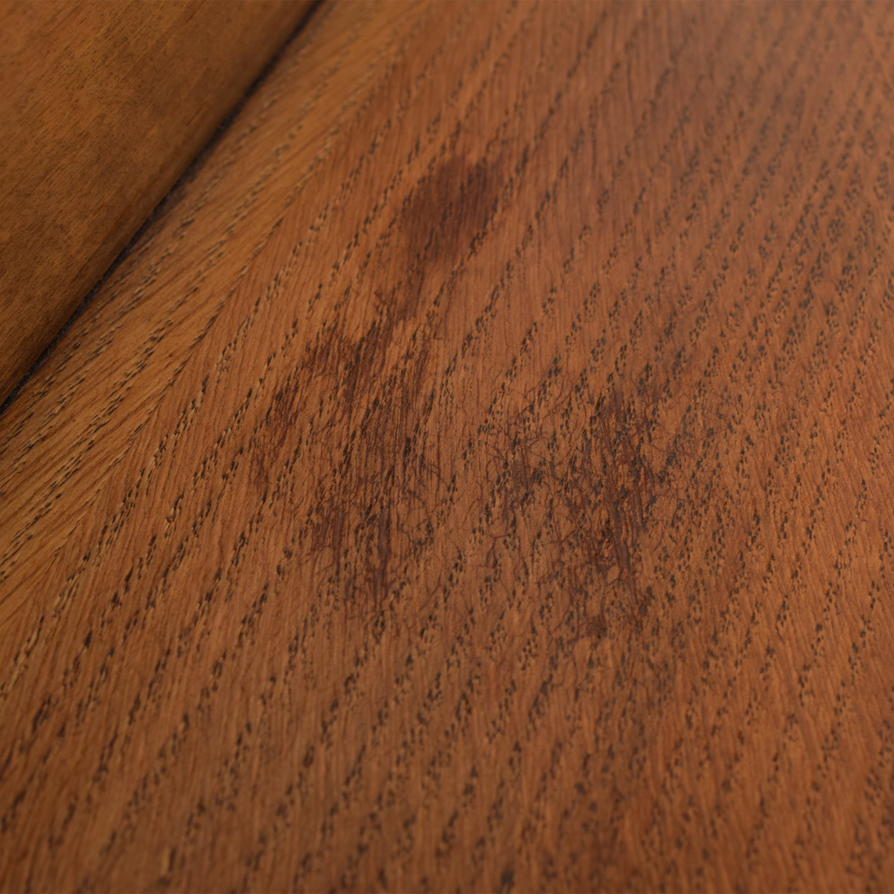 The piece has been fully stripped of its previous darker stain, then finished with multiple coats of hard-wearing matte lacquer to create a durable surface while bringing out the natural character of the oak veneer. As visible in the photographs, there are some darker marks on the top shelf and a small area of missing veneer. This item is made from compressed material covered with an oak veneer, and the rear panel is constructed from plywood.