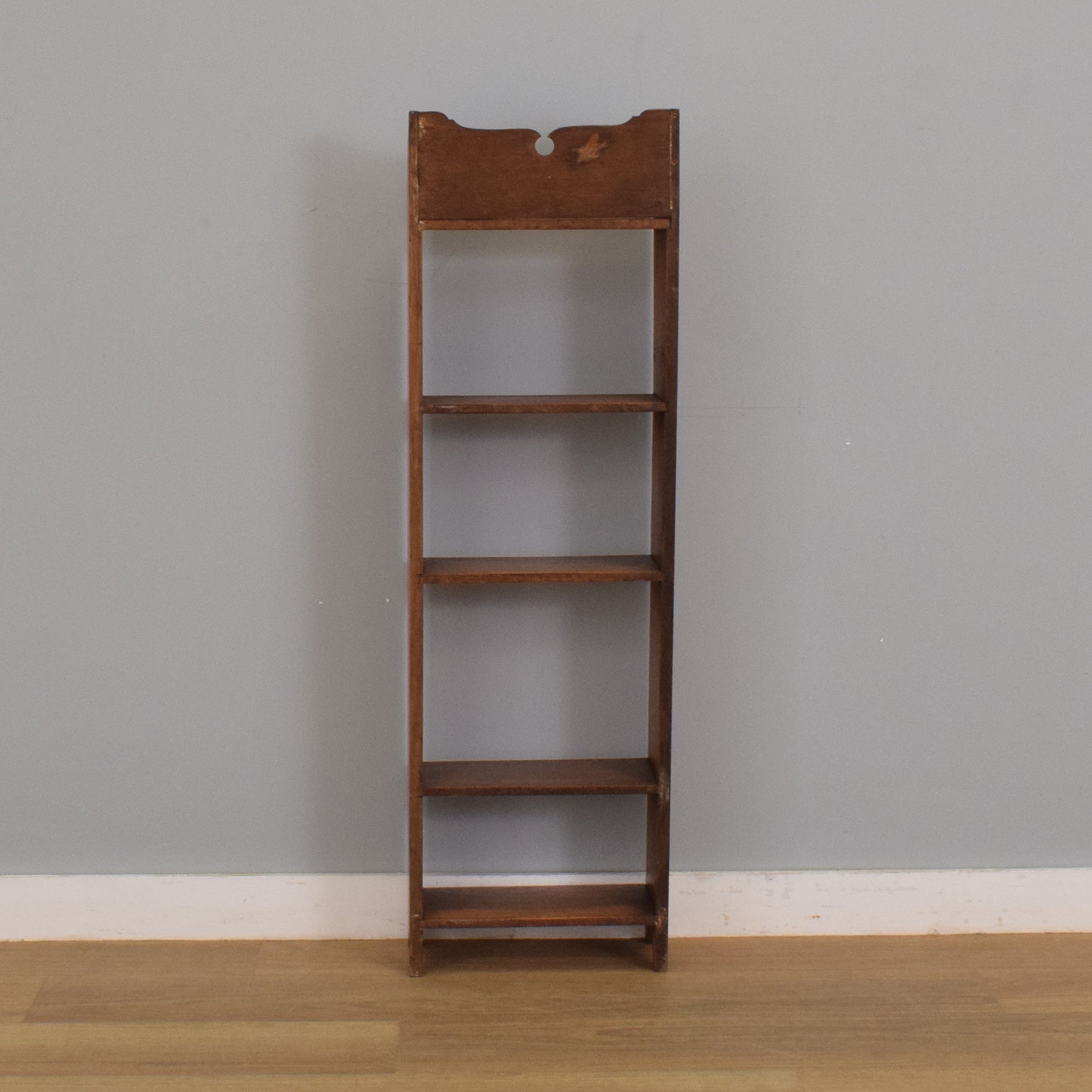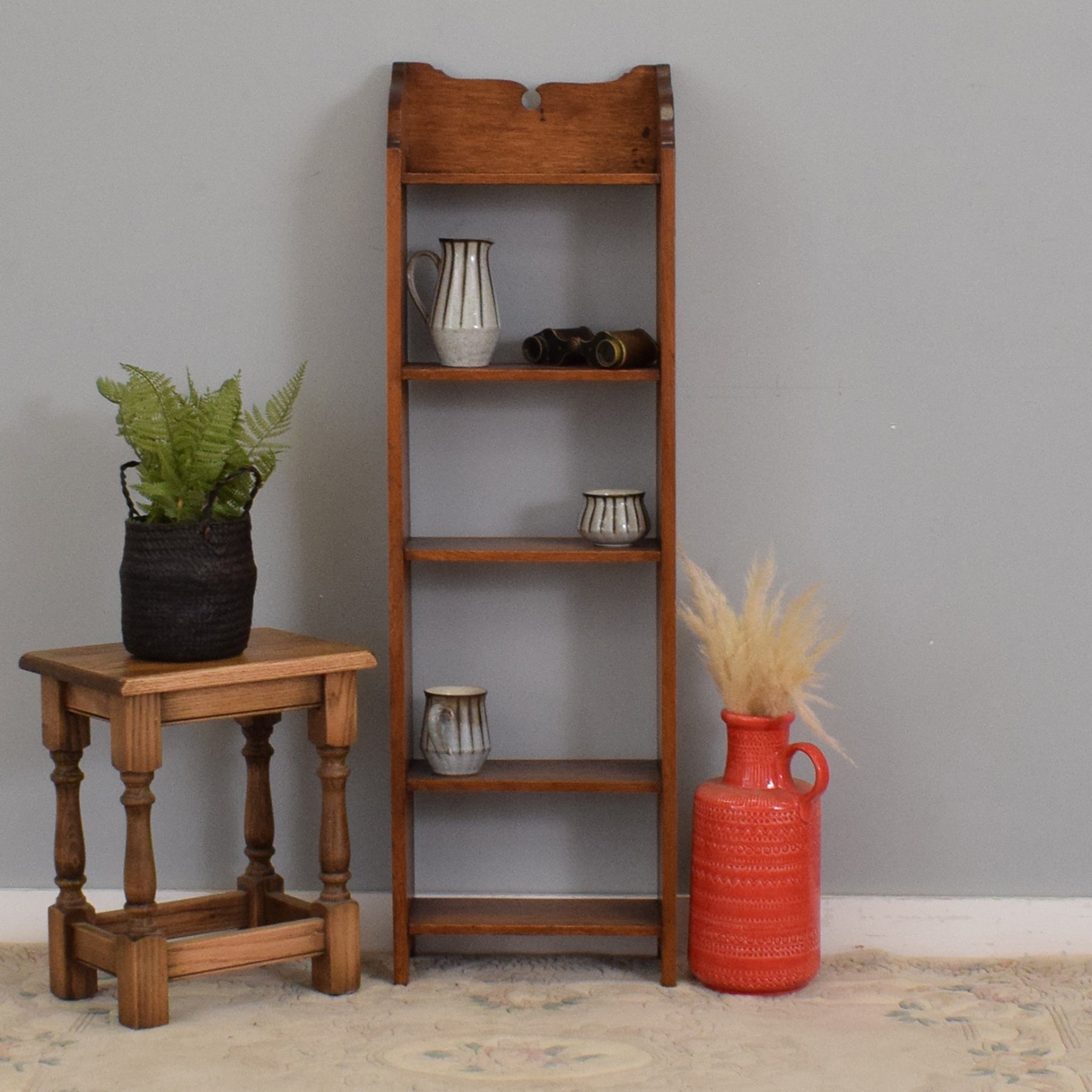 This piece features five fixed shelves within a narrow upright frame, topped with a shaped gallery rail that adds a decorative touch. The simple design is complemented by subtle arched cut-outs at the feet and a small central notch in the top rail, originally intended for wall mounting. The proportions are well-suited for storing smaller volumes, collectables, or display items in a vertical layout.